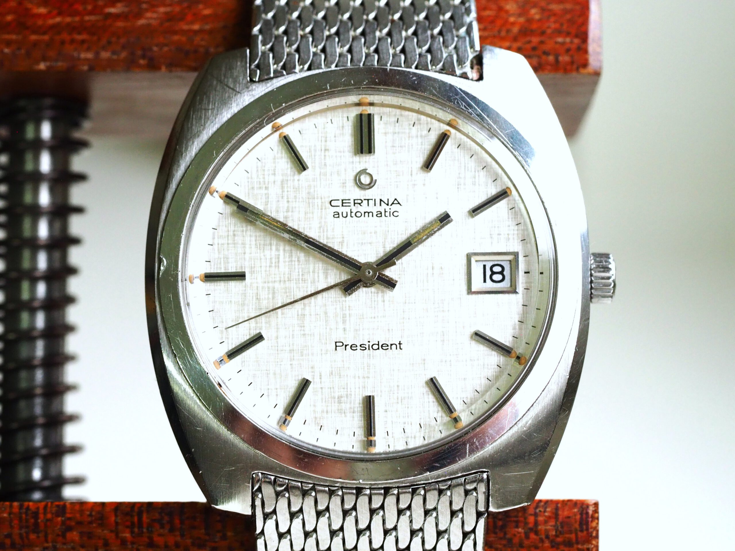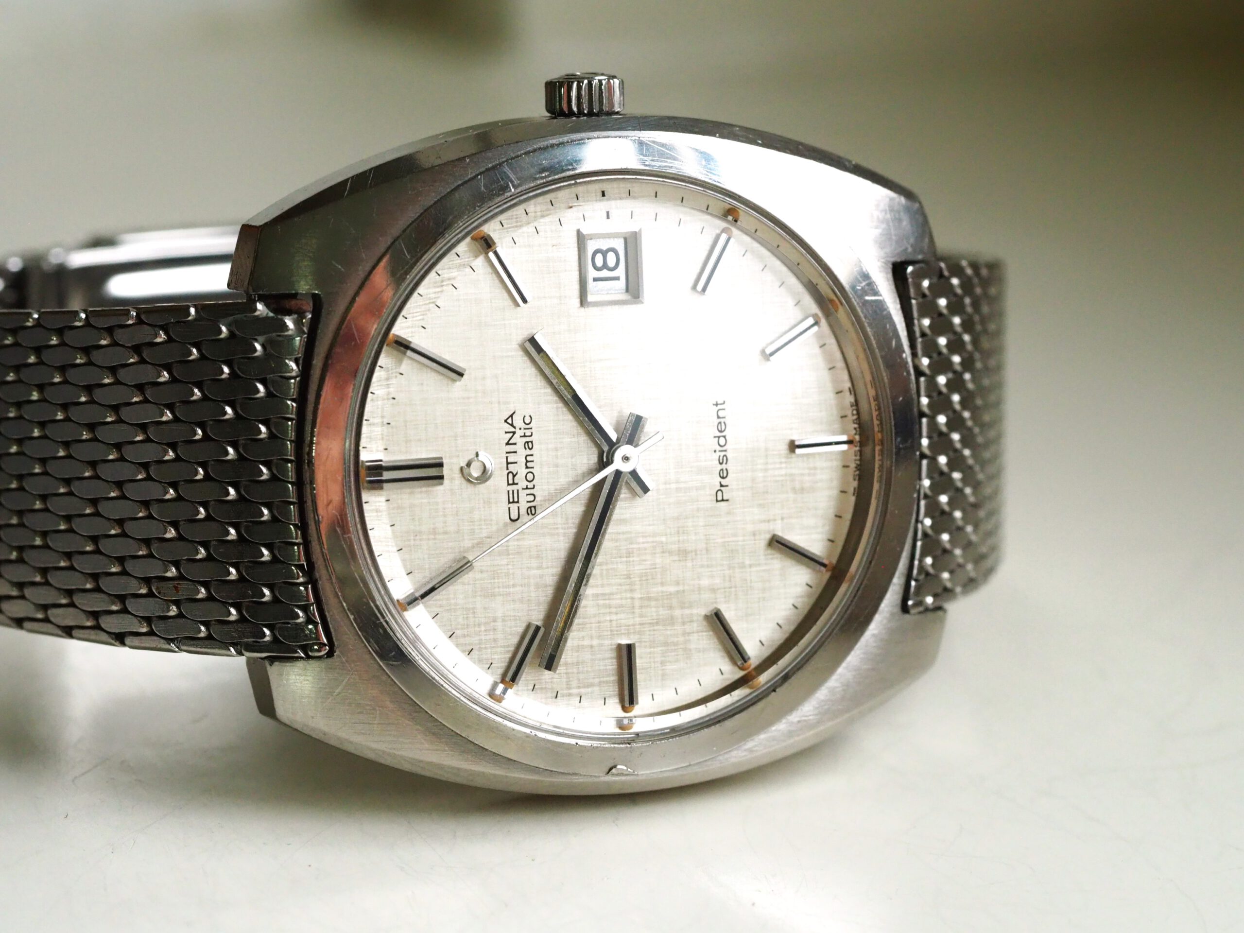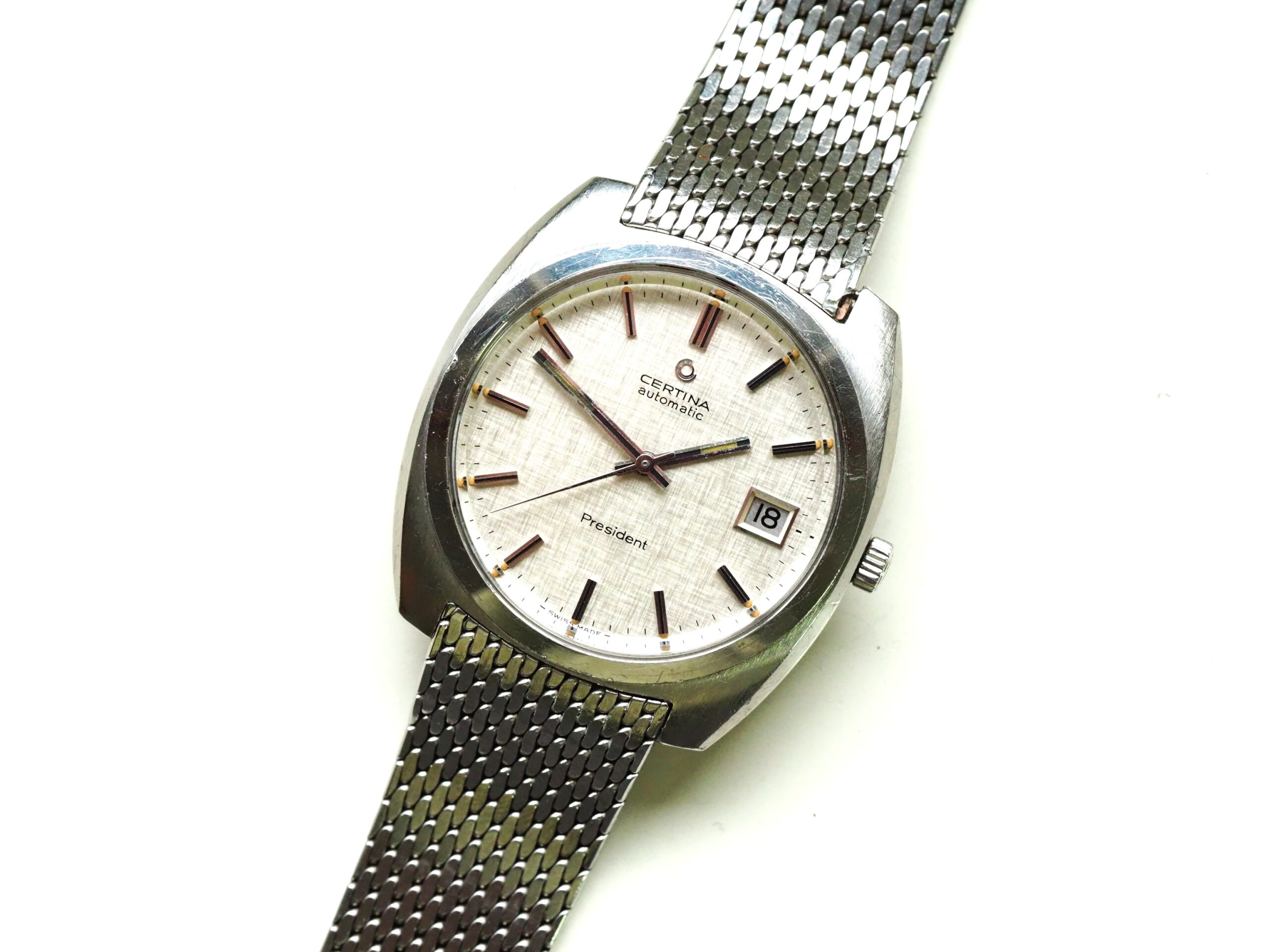 Referentie 5801 183 Certina President Automatic, serienummer 8470547 productiejaar 1970. Prachtige en zeldzame vintage Certina in uitstekende originele staat met een stalen kast/band en volledig geserviced uurwerk. Het horloge heeft een fraaie linnen wijzerplaat met tritium lumen en zwarte accenten. Een prachtig exemplaar in uitstekende staat voor een ongepolijst horloge van meer dan 55 jaar oud. In de kast vinden we een Certina 25-651 automatisch uurwerk met datumfunctie welke net volledig is geserviced (januari 2026) en zeer goed functioneert. Tijdens deze service zijn tevens de kast en band ultrasoon gereinigd en is de kast voorzien van een nieuw plexiglas. De stalen band is geschikt voor een polsomtrek van circa 16-18,5 cm. Een mooie kans voor iemand die op zoek is naar een bijzondere vintage Certina in prachtige originele staat! Kastdiameter 38mm zonder kroon.