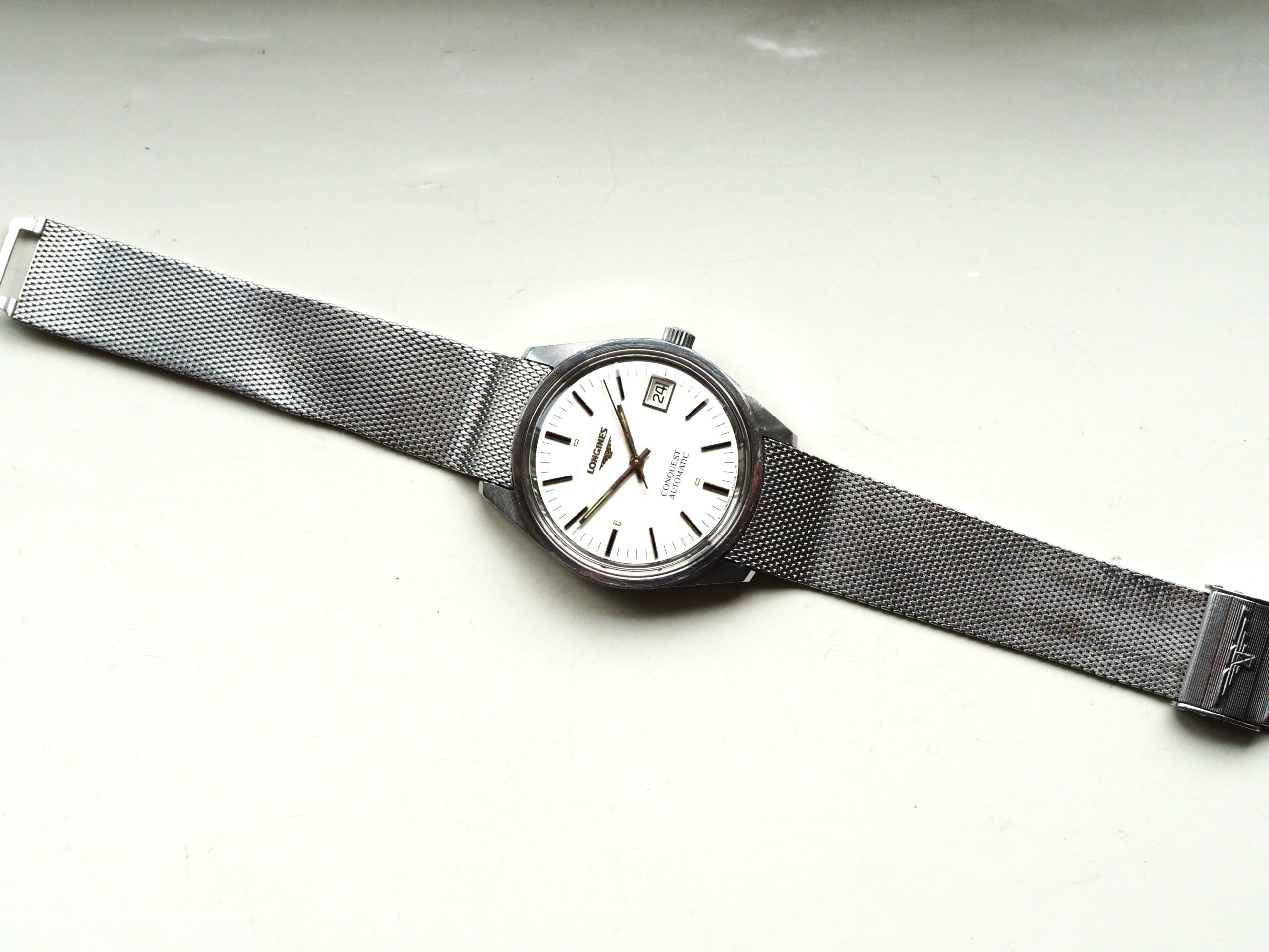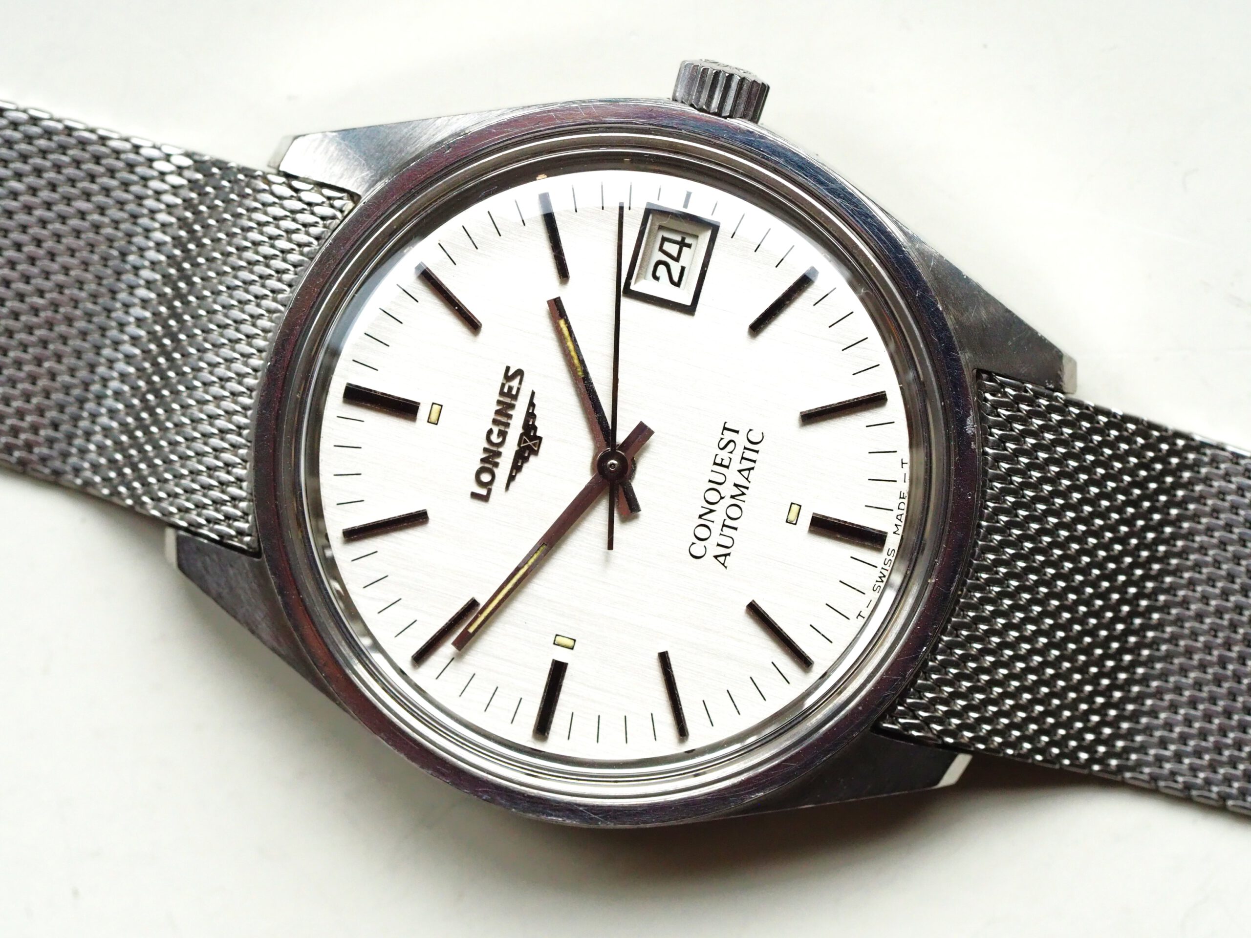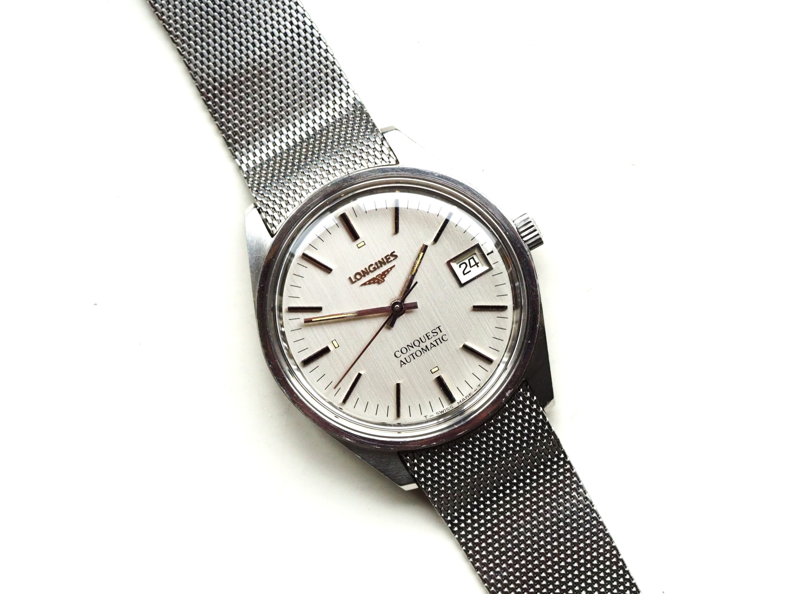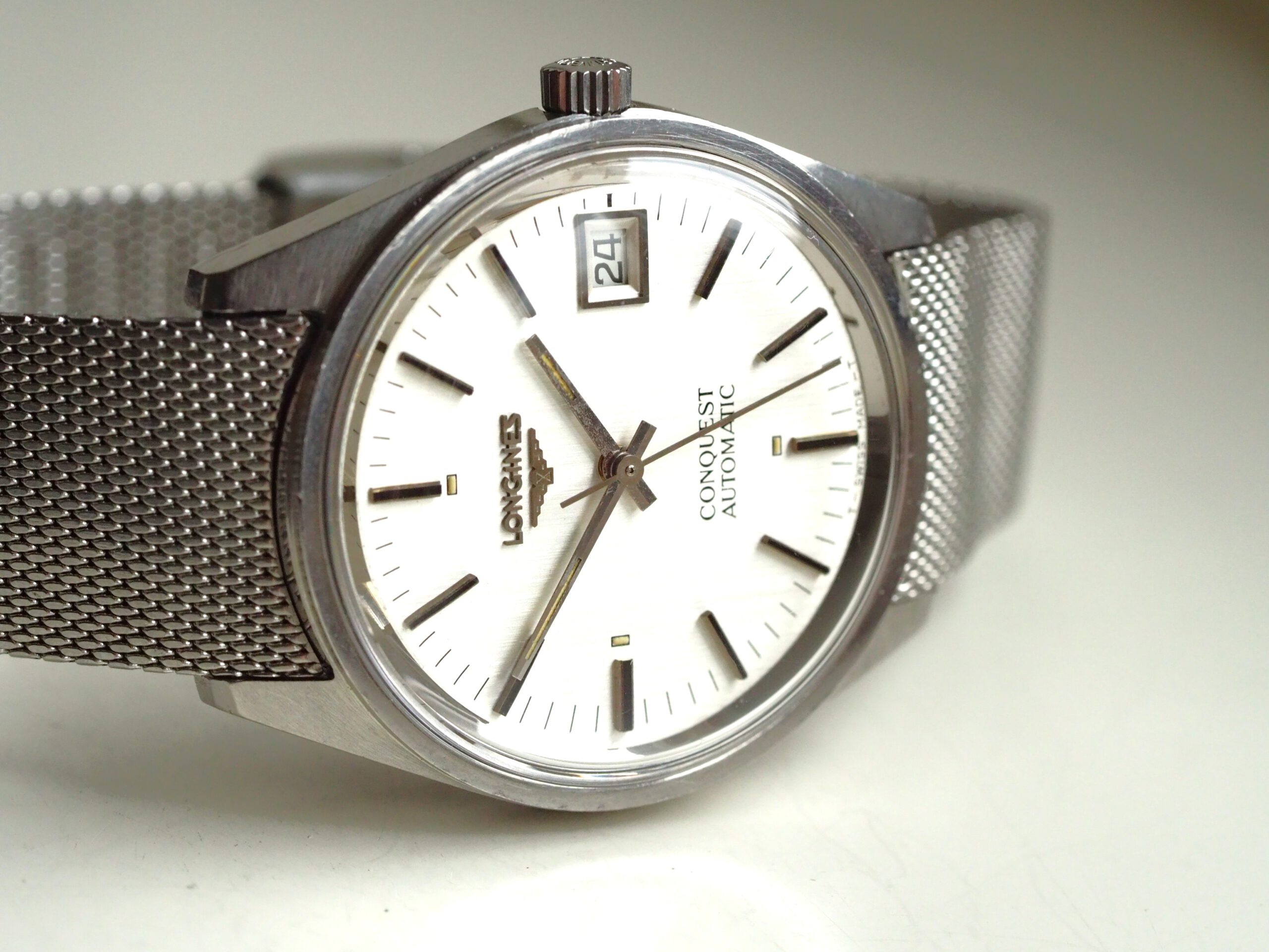 Referentie 1570 4 Longines Conquest Automatic, serienummer 52893382 (uurwerk) 17532962 (kast), productiejaar circa 1975. Prachtige vintage Longines met ongepolijste stalen kast, originele gesigneerde kroon en mesh band. Het horloge heeft een zilverkleurige geborstelde wijzerplaat met tritium lumen en zwarte accenten. In de kast vinden we een Longines L633.1 (ETA2824-2) automatisch uurwerk welke net (januari 2026) volledig is geserviced en uitstekend functioneert. Tijdens deze service zijn tevens de kast en de band ultrasoon gereinigd en is de kast voorzien van een nieuw plexiglas. Kortom een fantastisch horloge in zeer goede staat, klaar voor een nieuwe eigenaar. Kastdiameter 35,5mm zonder kroon.