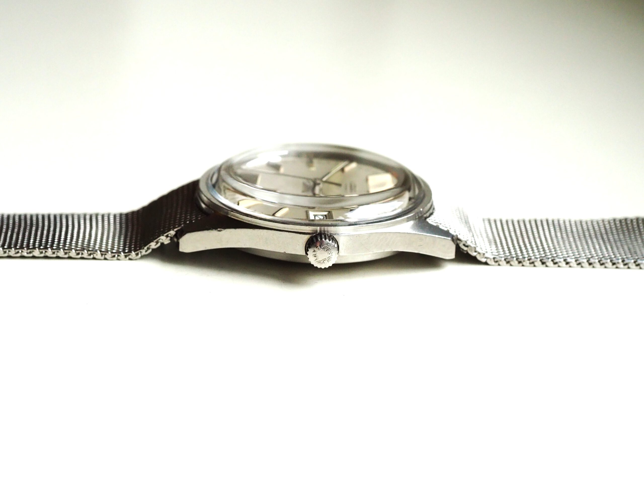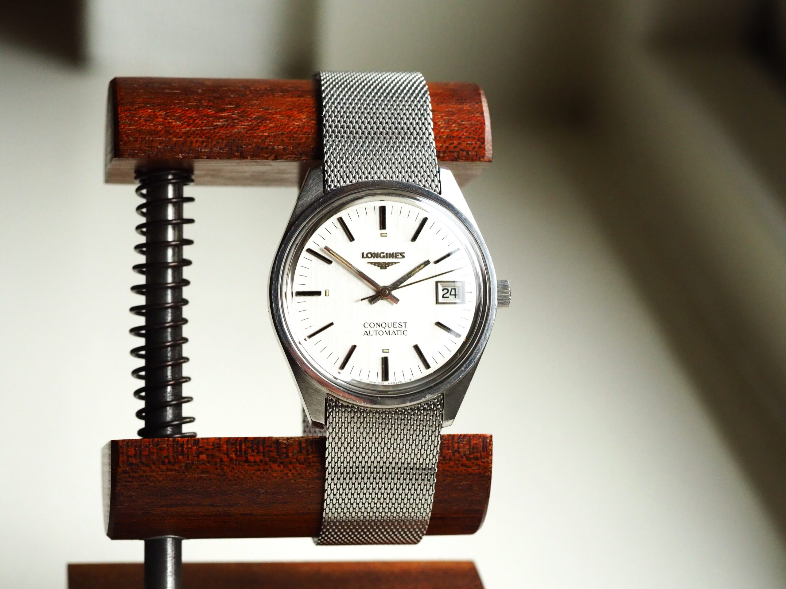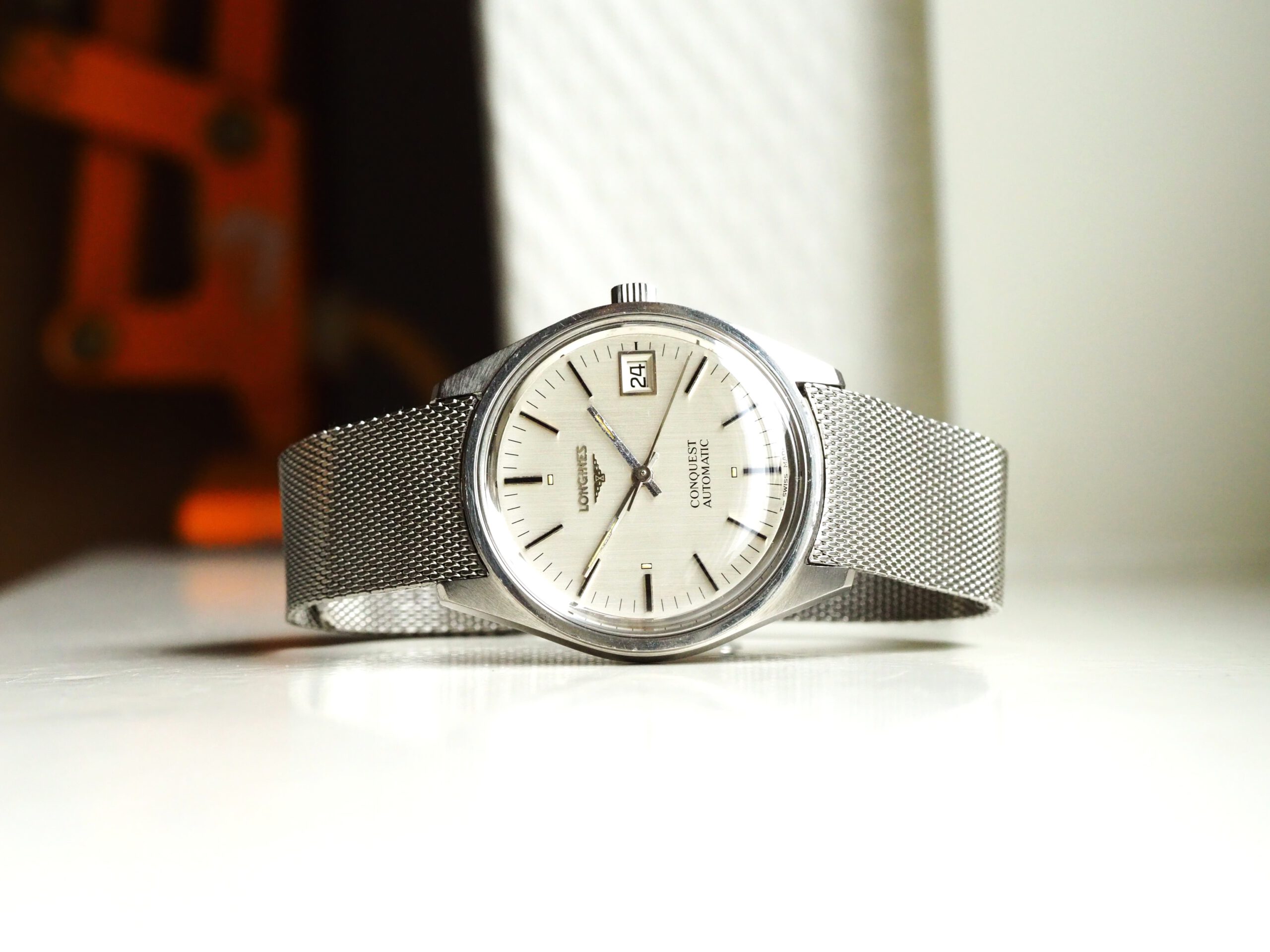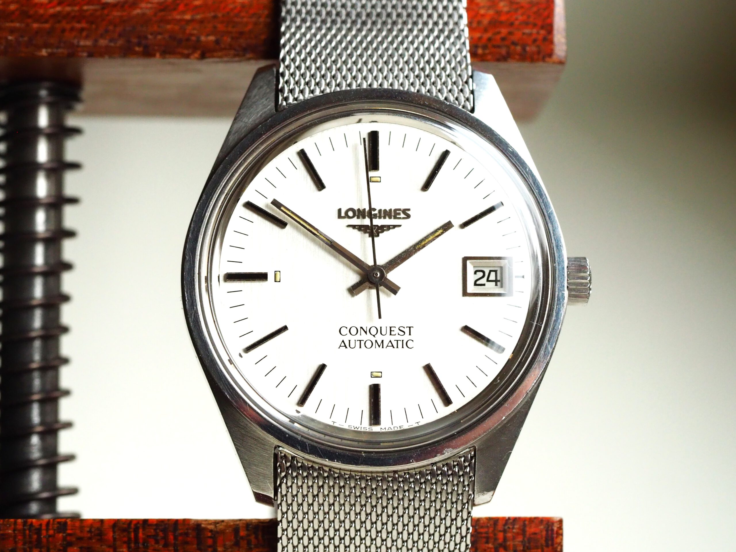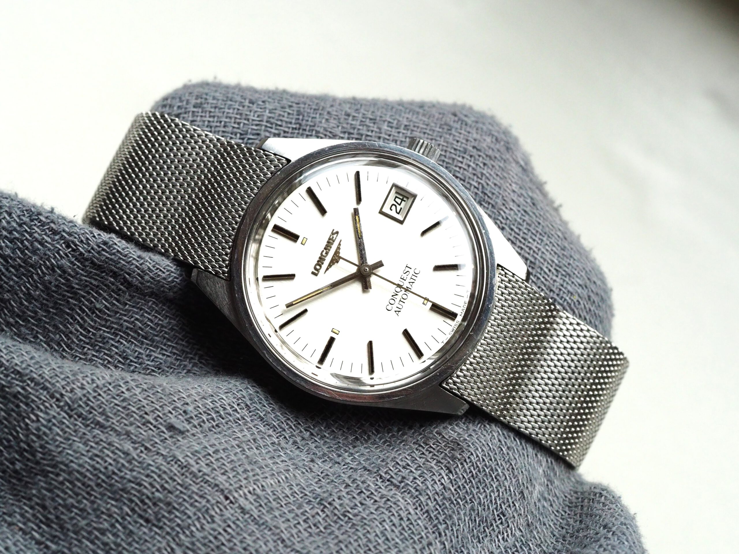 Referentie 1570 4 Longines Conquest Automatic, serienummer 52893382 (uurwerk) 17532962 (kast), productiejaar circa 1975. Prachtige vintage Longines met ongepolijste stalen kast, originele gesigneerde kroon en mesh band. Het horloge heeft een zilverkleurige geborstelde wijzerplaat met tritium lumen en zwarte accenten. In de kast vinden we een Longines L633.1 (ETA2824-2) automatisch uurwerk welke net (januari 2026) volledig is geserviced en uitstekend functioneert. Tijdens deze service zijn tevens de kast en de band ultrasoon gereinigd en is de kast voorzien van een nieuw plexiglas. Kortom een fantastisch horloge in zeer goede staat, klaar voor een nieuwe eigenaar. Kastdiameter 35,5mm zonder kroon.