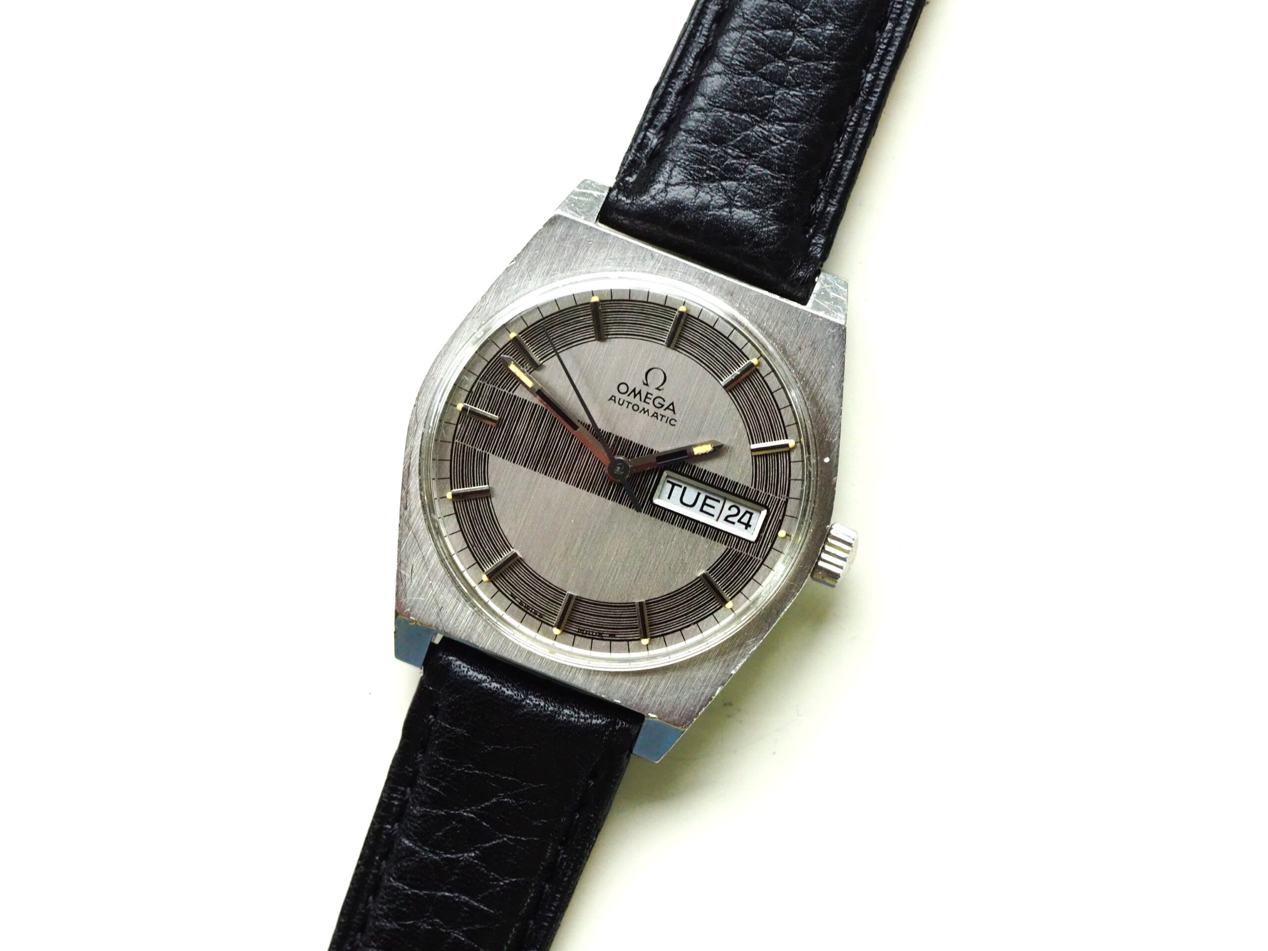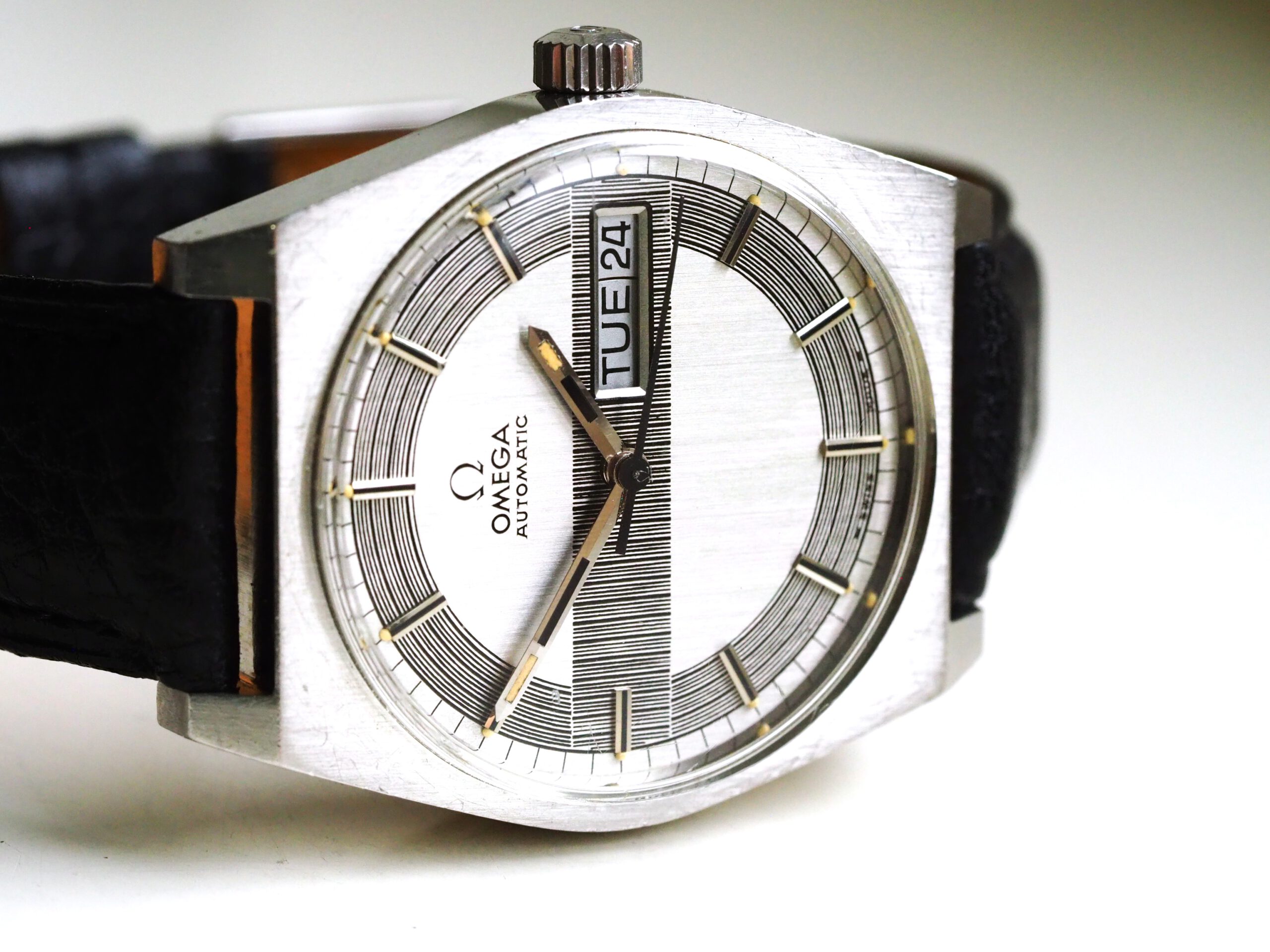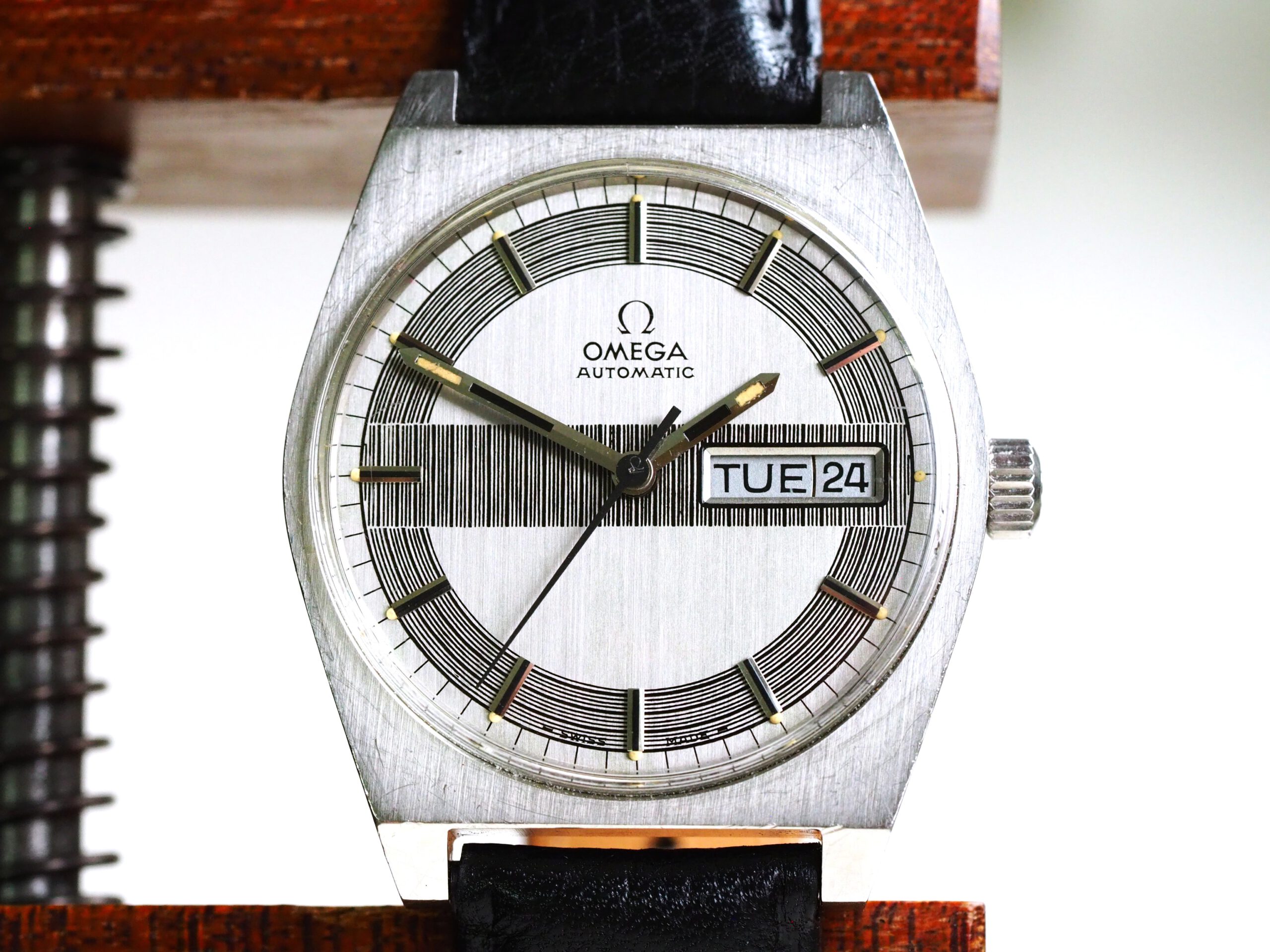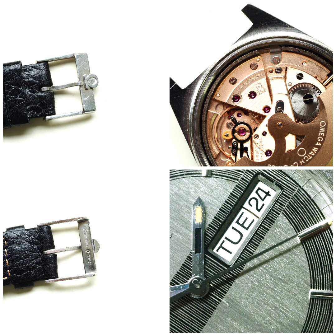 Referentie 166.0141 Omega Automatic, serienummer 31961893 productiejaar 1970. Prachtige vintage Omega met een zeldzame zogenaamde barcode (of racing) wijzerplaat met tritium lumen. Ik kocht dit horloge in volledig originele conditie, zelfs nog met de oude versleten band. Na de service heb ik het horloge voorzien van een nieuwe zwarte leren band, maar ik zal de oude originele ook zeker bij het horloge laten. In de stalen kast vinden we een Omega 752 automatisch uurwerk (datum en weekdag, quick-set voor datum) welke net volledig is geserviced (februari 2026) en goed functioneert. Over het algemeen is het horloge in goede originele staat met Omega gesigneerde kroon, plexiglas en gesp. De wijzerplaat heeft smetteloos tritium lumen, maar er is een waas/patina aan de rechterkant van de wijzerplaat die onder bepaalde omstandigheden zichtbaar is. Kastdiameter 35mm zonder kroon.
