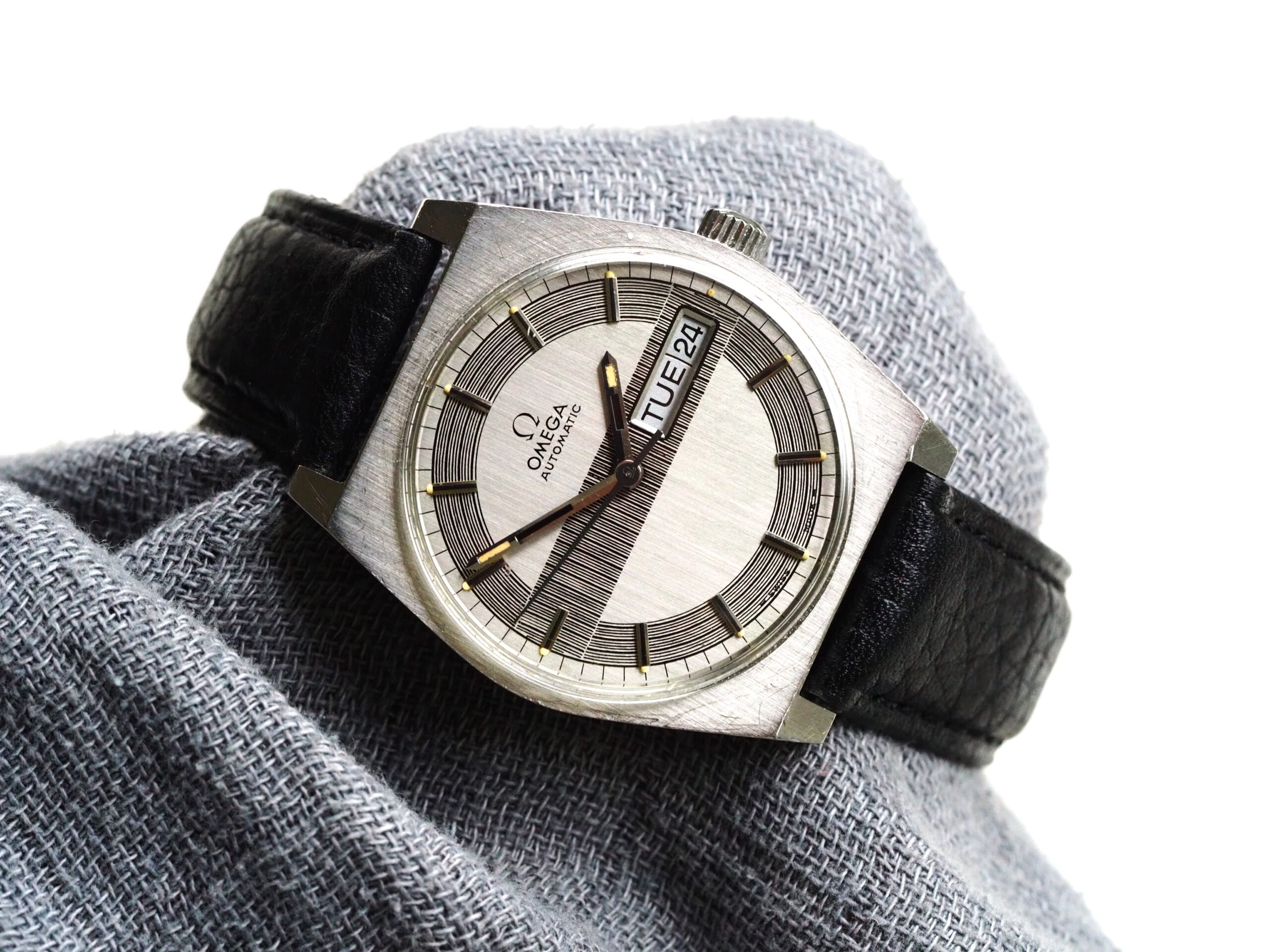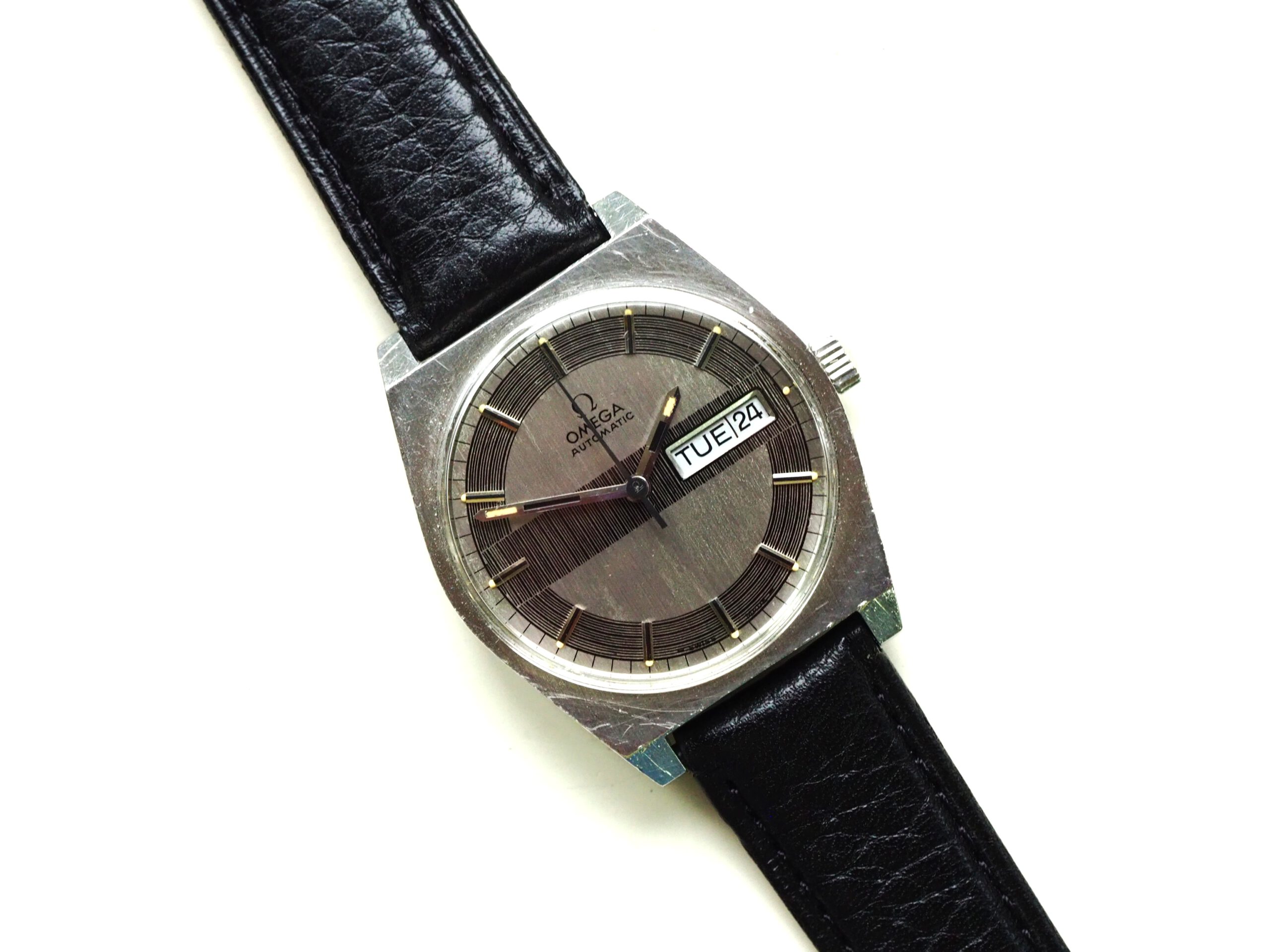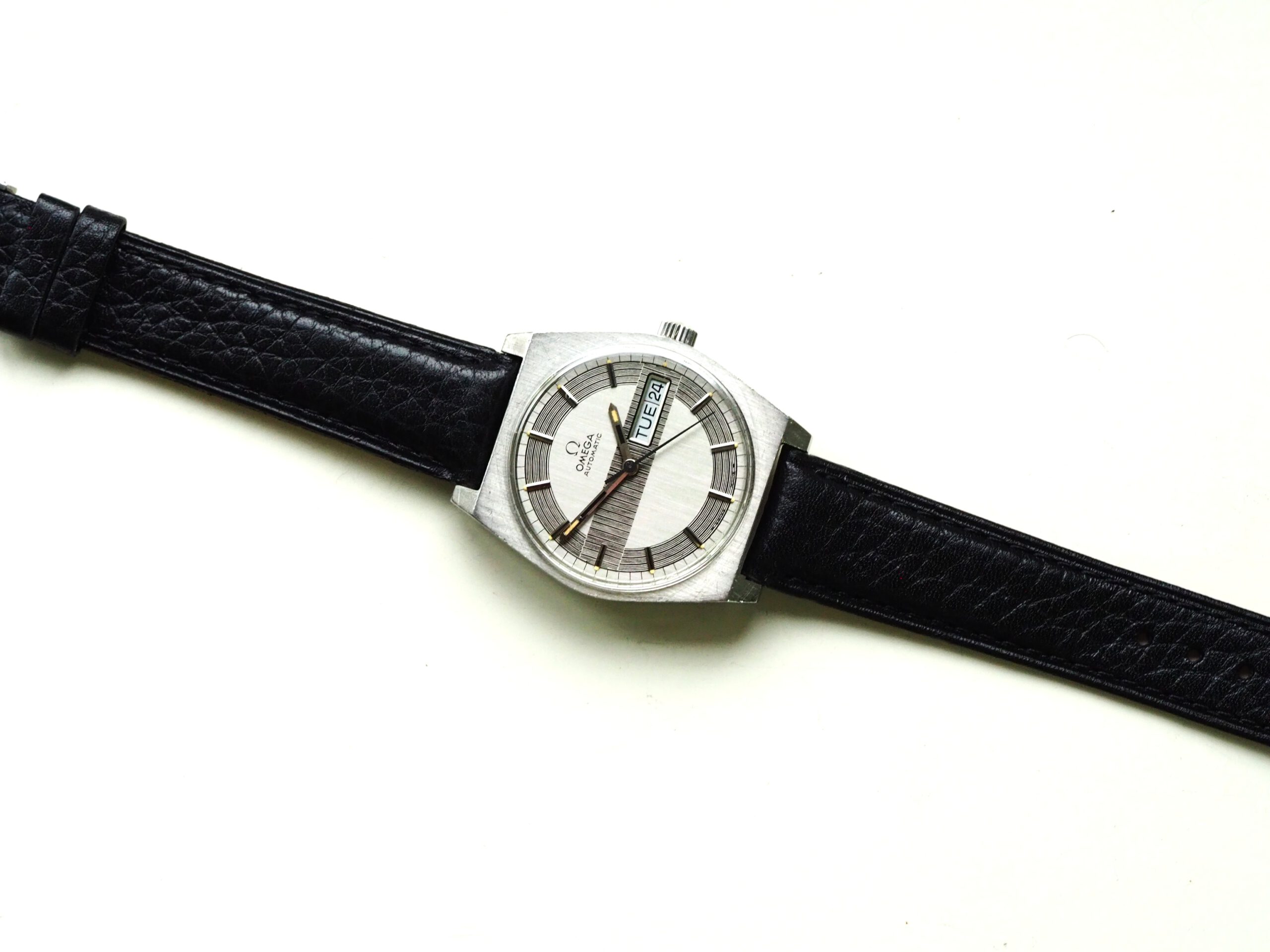Referentie 166.0141 Omega Automatic, serienummer 31961893 productiejaar 1970. Prachtige vintage Omega met een zeldzame zogenaamde barcode (of racing) wijzerplaat met tritium lumen. Ik kocht dit horloge in volledig originele conditie, zelfs nog met de oude versleten band. Na de service heb ik het horloge voorzien van een nieuwe zwarte leren band, maar ik zal de oude originele ook zeker bij het horloge laten. In de stalen kast vinden we een Omega 752 automatisch uurwerk (datum en weekdag, quick-set voor datum) welke net volledig is geserviced (februari 2026) en goed functioneert. Over het algemeen is het horloge in goede originele staat met Omega gesigneerde kroon, plexiglas en gesp. De wijzerplaat heeft smetteloos tritium lumen, maar er is een waas/patina aan de rechterkant van de wijzerplaat die onder bepaalde omstandigheden zichtbaar is. Kastdiameter 35mm zonder kroon.