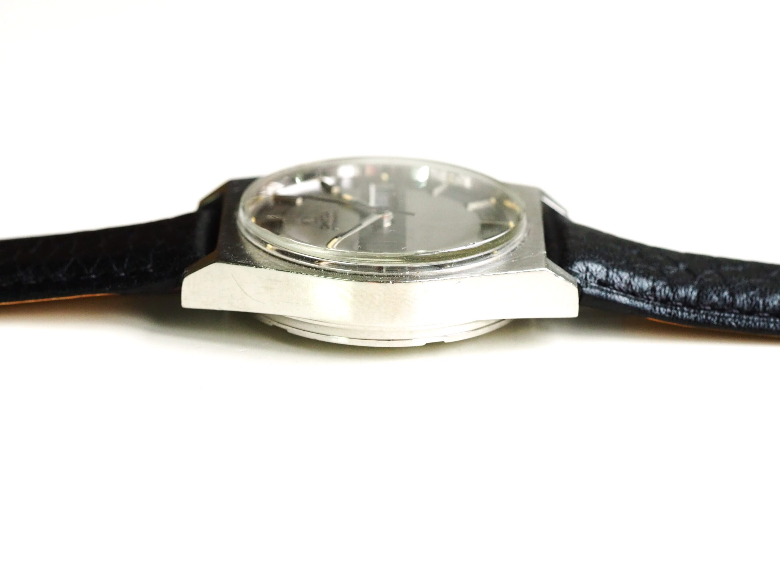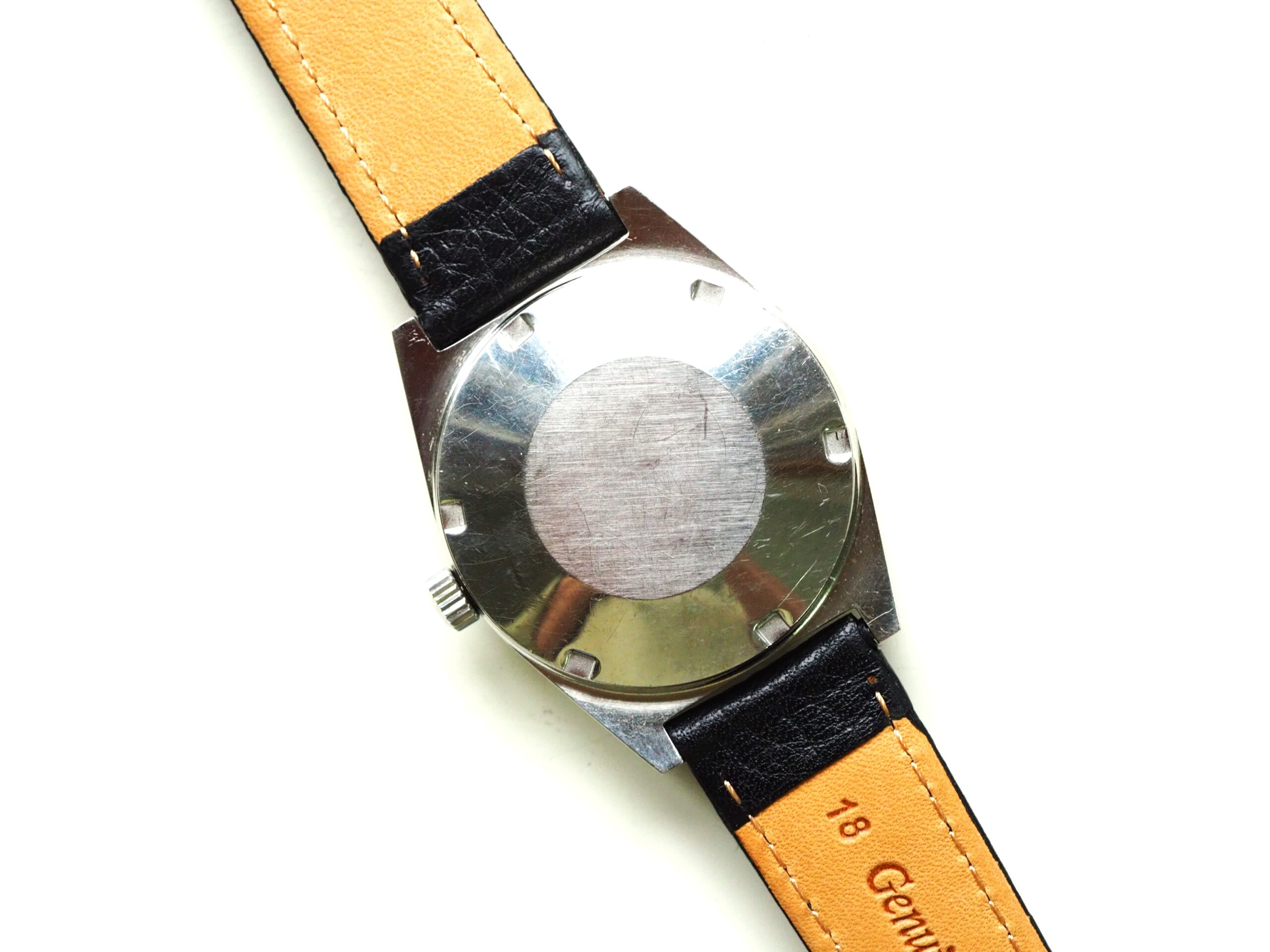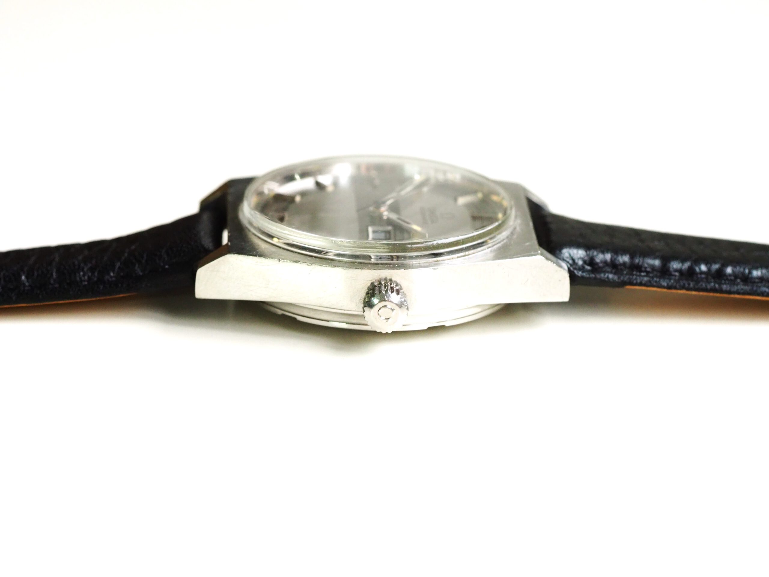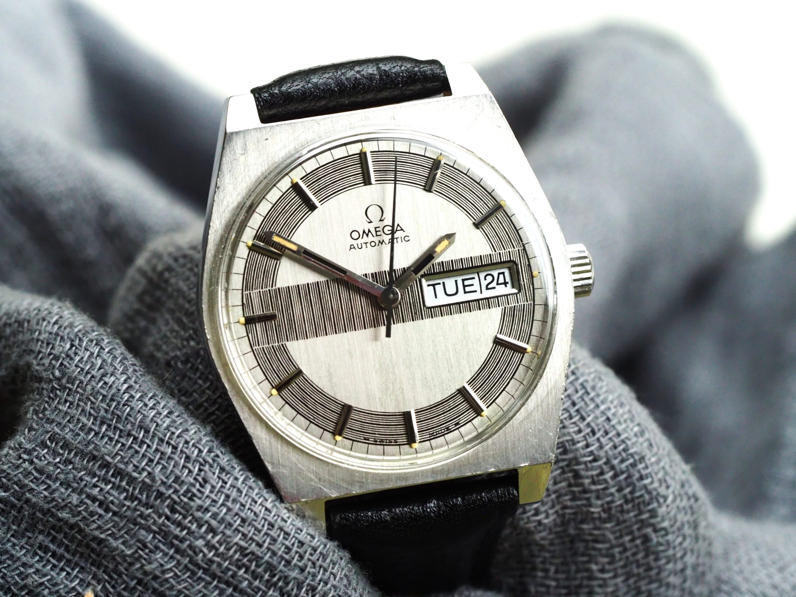 Referentie 166.0141 Omega Automatic, serienummer 31961893 productiejaar 1970. Prachtige vintage Omega met een zeldzame zogenaamde barcode (of racing) wijzerplaat met tritium lumen. Ik kocht dit horloge in volledig originele conditie, zelfs nog met de oude versleten band. Na de service heb ik het horloge voorzien van een nieuwe zwarte leren band, maar ik zal de oude originele ook zeker bij het horloge laten. In de stalen kast vinden we een Omega 752 automatisch uurwerk (datum en weekdag, quick-set voor datum) welke net volledig is geserviced (februari 2026) en goed functioneert. Over het algemeen is het horloge in goede originele staat met Omega gesigneerde kroon, plexiglas en gesp. De wijzerplaat heeft smetteloos tritium lumen, maar er is een waas/patina aan de rechterkant van de wijzerplaat die onder bepaalde omstandigheden zichtbaar is. Kastdiameter 35mm zonder kroon.