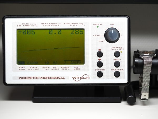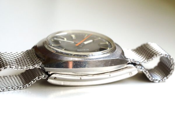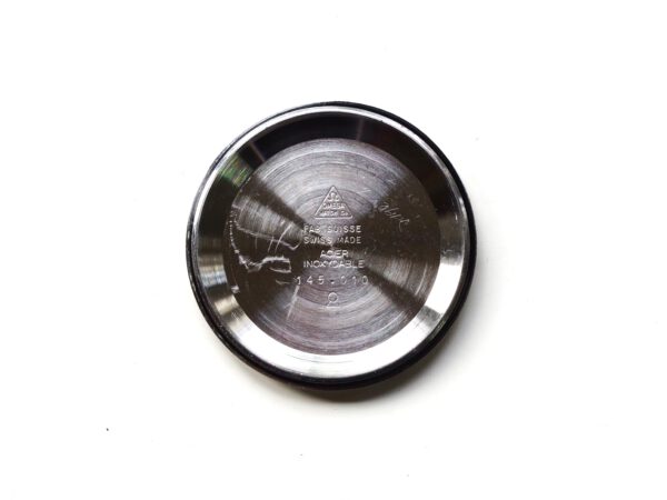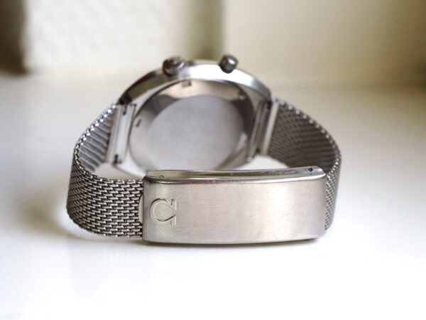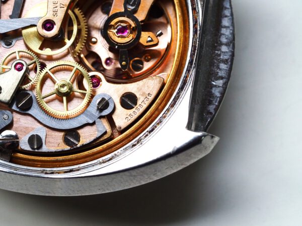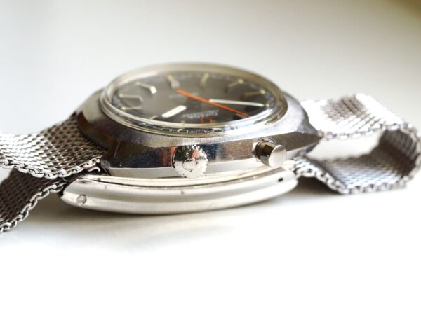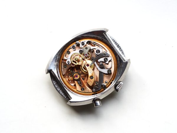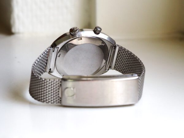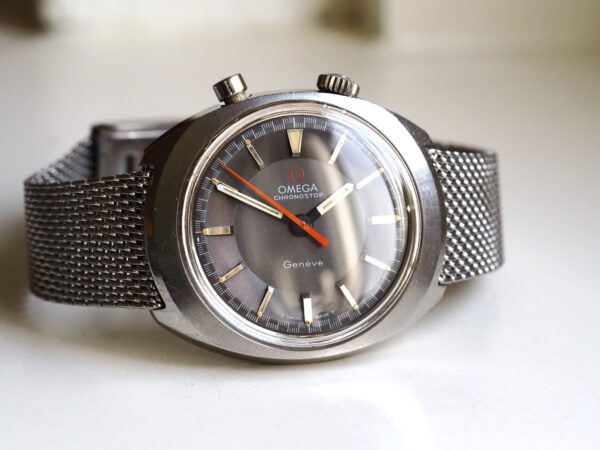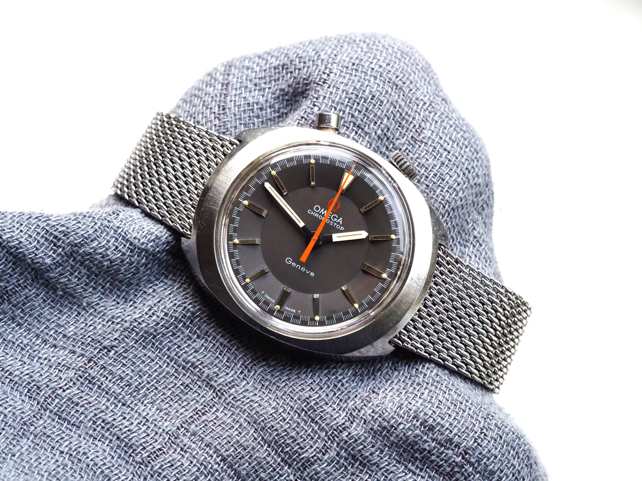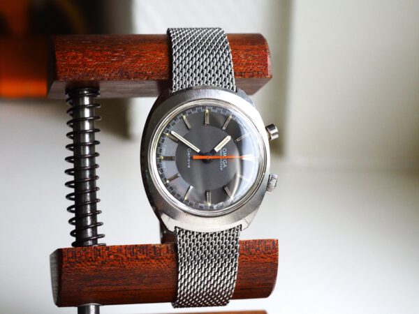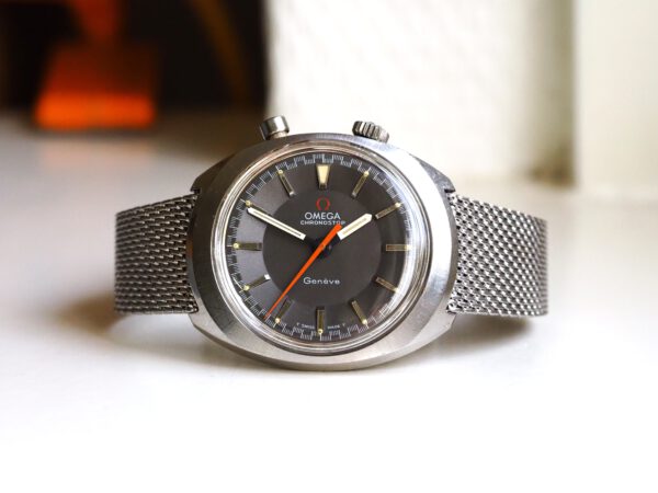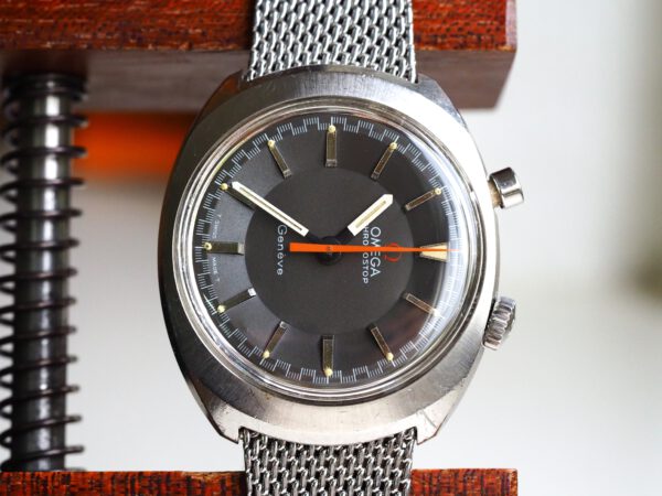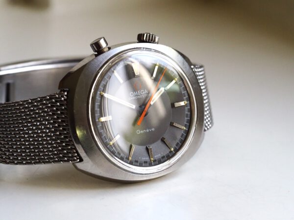 Referentie 145.010 Omega Genève Chronostop, serienummer 25858736 productiejaar 1967. Deze Chronostop in de speciale zogenaamde drivers edition is echt iets bijzonders en een zeer gedurfd ontwerp voor de jaren 60. Opmerkelijk aan deze referentie is dat de wijzerplaat 90 graden is gedraaid, waardoor deze beter afleesbaar zou zijn tijdens het autorijden. In Omega advertenties destijds werd het horloge aan de onderkant van de pols gedragen. Het horloge welke ik te koop aanbied verkeert in een zeer goede conditie en is compleet met originele band, kroon en plexiglas. In de kast vinden we een Omega 865 chronograaf uurwerk, een afgeleide van het beroemde Omega 861 uurwerk dat in de Speedmaster Professional werd gebruikt. Het uurwerk is onlangs volledig geserviced (september 2025) en functioneert zeer goed. De originele band is op twee plaatsen in de sluiting in lengte te verstellen, hierdoor geschikt voor vrijwel elke pols. Kastdiameter 35mm zonder kroon.