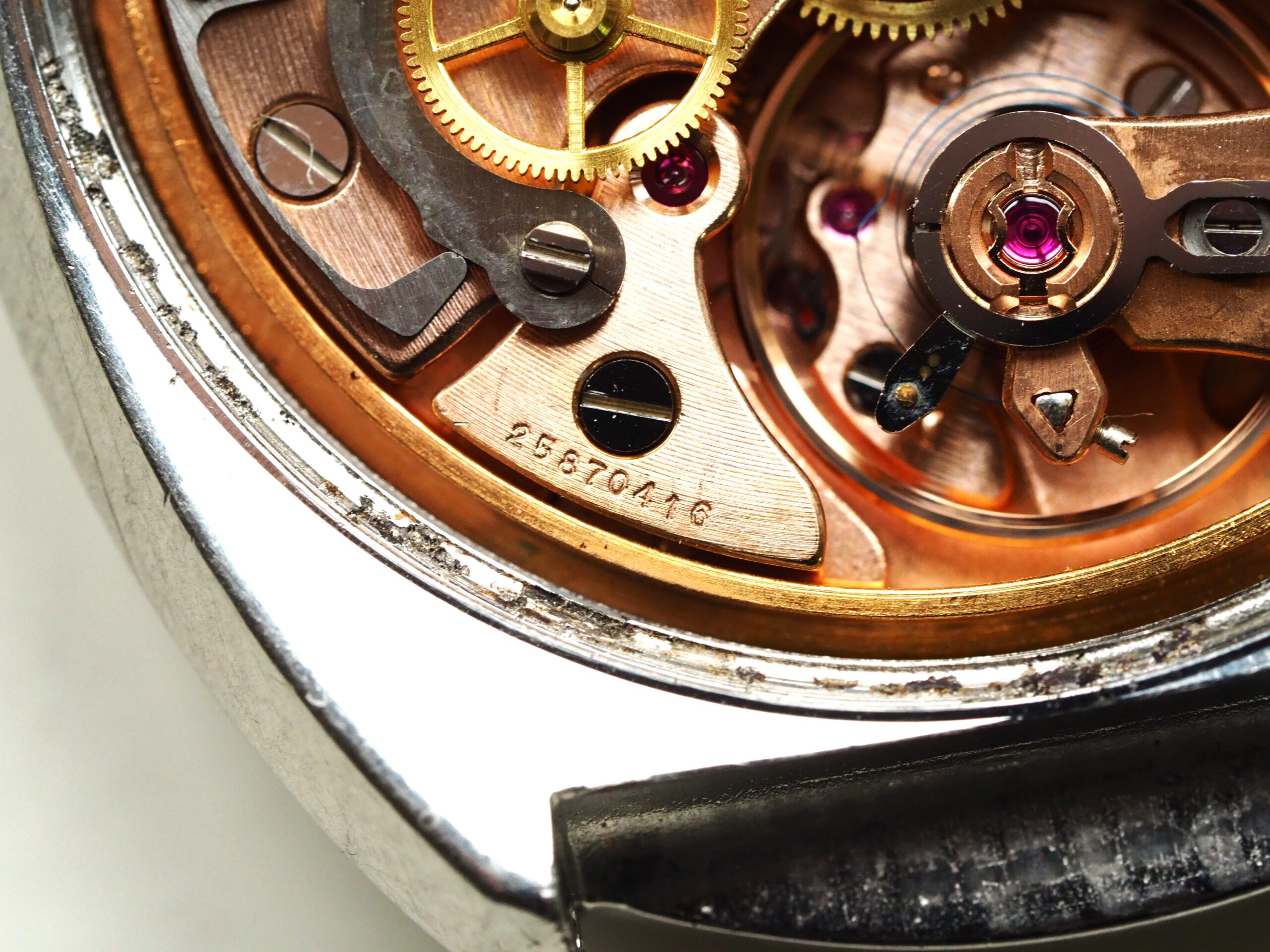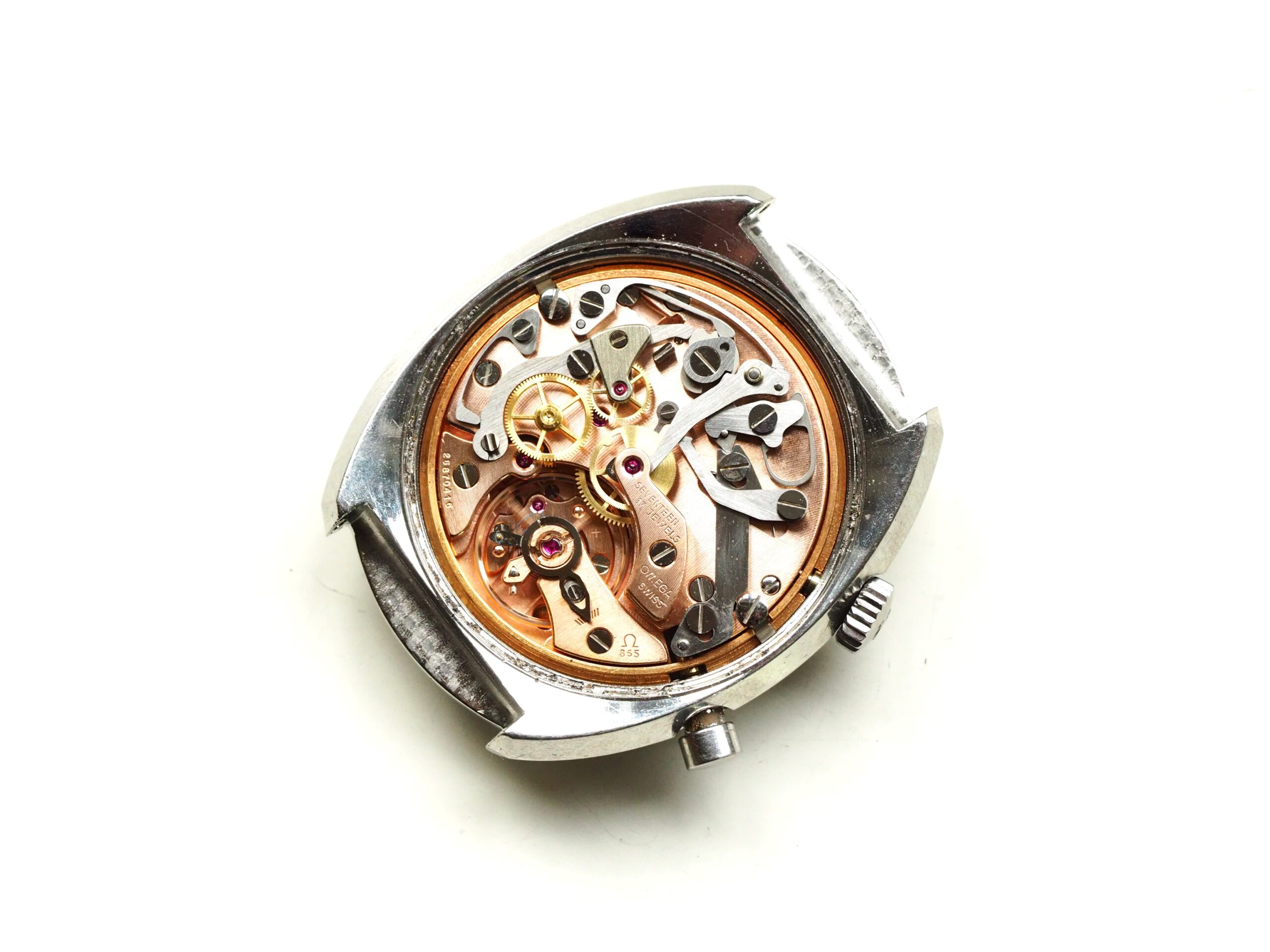 In de kast vinden we een Omega 865 chronograaf uurwerk, een afgeleide van het beroemde Omega 861 uurwerk dat gebruikt werd in de Speedmaster Professional. Het uurwerk is net volledig geserviced (februari 2026) en functioneert uitstekend. Het horloge wordt geleverd met een rode Omega doos uit de jaren 60, zoals te zien op de foto’s. Kastdiameter 35mm zonder kroon.