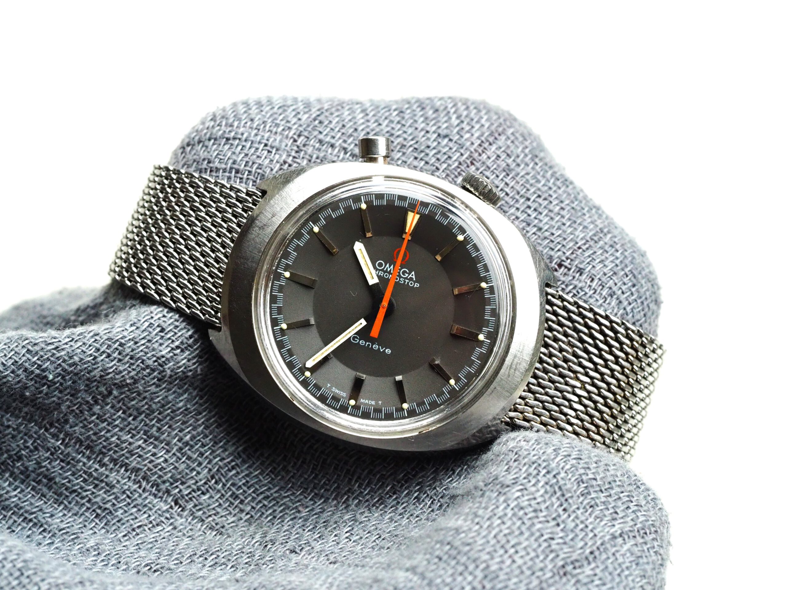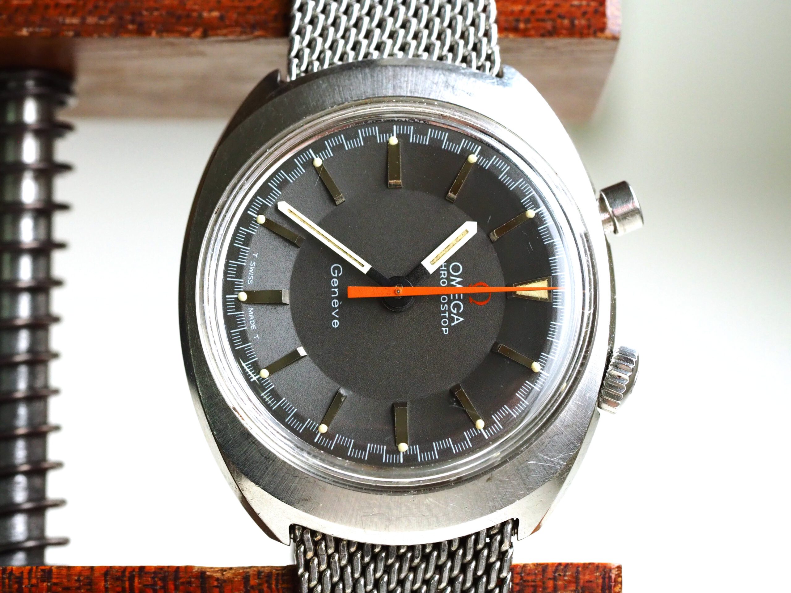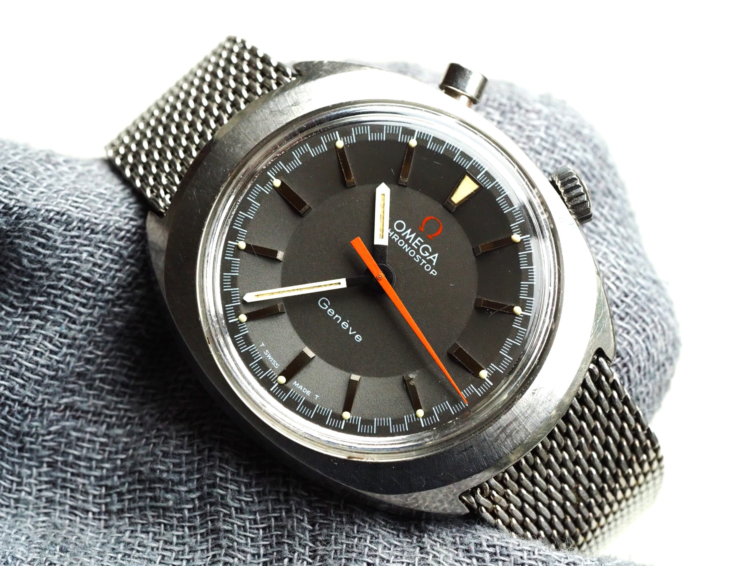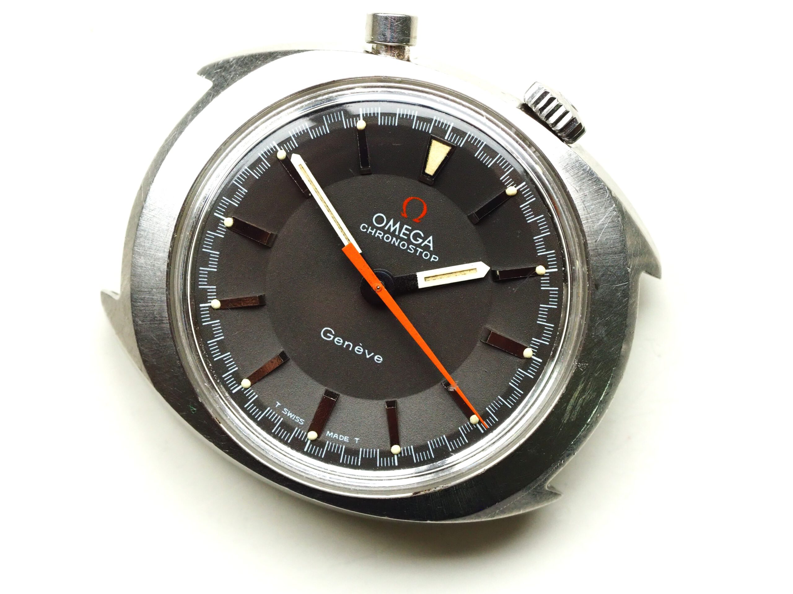 Referentie 145.010 Omega Genève Chronostop, serienummer 25870416 productiejaar 1967. Deze Chronostop in de speciale zogenaamde Drivers Edition is werkelijk iets bijzonders en een zeer gedurfd ontwerp voor de jaren 60. Bijzonder aan dit model is dat de wijzerplaat 90 graden is gedraaid, waardoor deze gemakkelijker af te lezen zou zijn tijdens het autorijden. In Omega advertenties uit die tijd werd het horloge aan de onderkant van de pols gedragen.