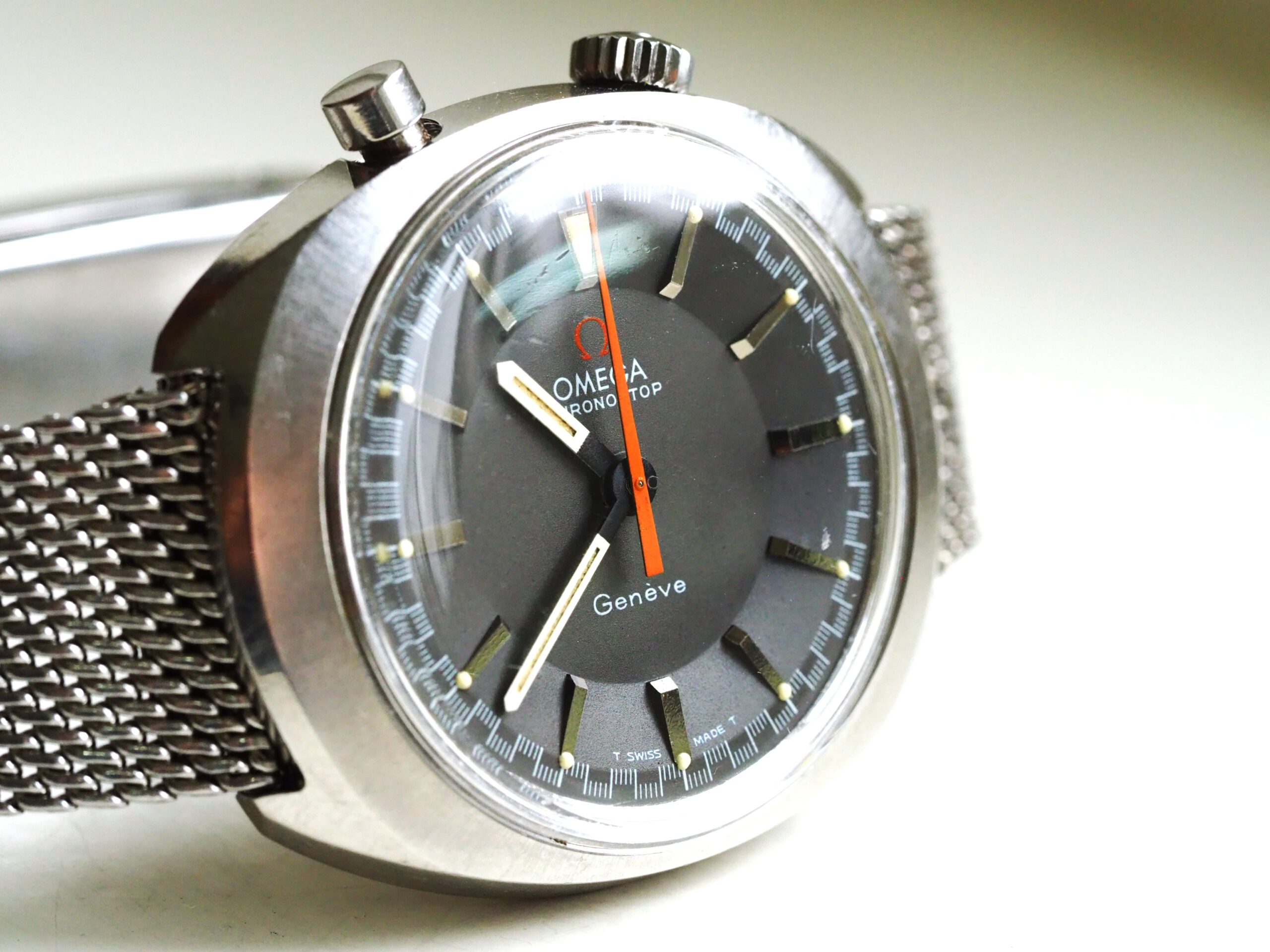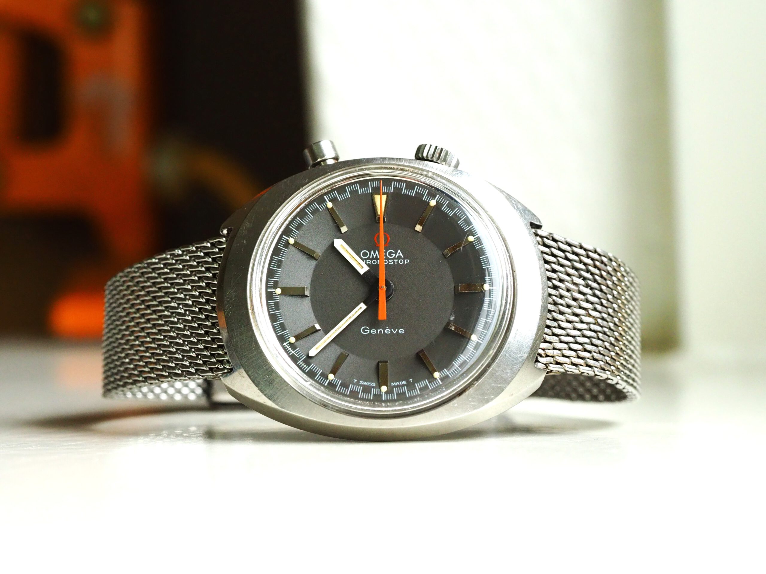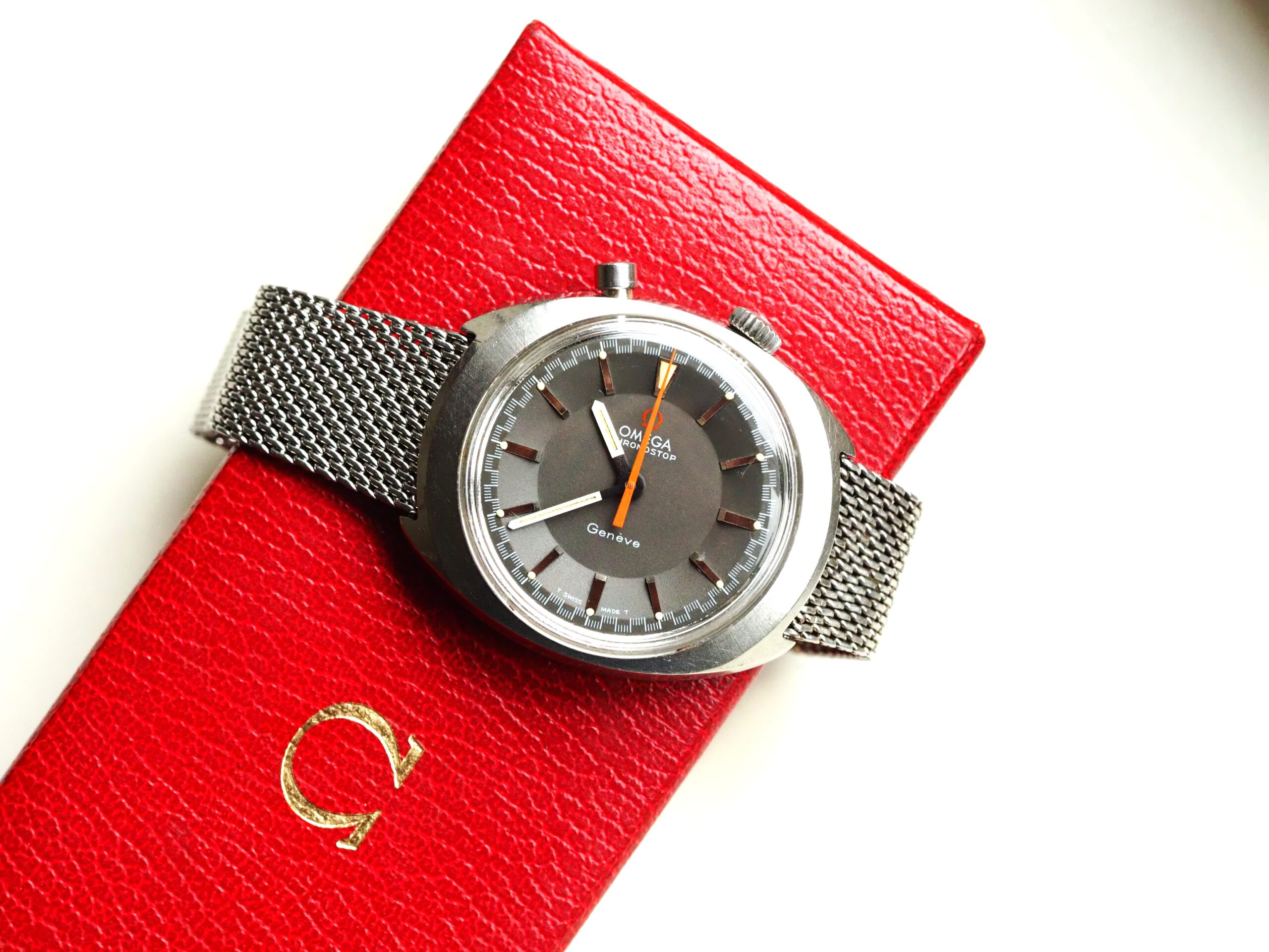 Referentie 145.010 Omega Genève Chronostop, serienummer 25870416 productiejaar 1967. Deze Chronostop in de speciale zogenaamde Drivers Edition is werkelijk iets bijzonders en een zeer gedurfd ontwerp voor de jaren 60. Bijzonder aan dit model is dat de wijzerplaat 90 graden is gedraaid, waardoor deze gemakkelijker af te lezen zou zijn tijdens het autorijden. In Omega advertenties uit die tijd werd het horloge aan de onderkant van de pols gedragen.