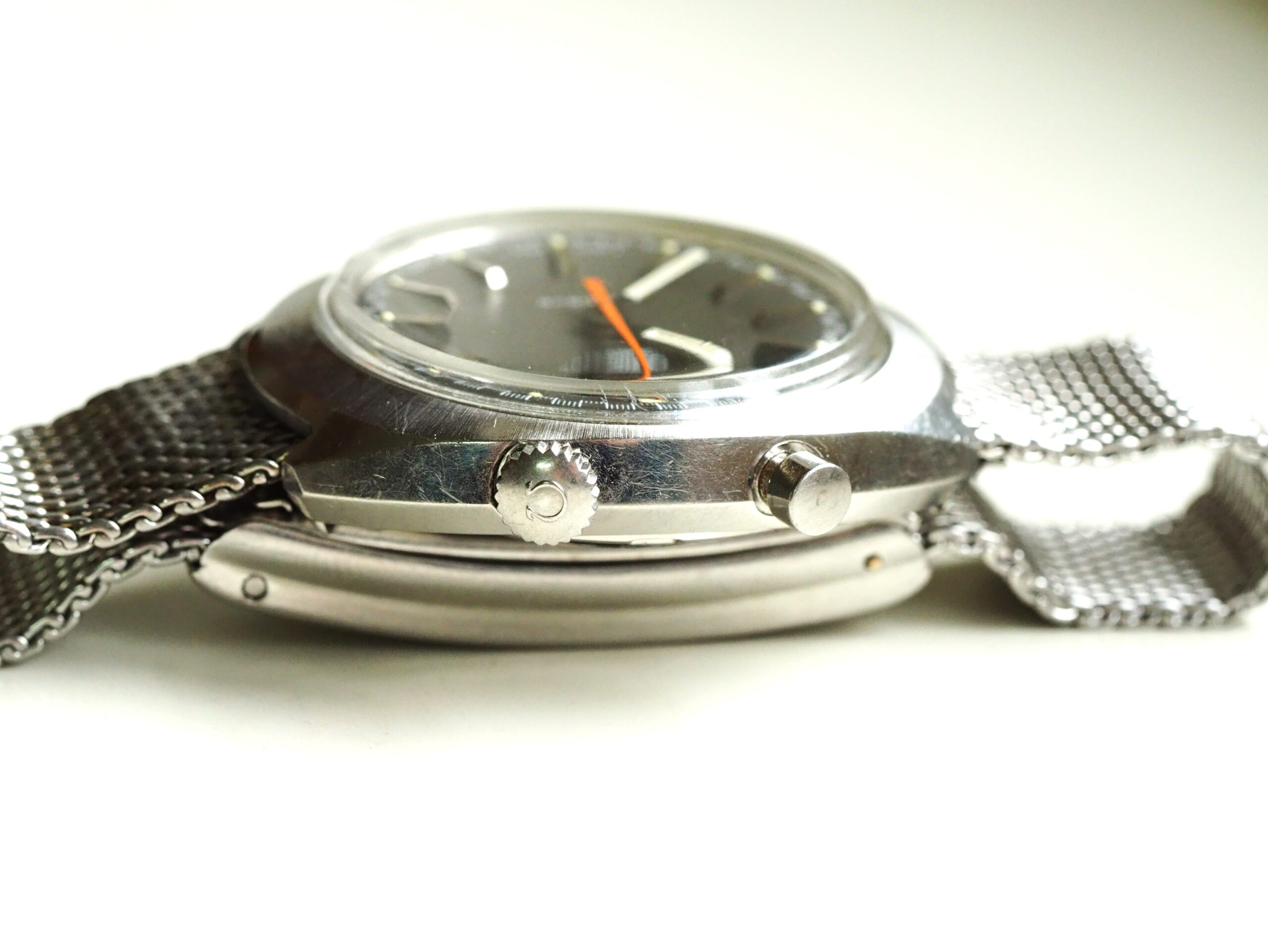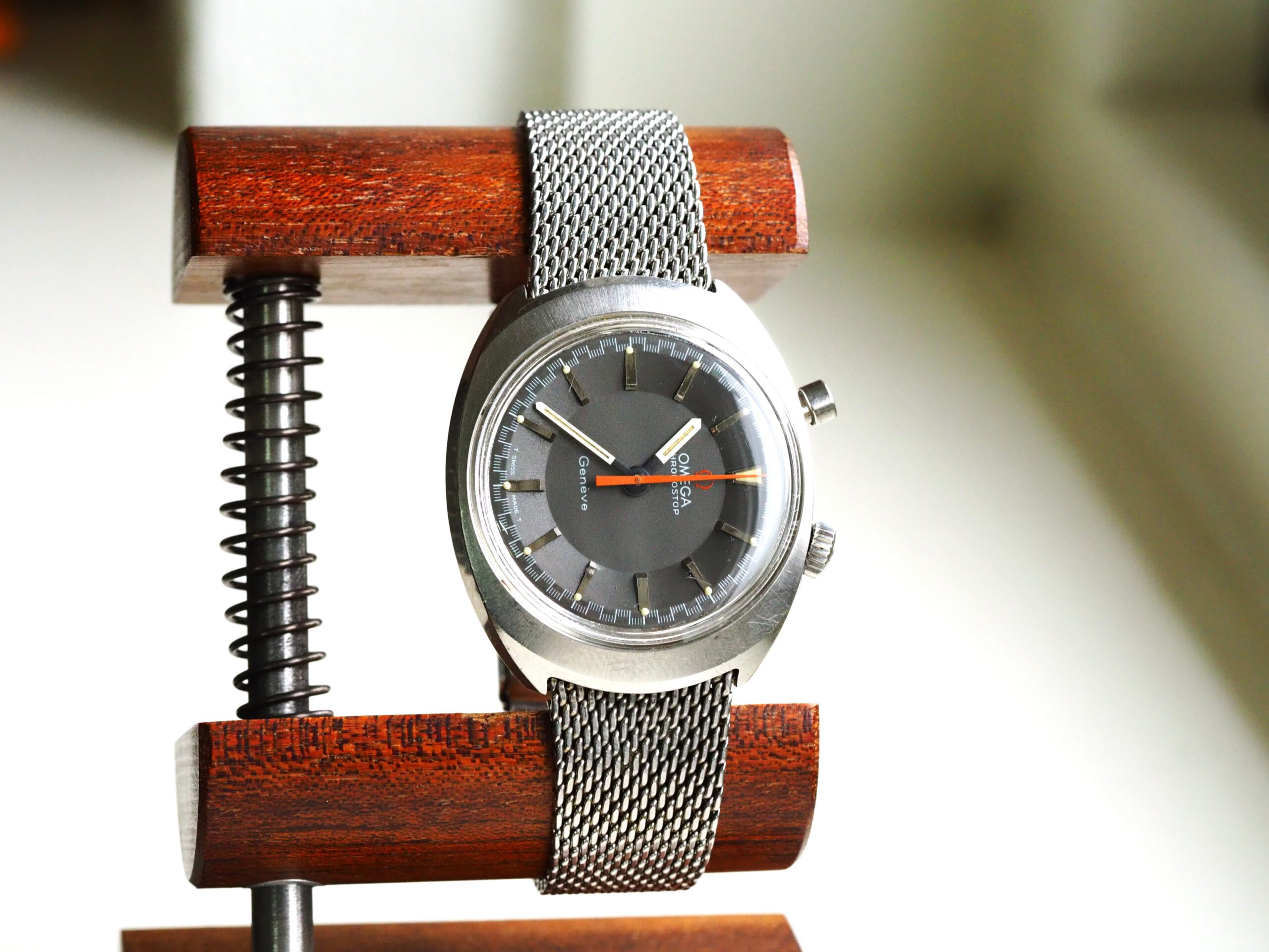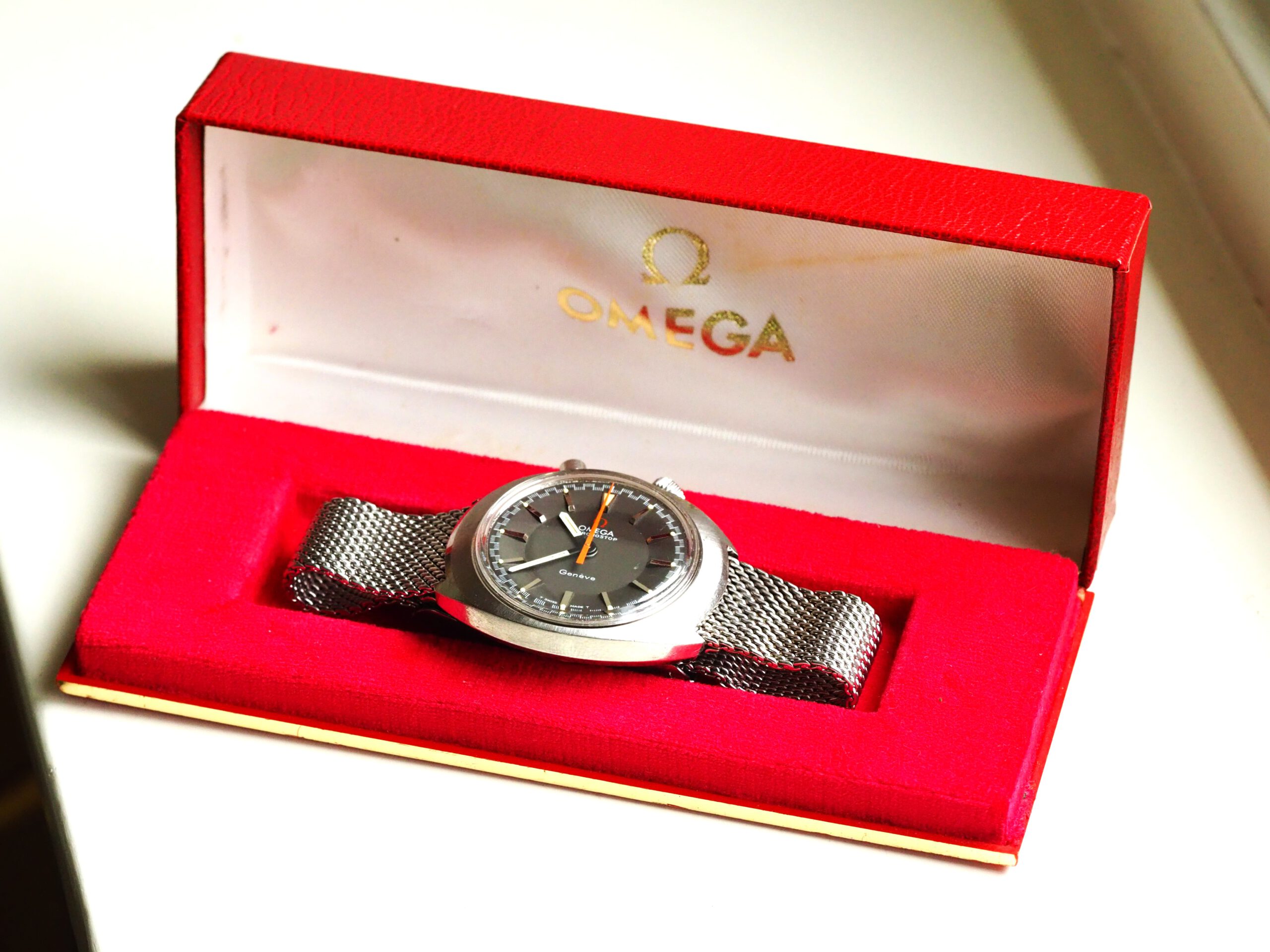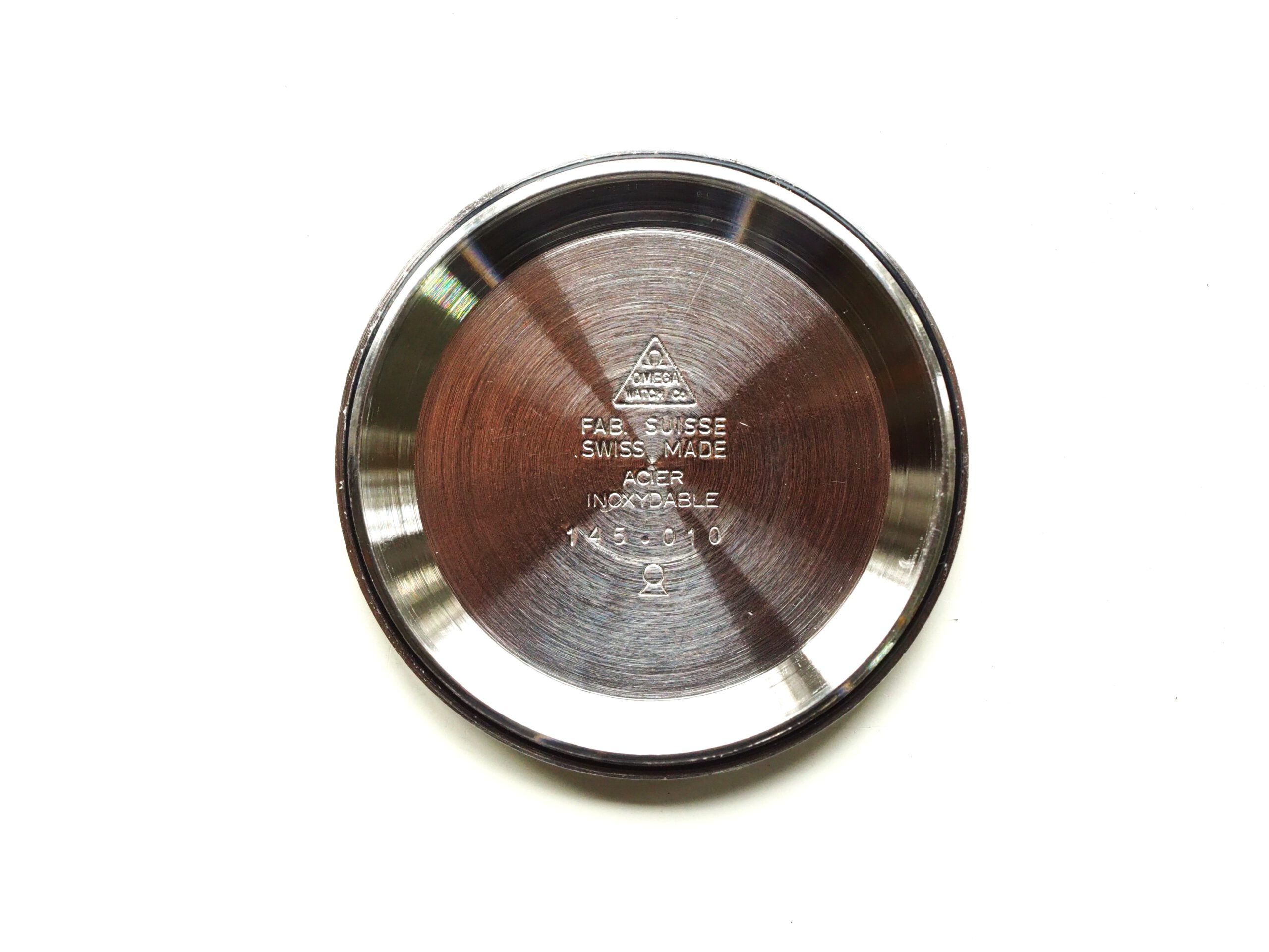 Referentie 145.010 Omega Genève Chronostop, serienummer 25870416 productiejaar 1967. Deze Chronostop in de speciale zogenaamde Drivers Edition is werkelijk iets bijzonders en een zeer gedurfd ontwerp voor de jaren 60. Bijzonder aan dit model is dat de wijzerplaat 90 graden is gedraaid, waardoor deze gemakkelijker af te lezen zou zijn tijdens het autorijden. In Omega advertenties uit die tijd werd het horloge aan de onderkant van de pols gedragen.