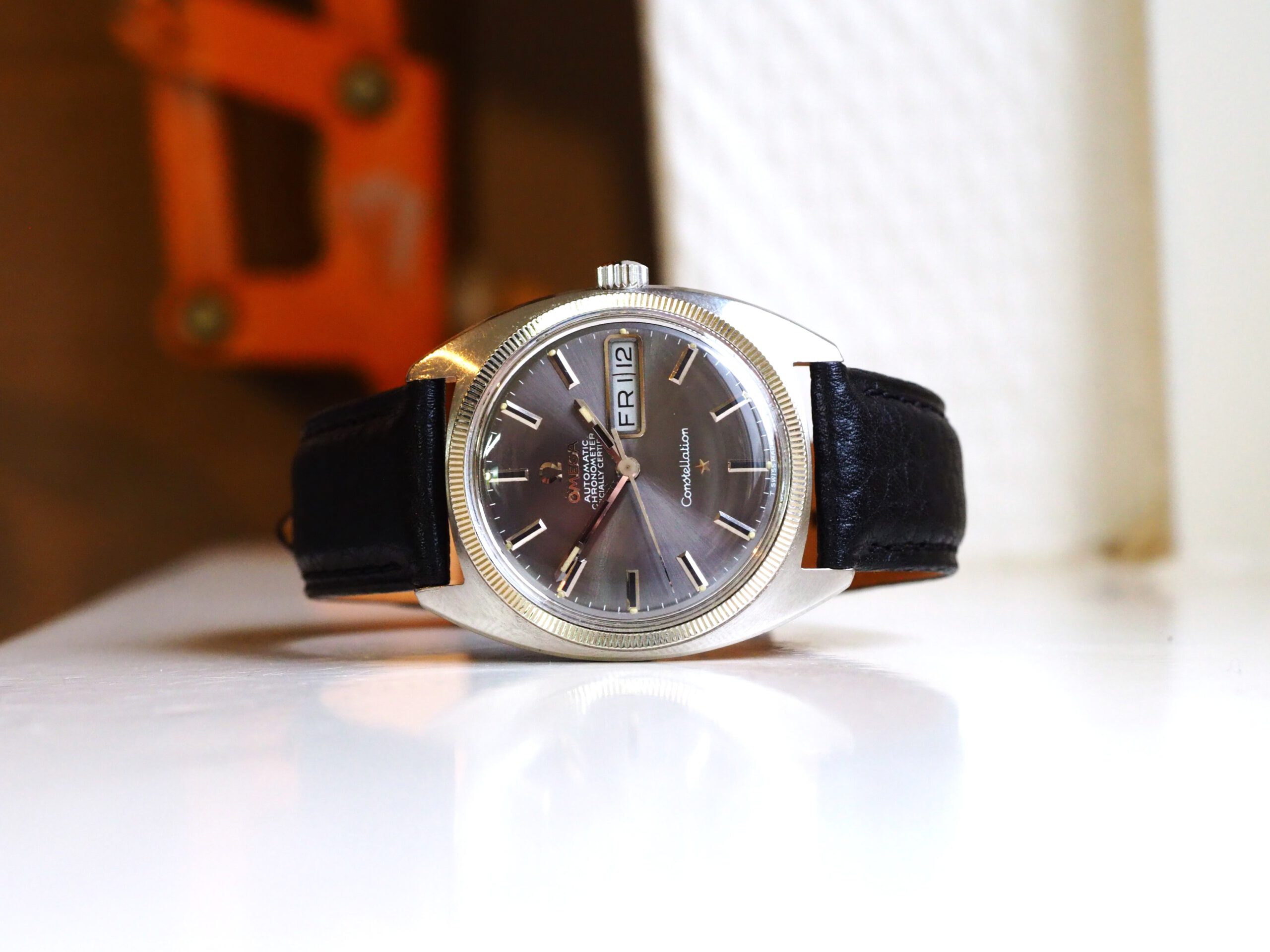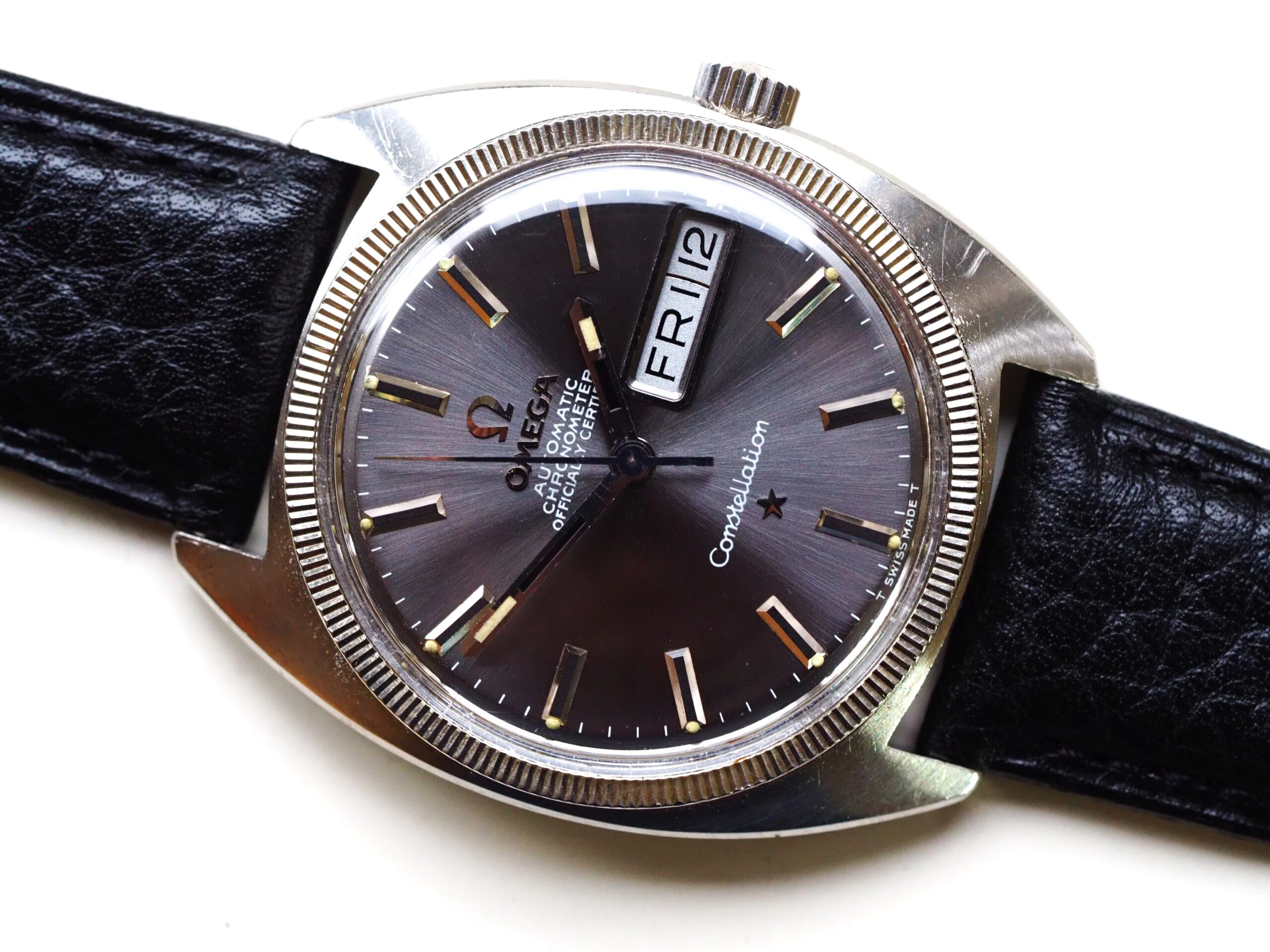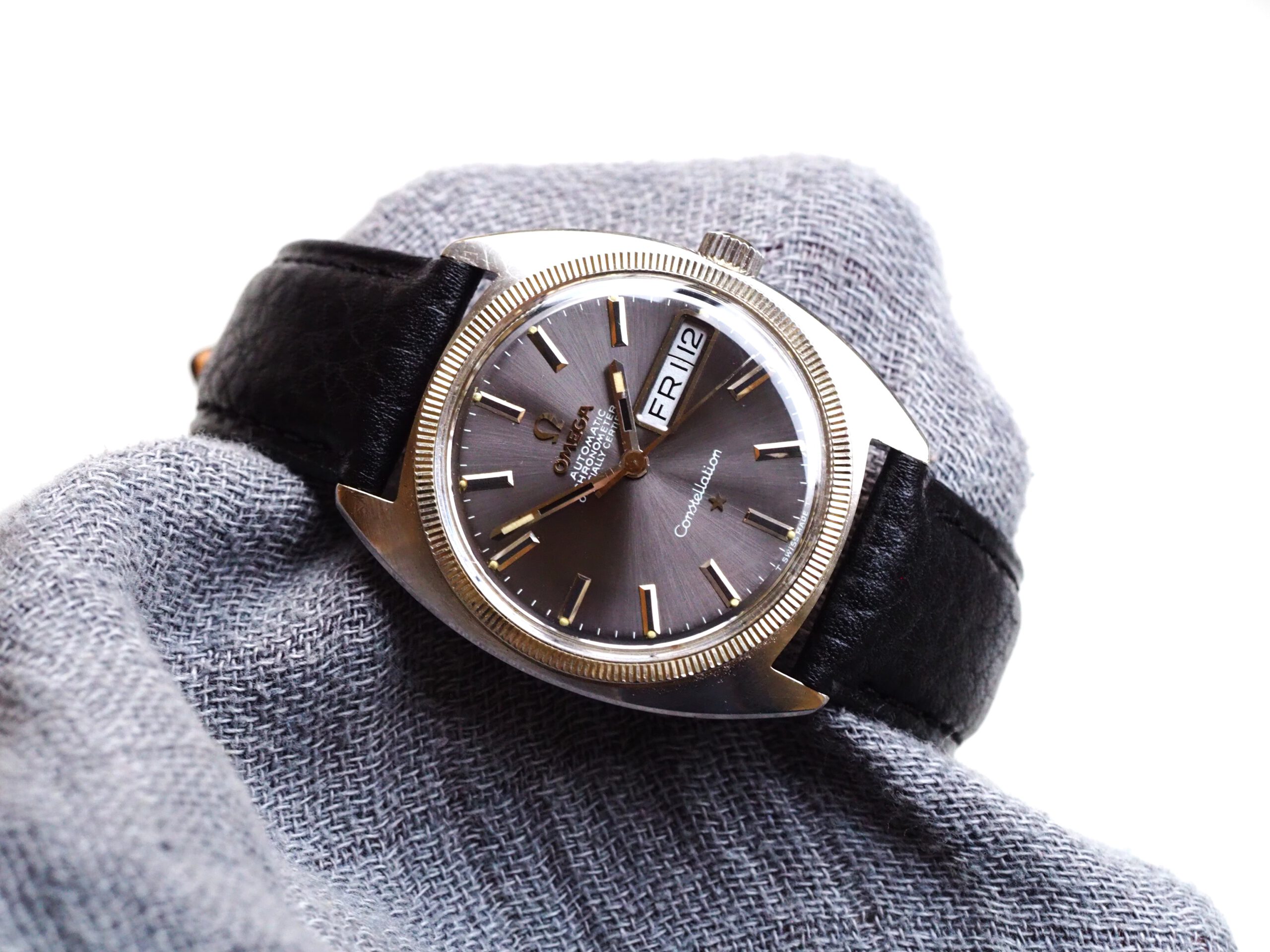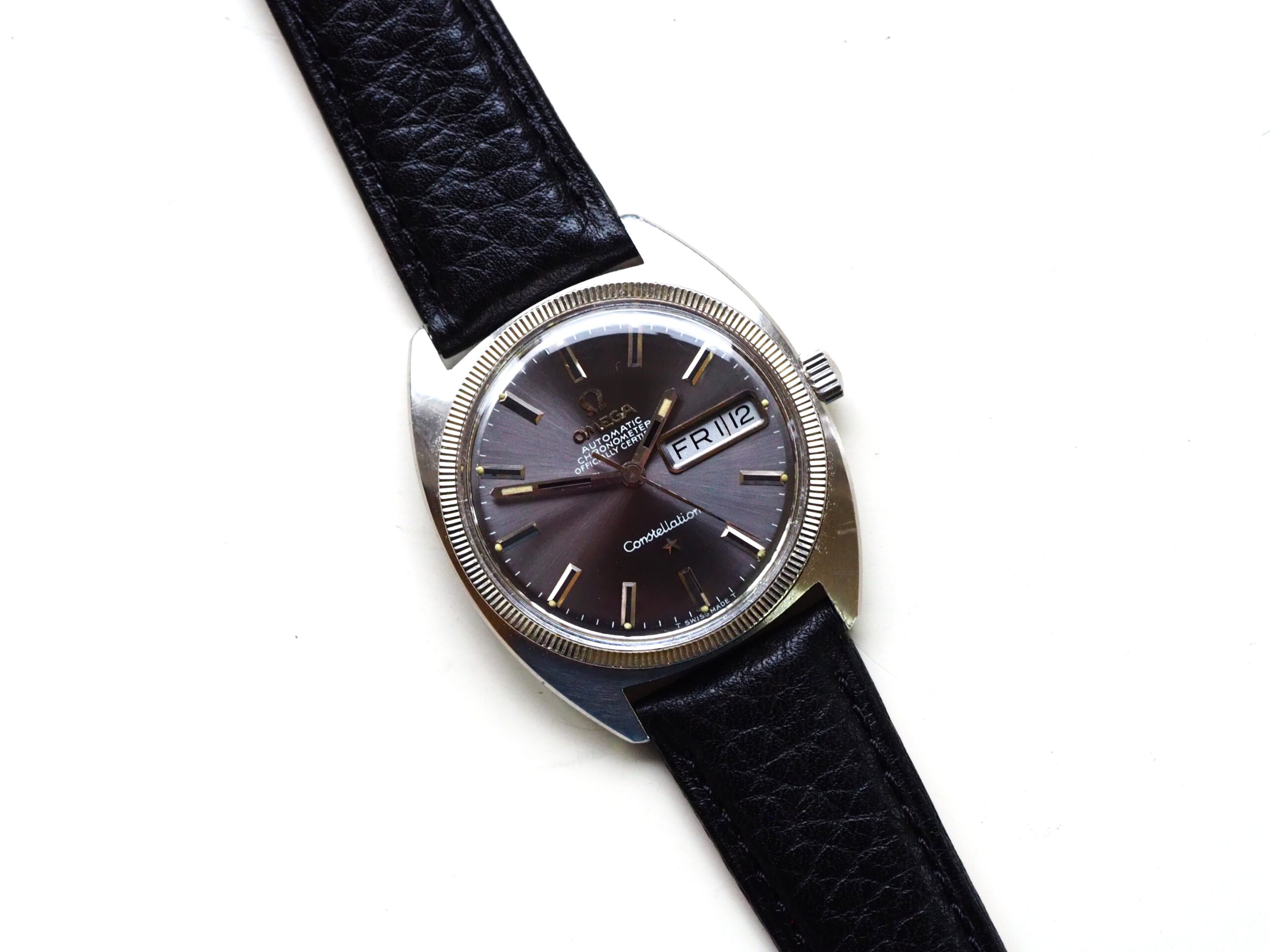 Referentie 168.029 Omega Constellation Automatic, serienummer 31945785 productiejaar 1970. Prachtige vintage C-shape Constellation in goede staat met stalen kast, witgouden lunette en volledig geserviced uurwerk. Zeer fraaie wijzerplaat met grijze sunburst, zwarte accenten en tritium lumen. In combinatie met de witgouden lunette is dit naar mijn mening een van de mooiste uitvoeringen van de C-shape Constellation. In de kast vinden we een Omega 751 automatisch uurwerk (datum en weekdag, quick-set voor datum) welke net volledig is geserviced (december 2025) en zeer goed functioneert. Tijdens deze service is tevens de kast ultrasoon gereinigd en voorzien van een nieuwe zwarte leren band. Over het algemeen verkeert het horloge in goede staat met een scherpe, ongepolijste kast en lunette. Het plexiglas, de band en gesp zijn niet origineel van Omega. Kastdiameter 34,5mm zonder kroon.