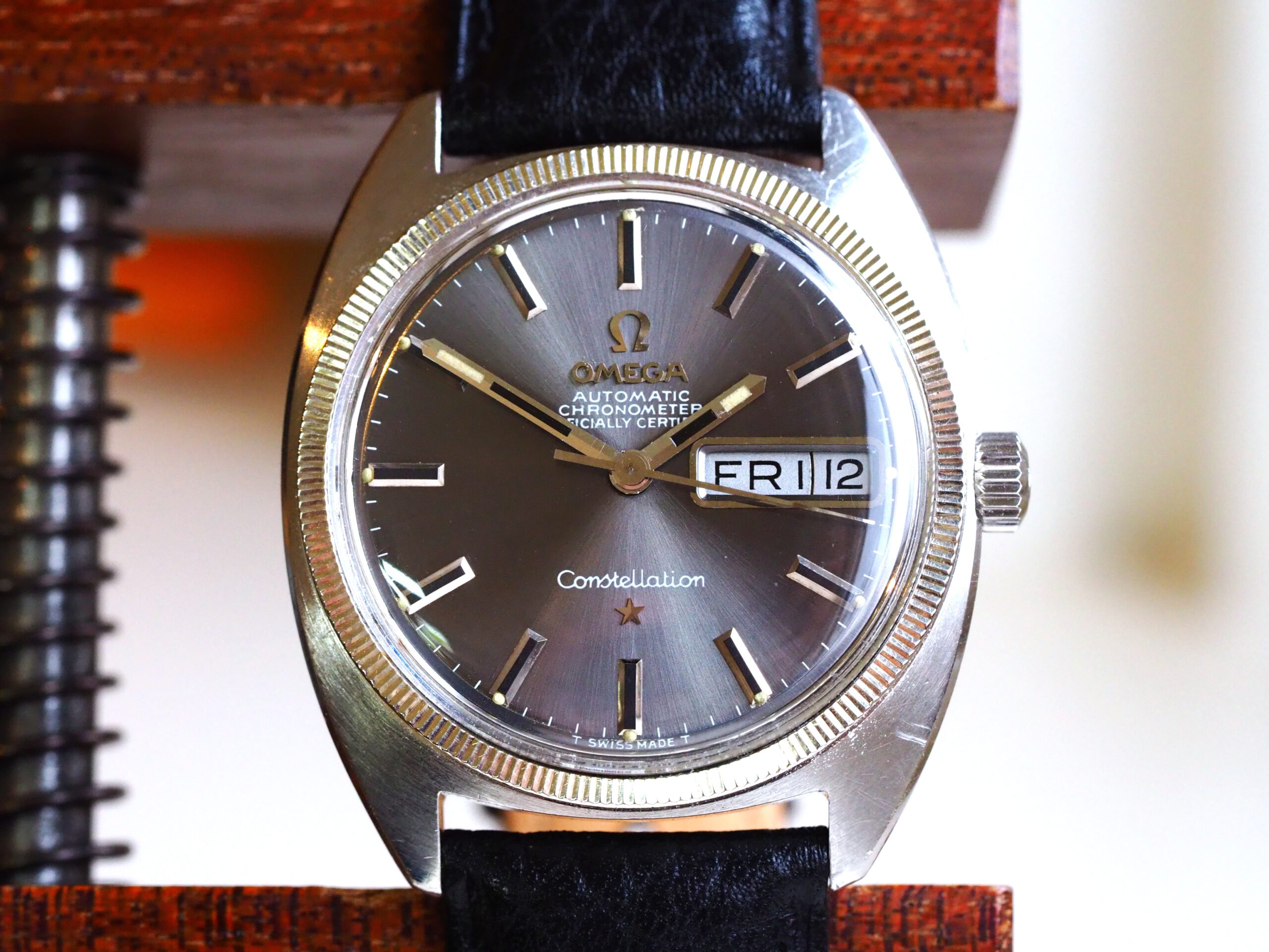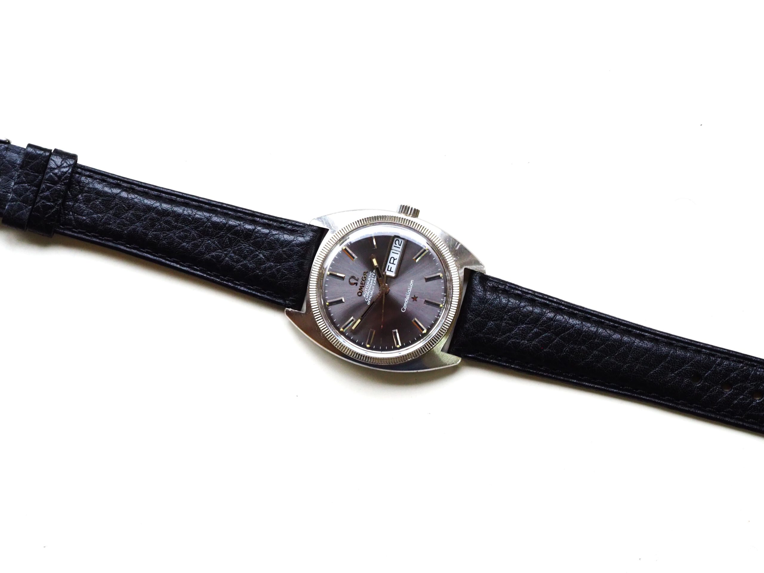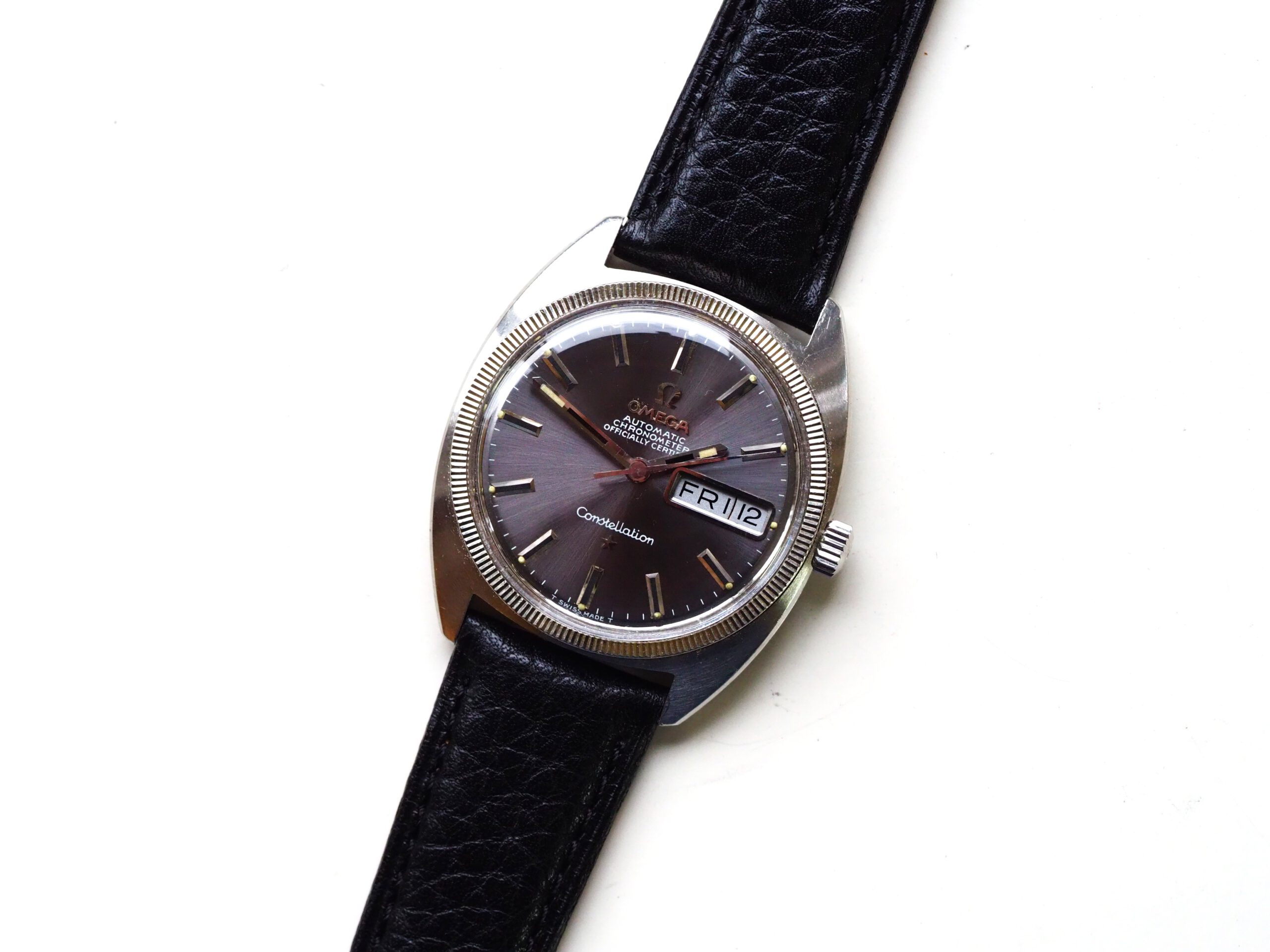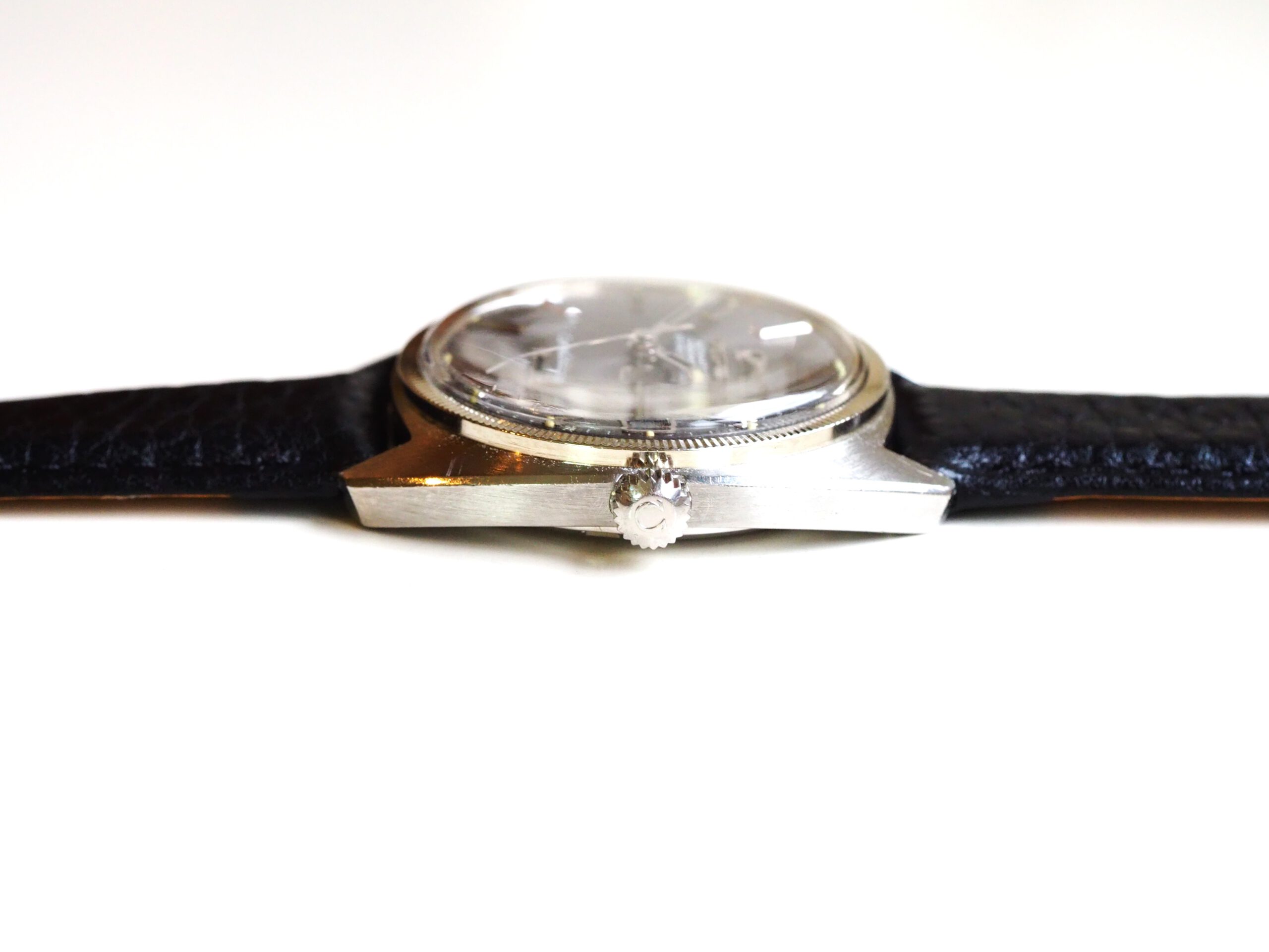 Referentie 168.029 Omega Constellation Automatic, serienummer 31945785 productiejaar 1970. Prachtige vintage C-shape Constellation in goede staat met stalen kast, witgouden lunette en volledig geserviced uurwerk. Zeer fraaie wijzerplaat met grijze sunburst, zwarte accenten en tritium lumen. In combinatie met de witgouden lunette is dit naar mijn mening een van de mooiste uitvoeringen van de C-shape Constellation. In de kast vinden we een Omega 751 automatisch uurwerk (datum en weekdag, quick-set voor datum) welke net volledig is geserviced (december 2025) en zeer goed functioneert. Tijdens deze service is tevens de kast ultrasoon gereinigd en voorzien van een nieuwe zwarte leren band. Over het algemeen verkeert het horloge in goede staat met een scherpe, ongepolijste kast en lunette. Het plexiglas, de band en gesp zijn niet origineel van Omega. Kastdiameter 34,5mm zonder kroon.