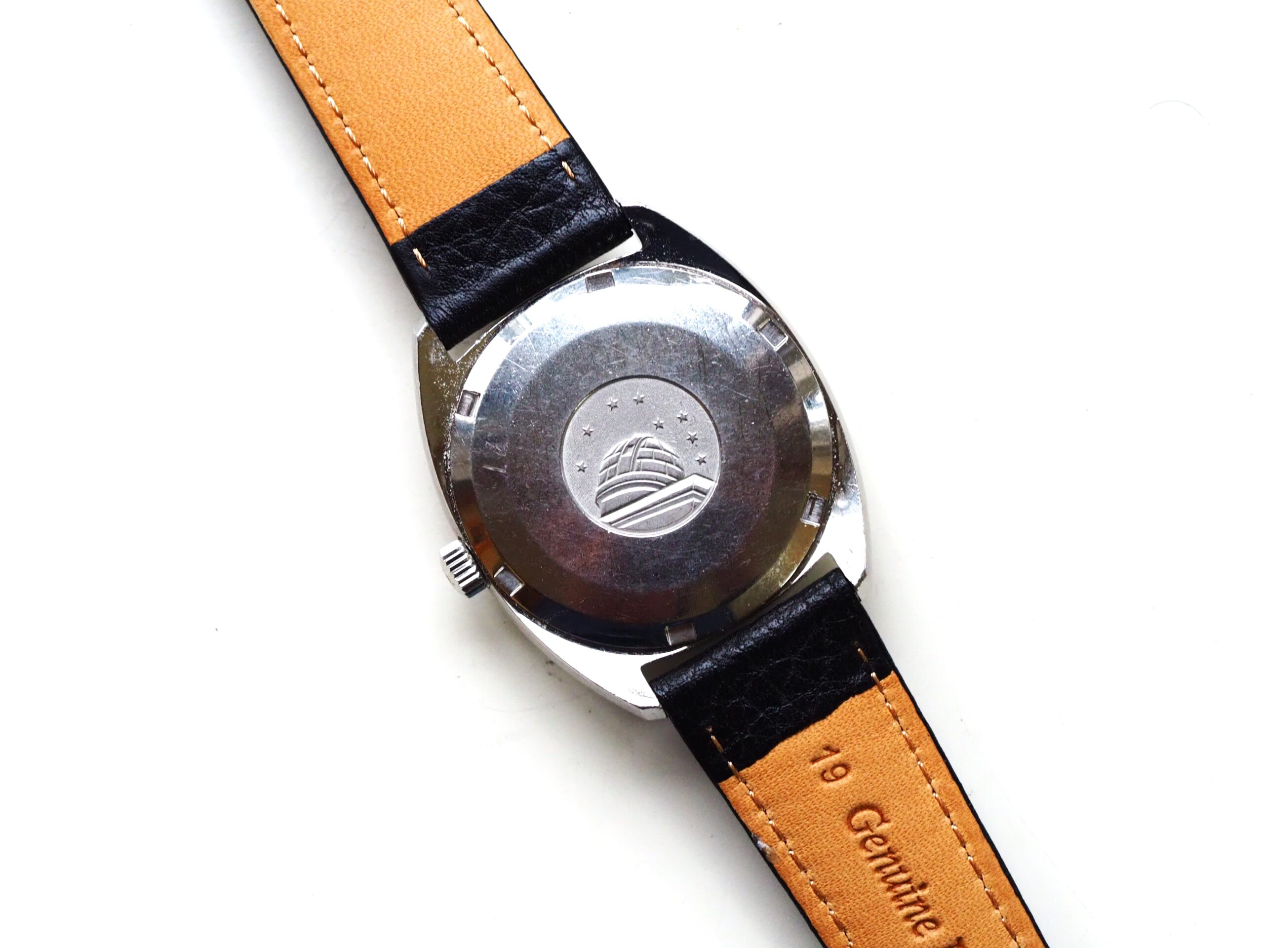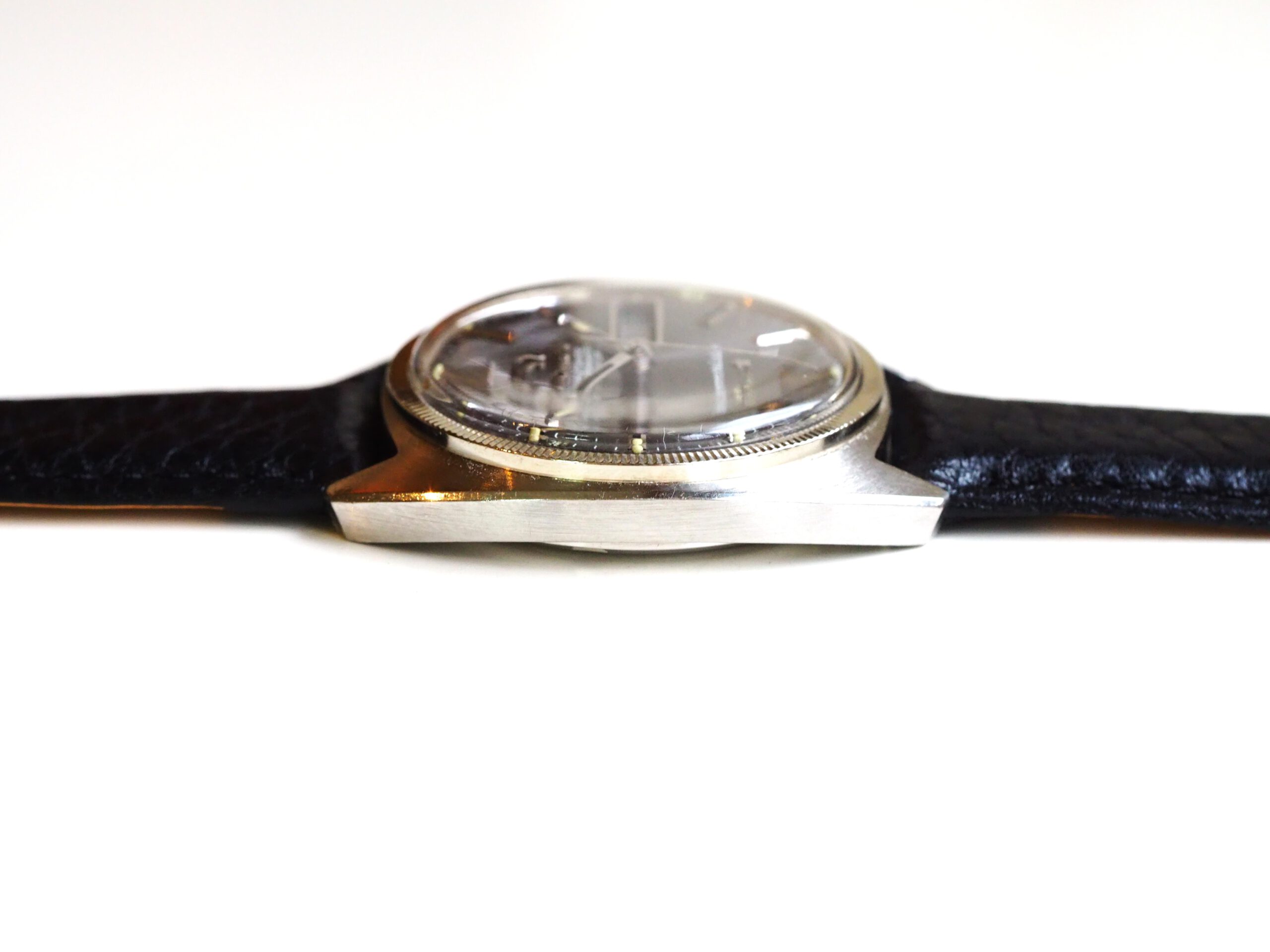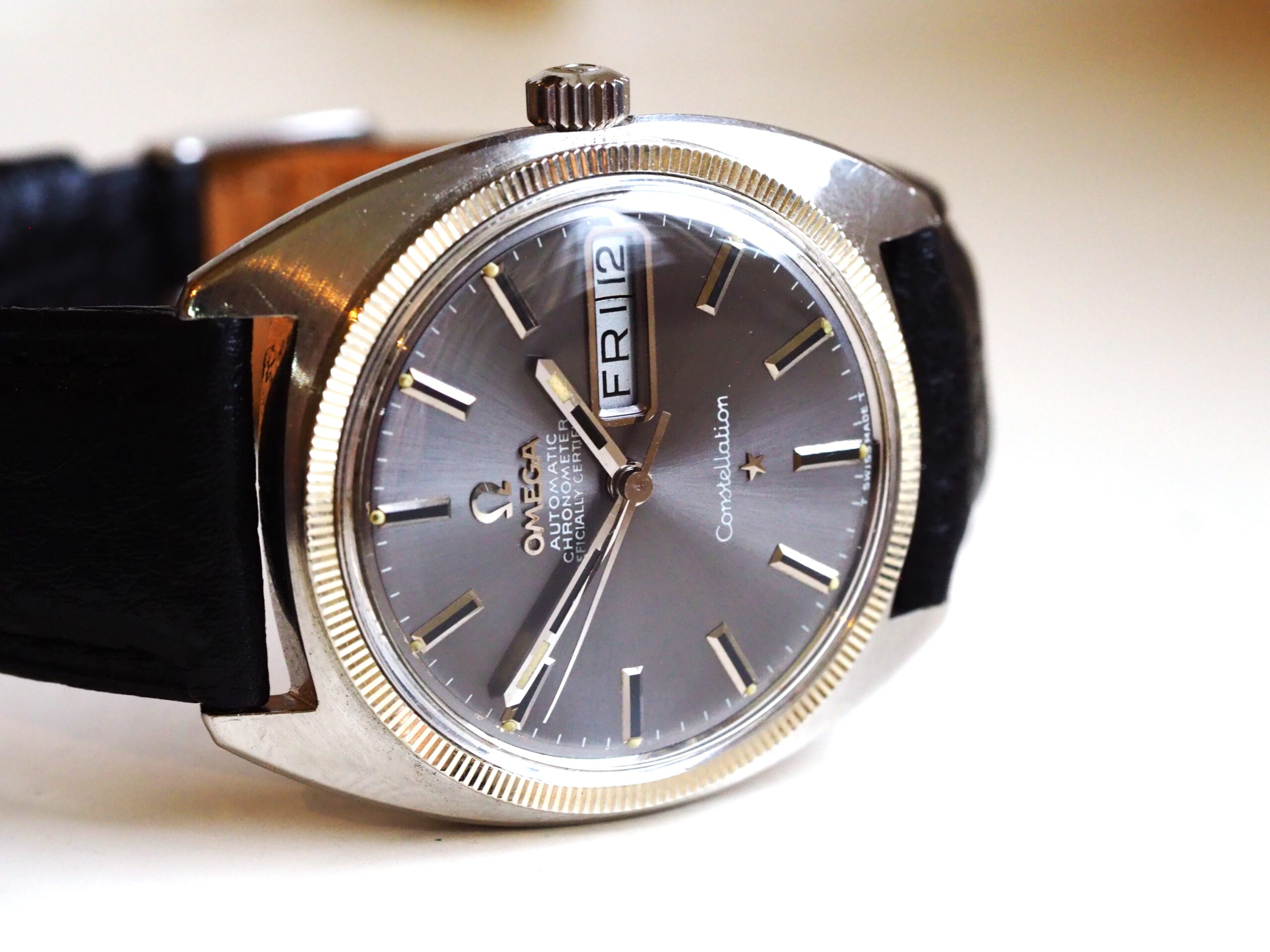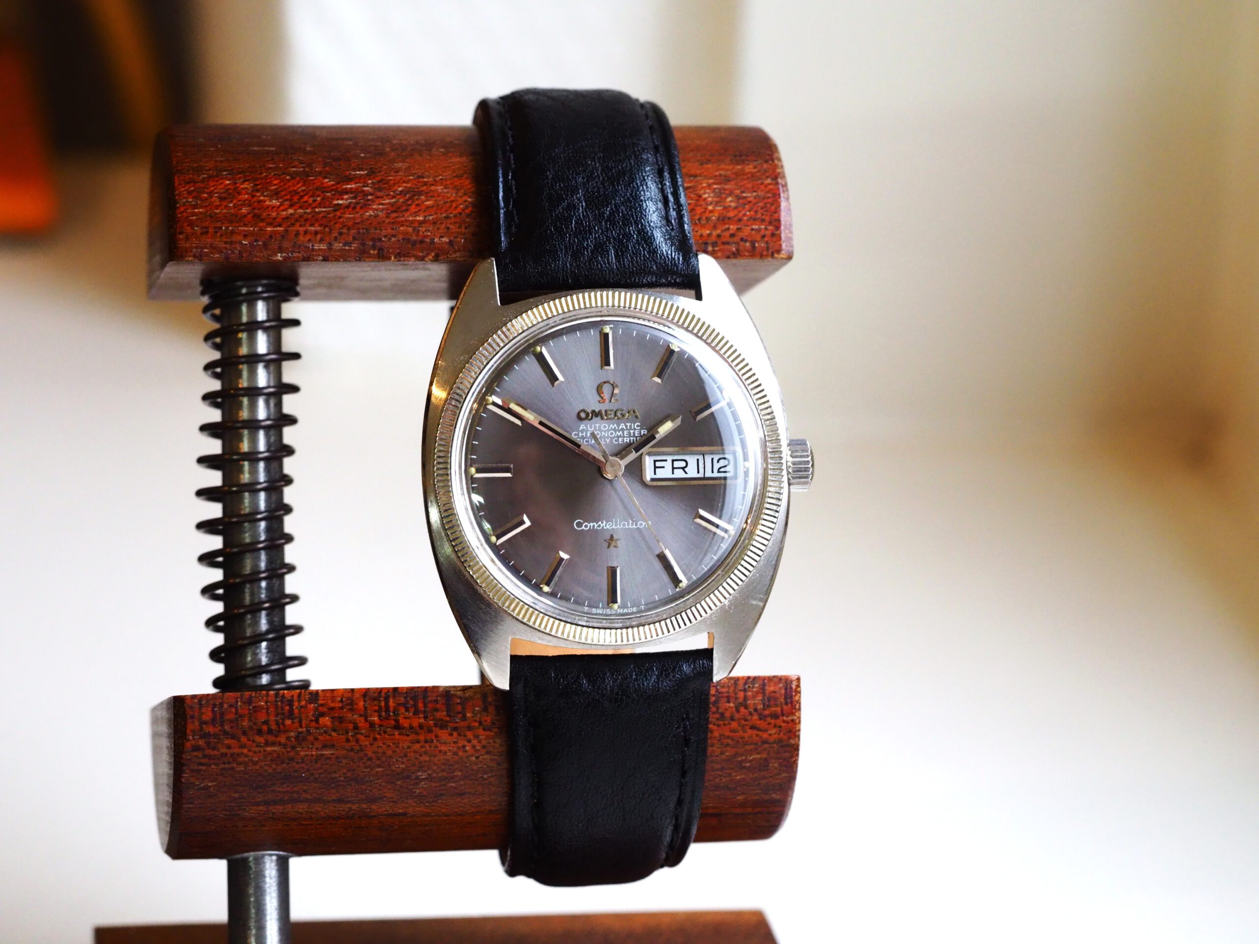 Referentie 168.029 Omega Constellation Automatic, serienummer 31945785 productiejaar 1970. Prachtige vintage C-shape Constellation in goede staat met stalen kast, witgouden lunette en volledig geserviced uurwerk. Zeer fraaie wijzerplaat met grijze sunburst, zwarte accenten en tritium lumen. In combinatie met de witgouden lunette is dit naar mijn mening een van de mooiste uitvoeringen van de C-shape Constellation. In de kast vinden we een Omega 751 automatisch uurwerk (datum en weekdag, quick-set voor datum) welke net volledig is geserviced (december 2025) en zeer goed functioneert. Tijdens deze service is tevens de kast ultrasoon gereinigd en voorzien van een nieuwe zwarte leren band. Over het algemeen verkeert het horloge in goede staat met een scherpe, ongepolijste kast en lunette. Het plexiglas, de band en gesp zijn niet origineel van Omega. Kastdiameter 34,5mm zonder kroon.