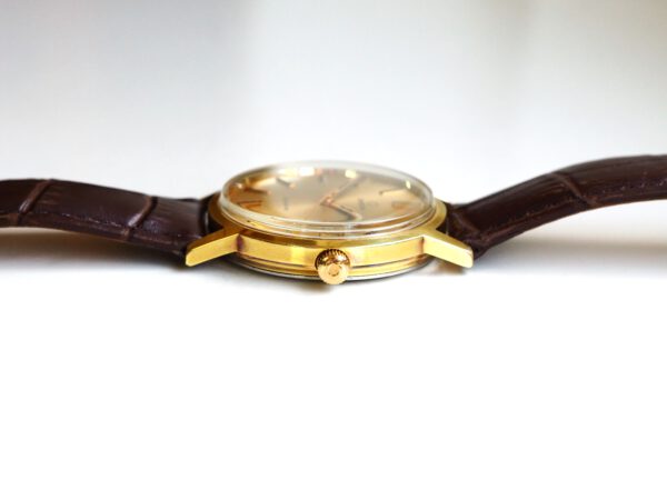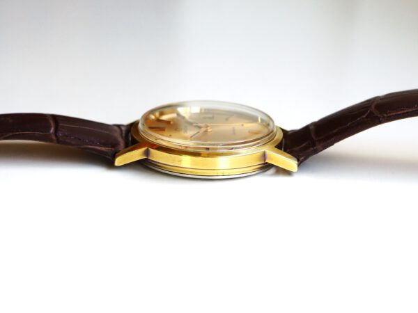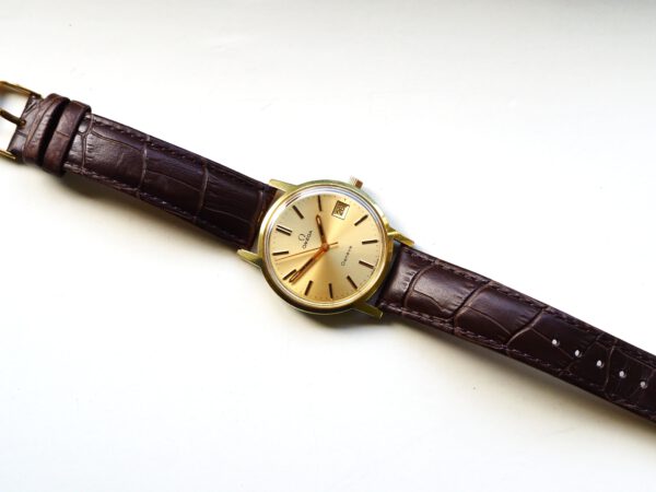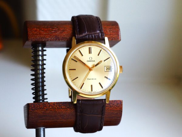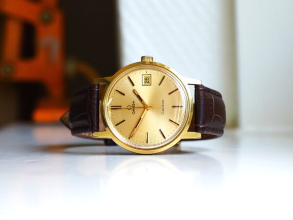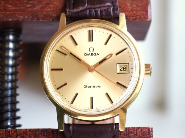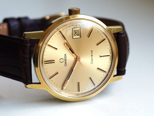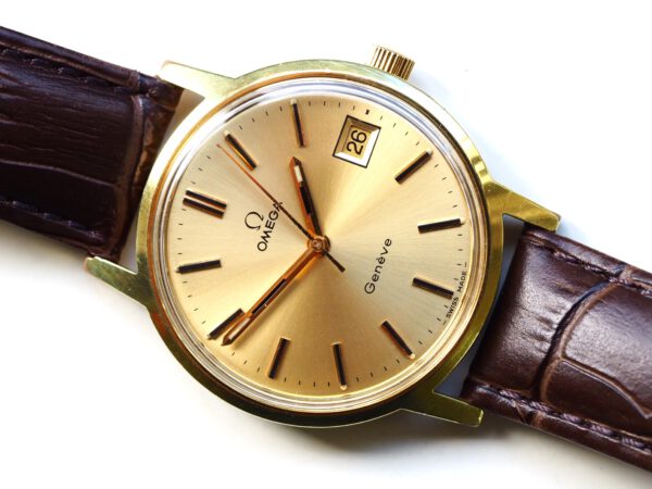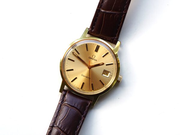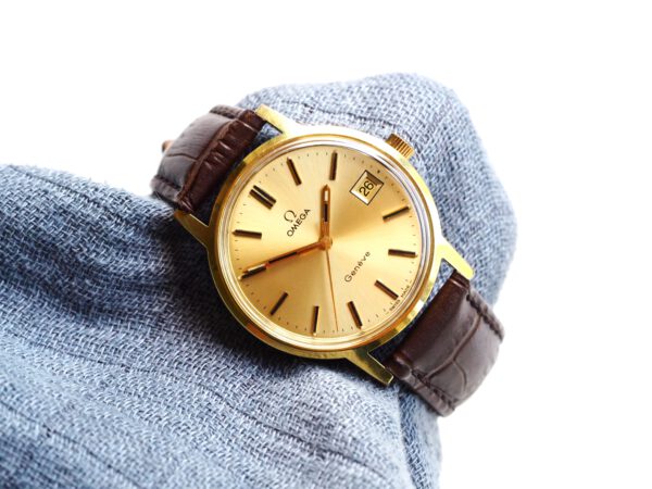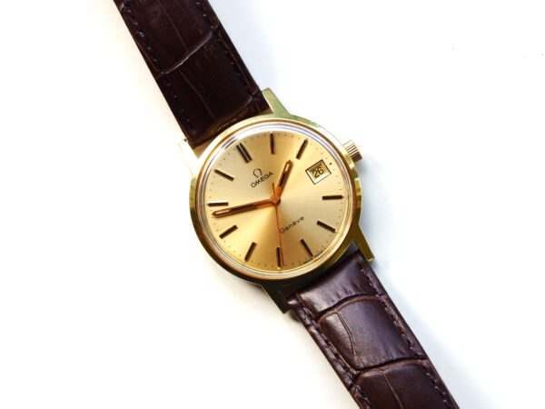 Referentie 136.0099 Omega Genève, serienummer 35798819 productiejaar 1972. Prachtige vintage Omega met 20 micron vergulde kast, Omega gesigneerde kroon/plexiglas en volledig geserviced uurwerk. De goudkleurige sunburst wijzerplaat verkeert in zeer goede staat met tritium lumen en opgelegde uur markeringen. In de kast vinden we een Omega 1030 hand opgewonden uurwerk (datum met quick-set en hacking functie) welke net volledig is geserviced (september 2025) en zeer goed functioneert. Tijdens deze service is de kast tevens ultrasoon gereinigd, voorzien van een nieuwe bruine leren band en is het originele plexiglas gepolijst. Al met al een prachtig horloge met slechts lichte gebruikssporen. Kastdiameter 35mm zonder kroon.