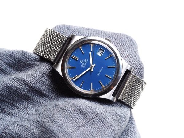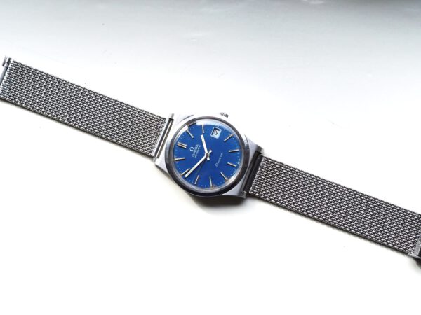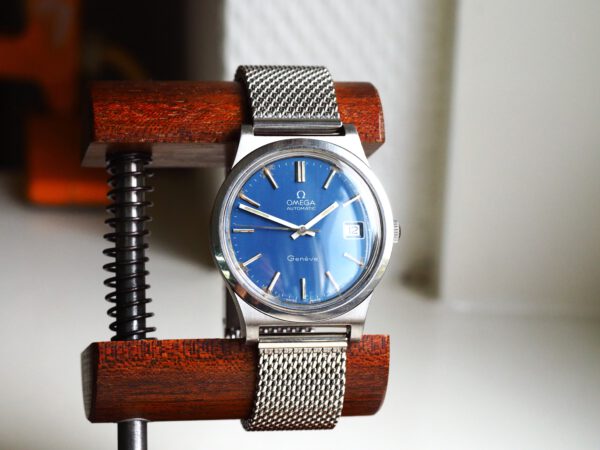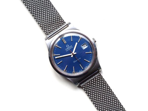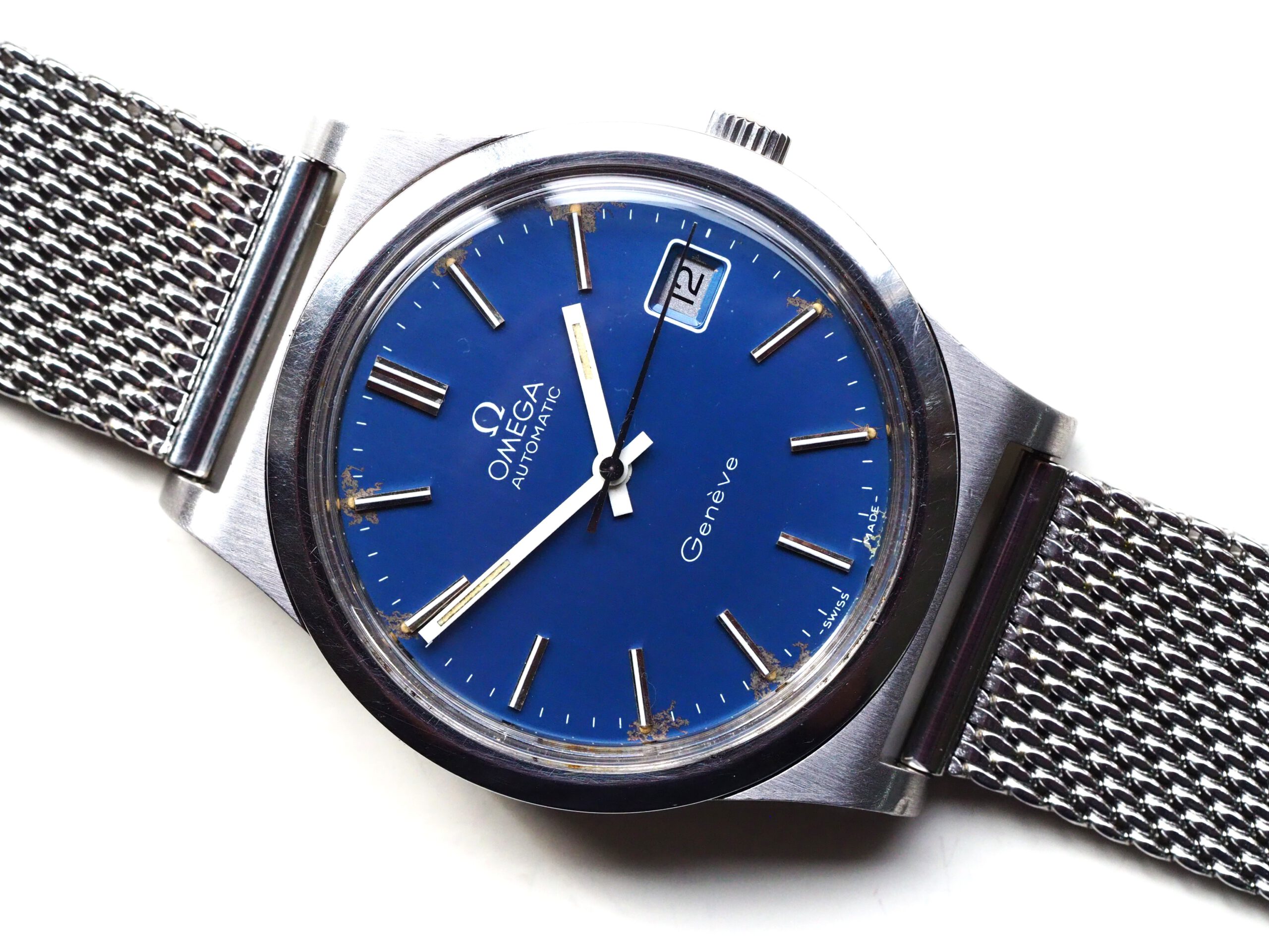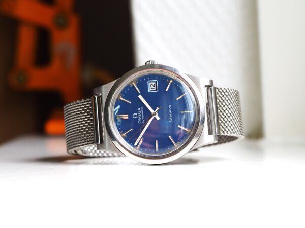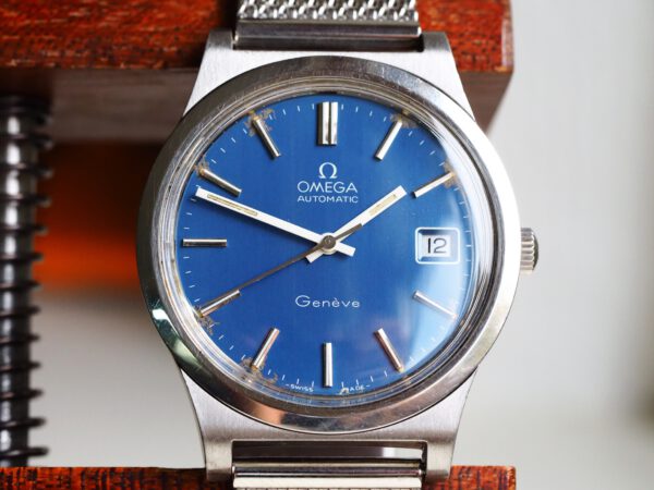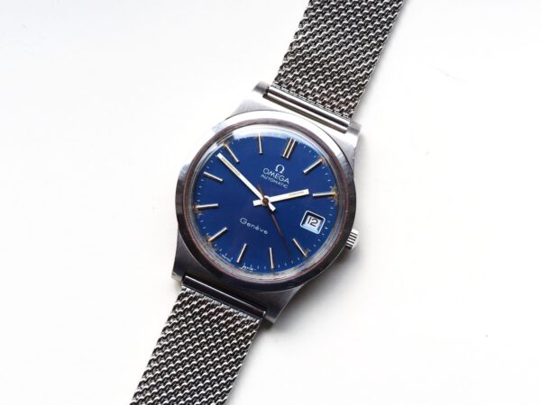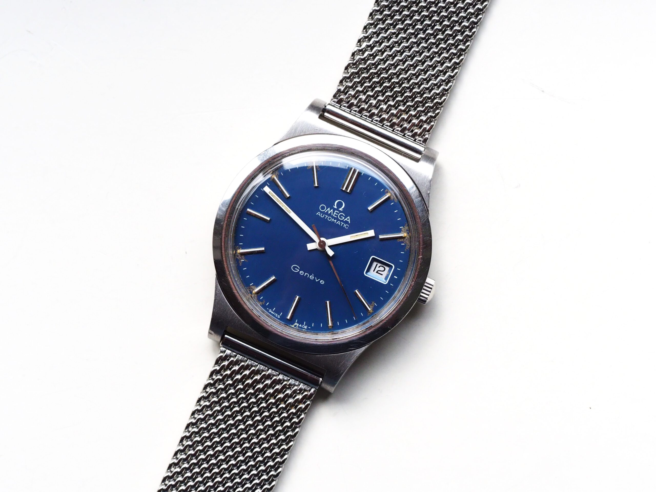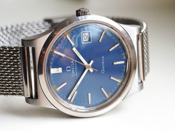 Referentie 166.0168 Omega Genève Automatic, serienummer 36809557 productiejaar 1973. Prachtige vintage Omega in goede staat met een grote stalen kast (36mm zonder kroon), originele Omega gesigneerde kroon/plexiglas en volledig geserviced uurwerk. Interessante blauwe wijzerplaat welke erom bekend staan dat ze door de jaren heen van kleur kunnen veranderen. Dit exemplaar begint rond het tritium lumen een beetje goudkleurig te worden. In de kast vinden we een Omega 1012 automatisch uurwerk (datum met quick-set en hacking functie) welke net volledig is geserviced (oktober 2025) en zeer goed functioneert. Tijdens deze service is de kast ook ultrasoon gereinigd en voorzien van een milanese band.