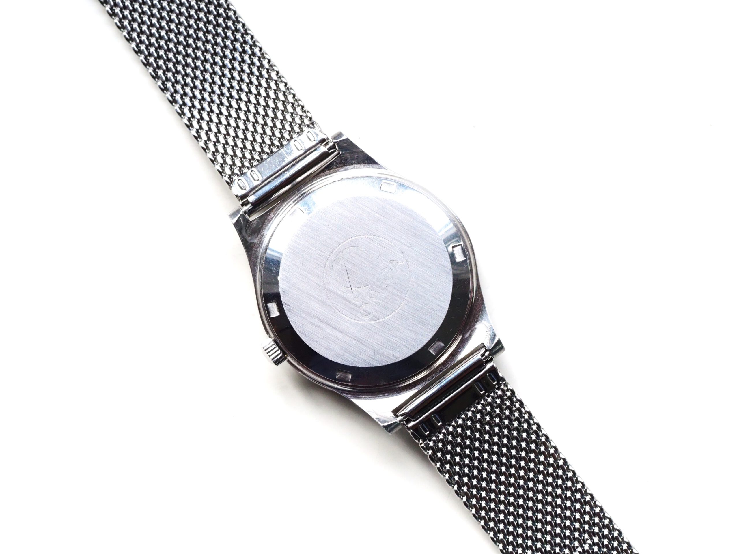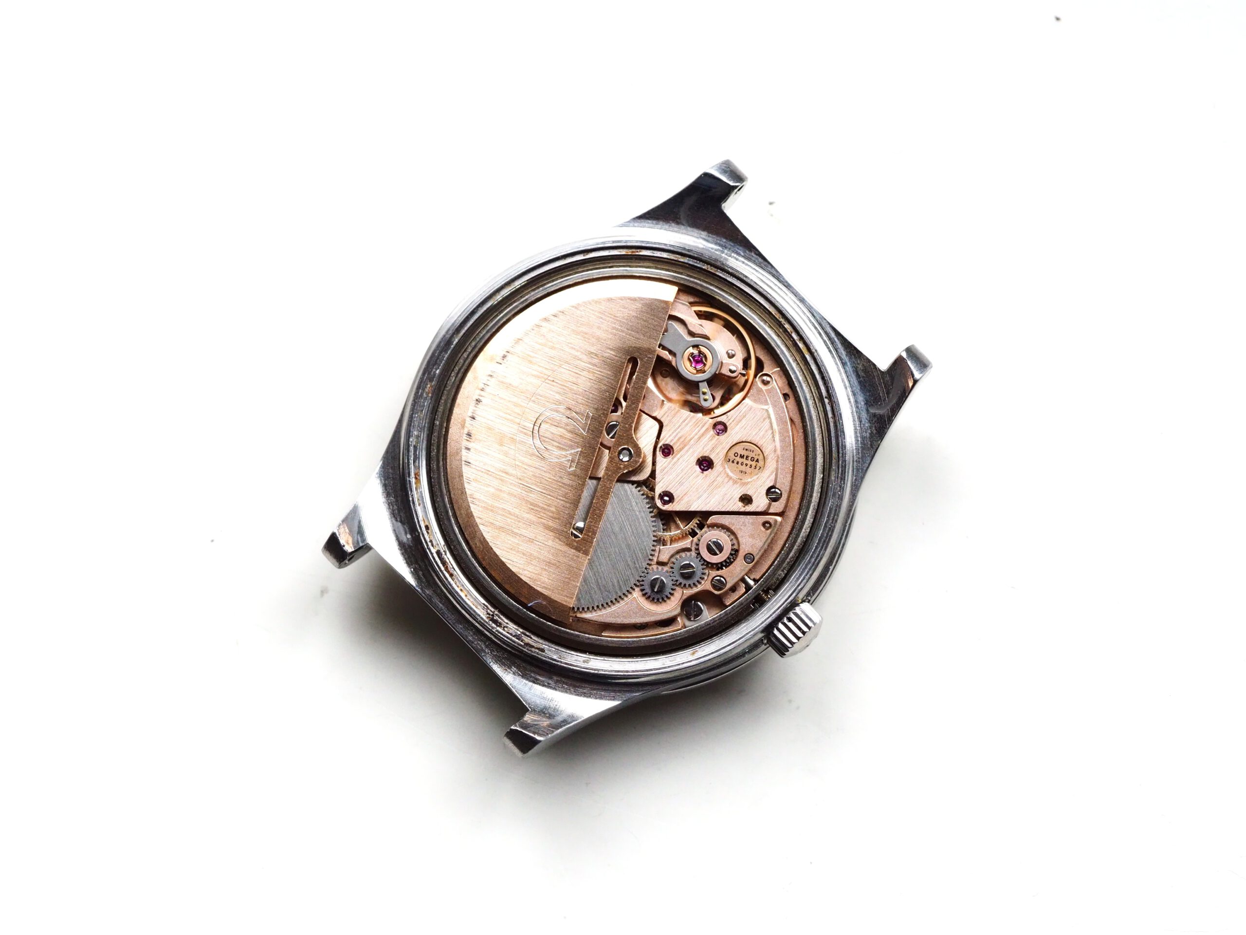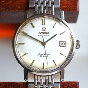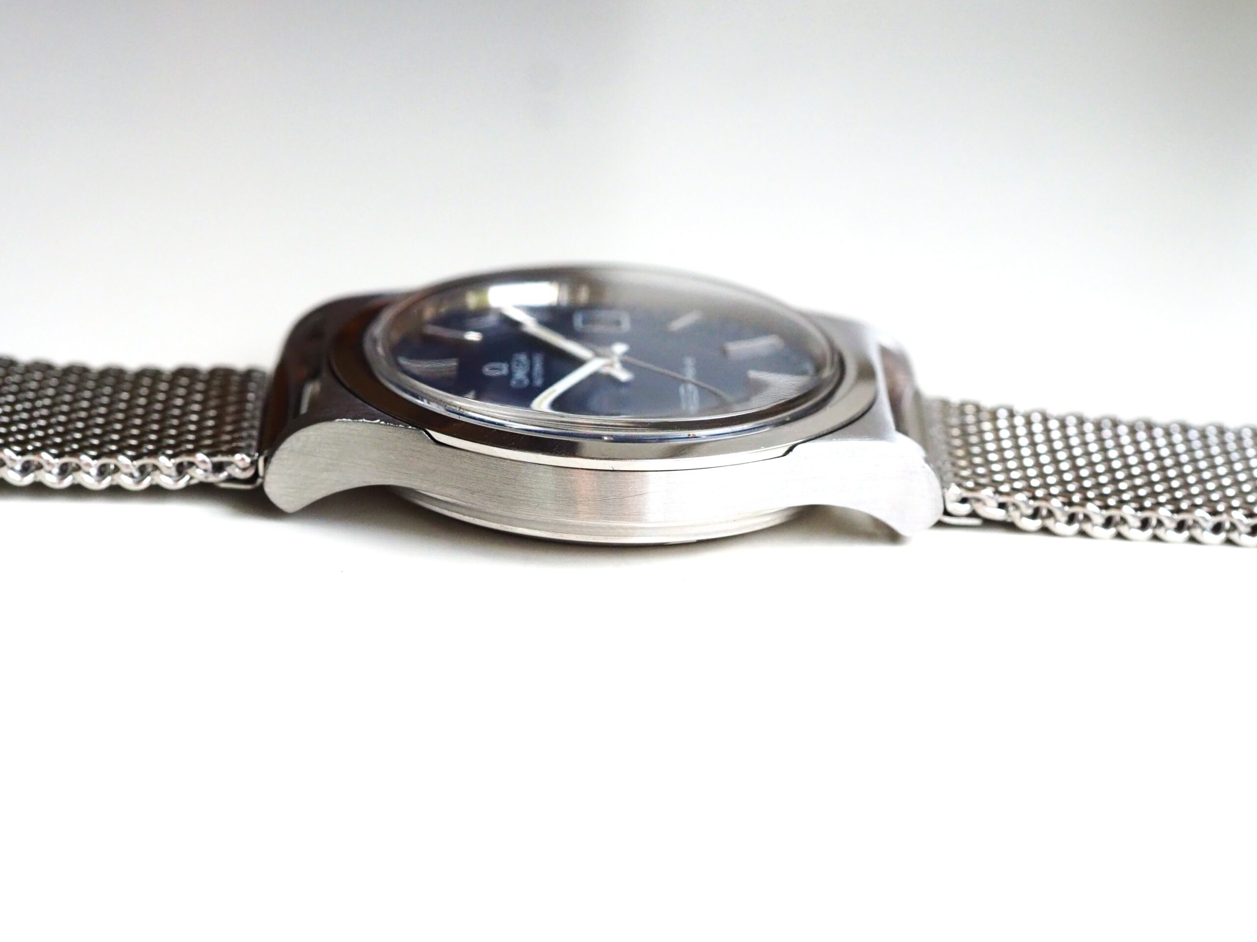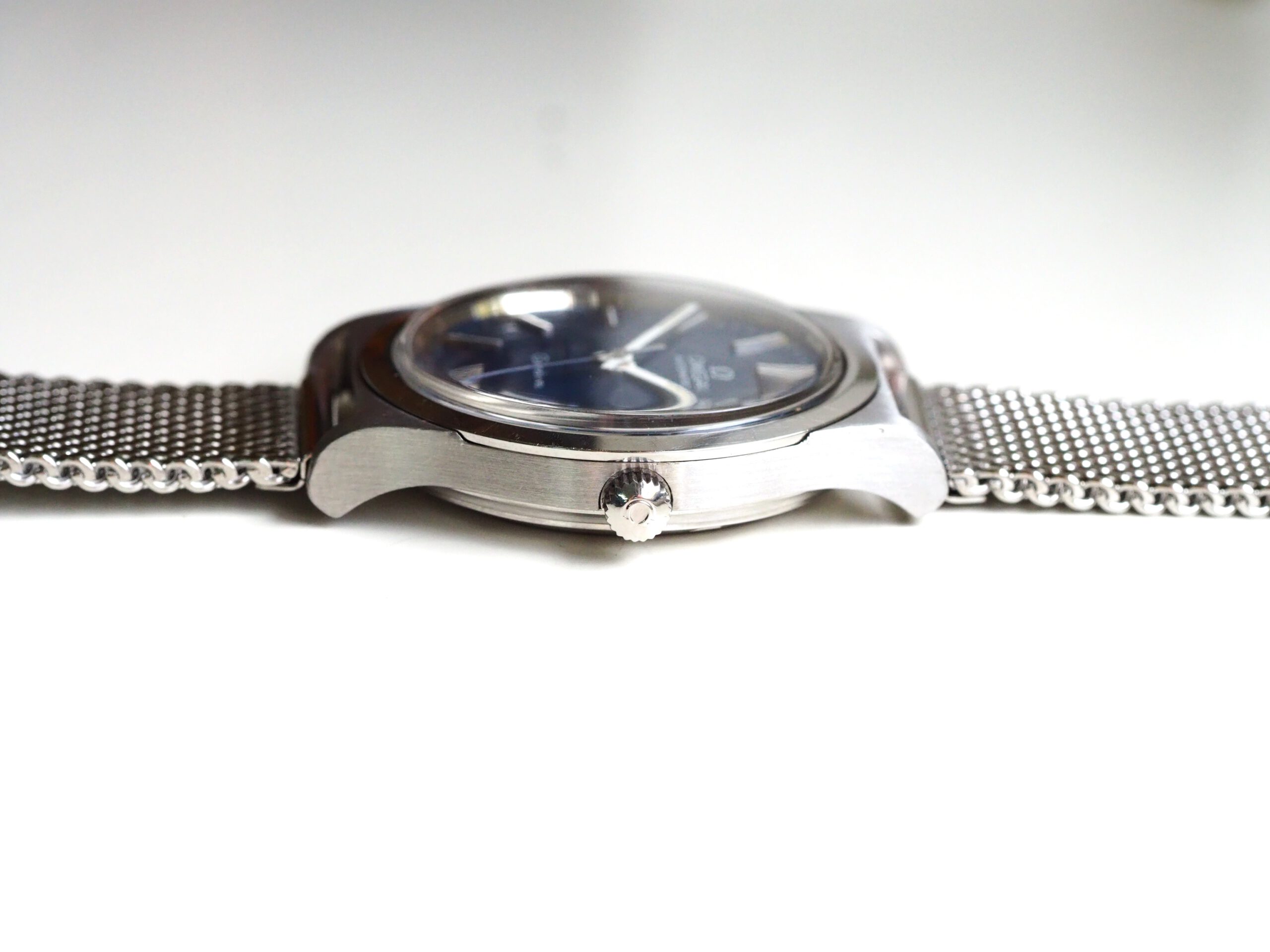 Referentie 166.0168 Omega Genève Automatic, serienummer 36809557 productiejaar 1973. Prachtige vintage Omega in goede staat met een grote stalen kast (36mm zonder kroon), originele Omega gesigneerde kroon/plexiglas en volledig geserviced uurwerk. Interessante blauwe wijzerplaat welke erom bekend staan dat ze door de jaren heen van kleur kunnen veranderen. Dit exemplaar begint rond het tritium lumen een beetje goudkleurig te worden. In de kast vinden we een Omega 1012 automatisch uurwerk (datum met quick-set en hacking functie) welke net volledig is geserviced (oktober 2025) en zeer goed functioneert. Tijdens deze service is de kast ook ultrasoon gereinigd en voorzien van een milanese band.