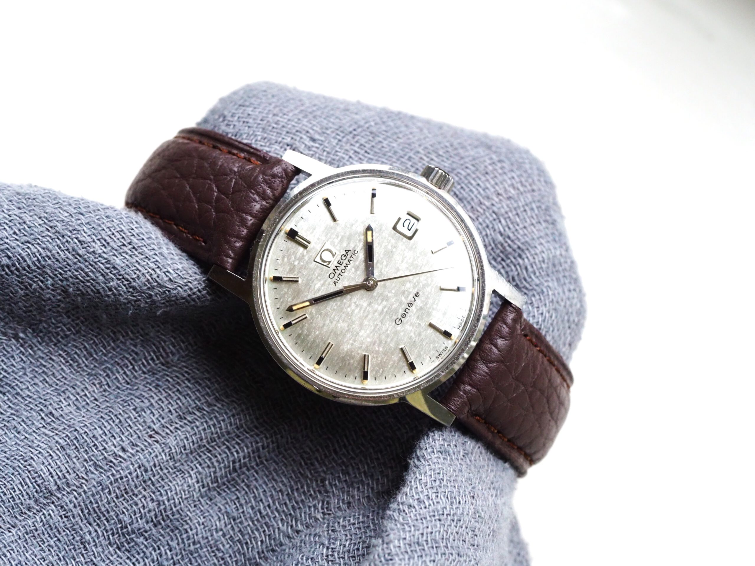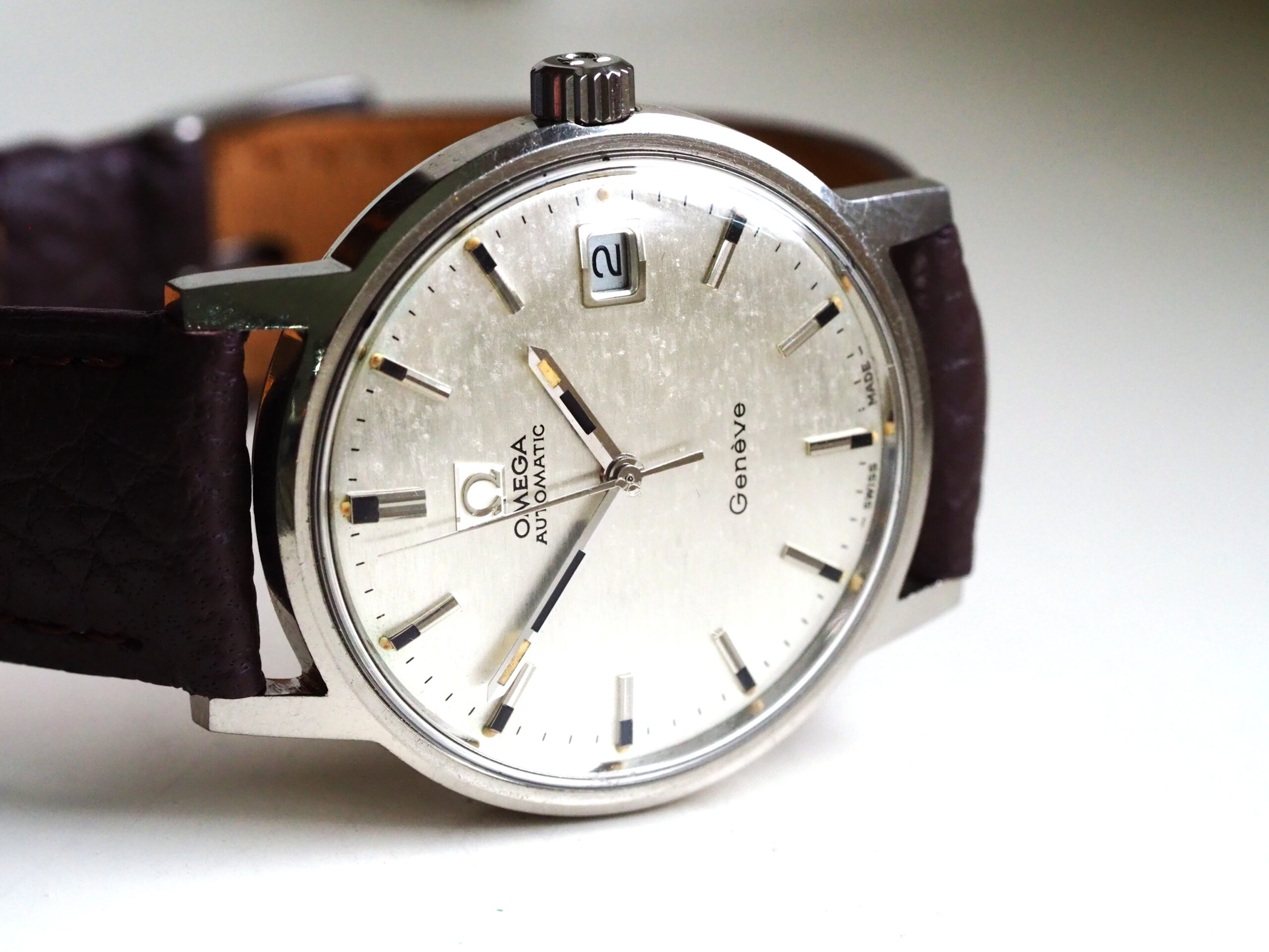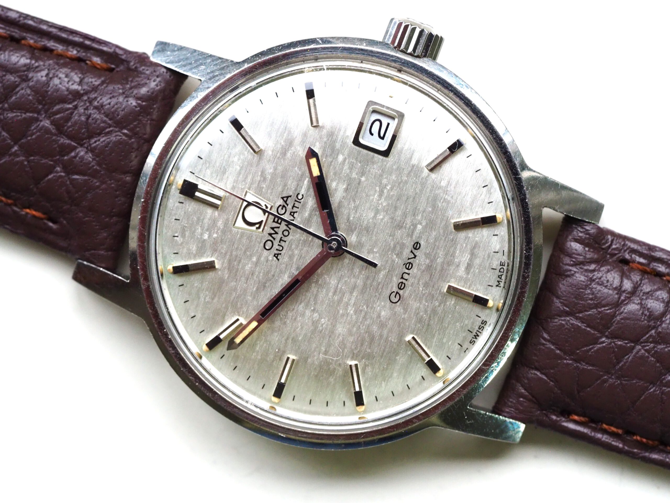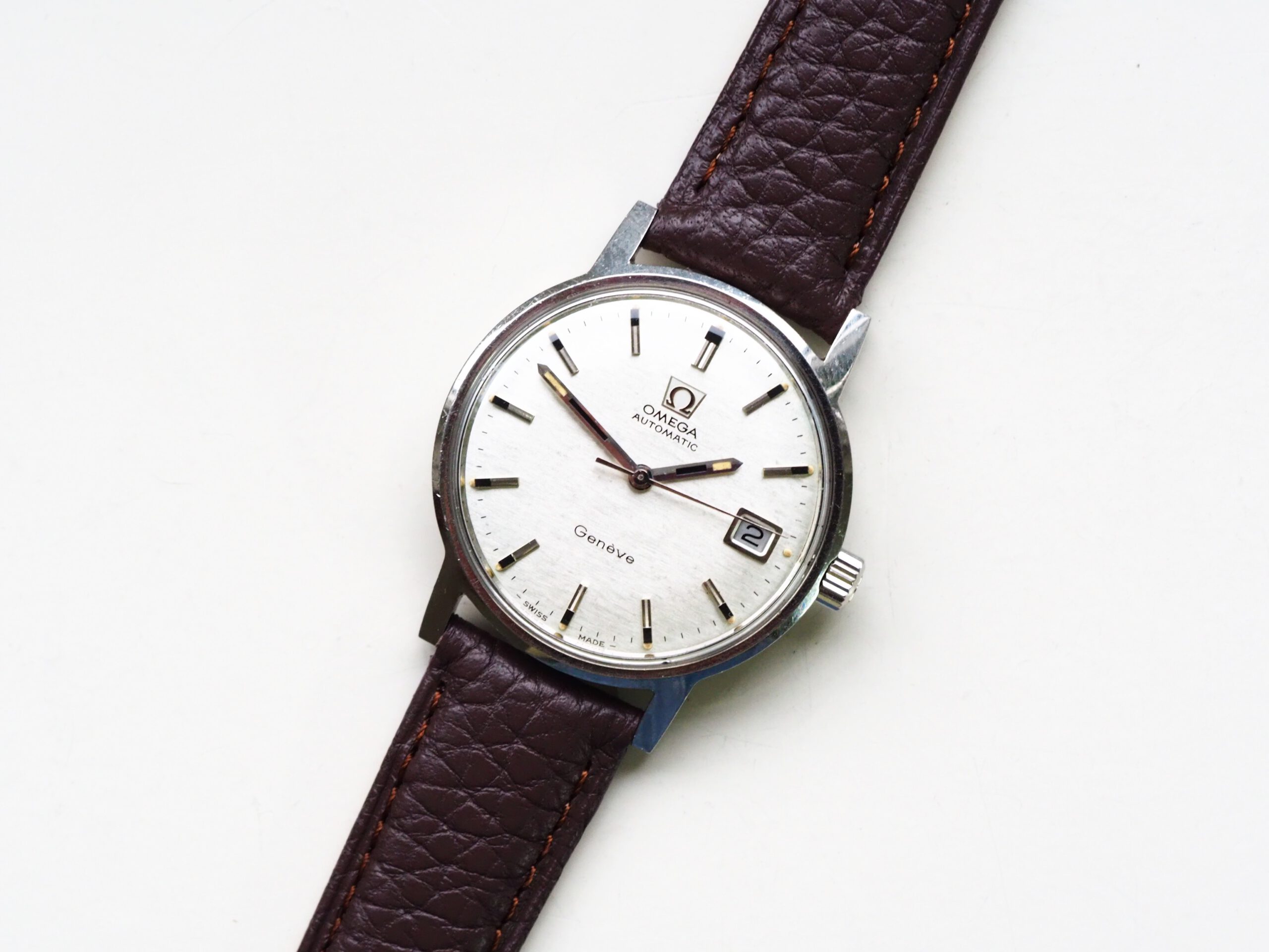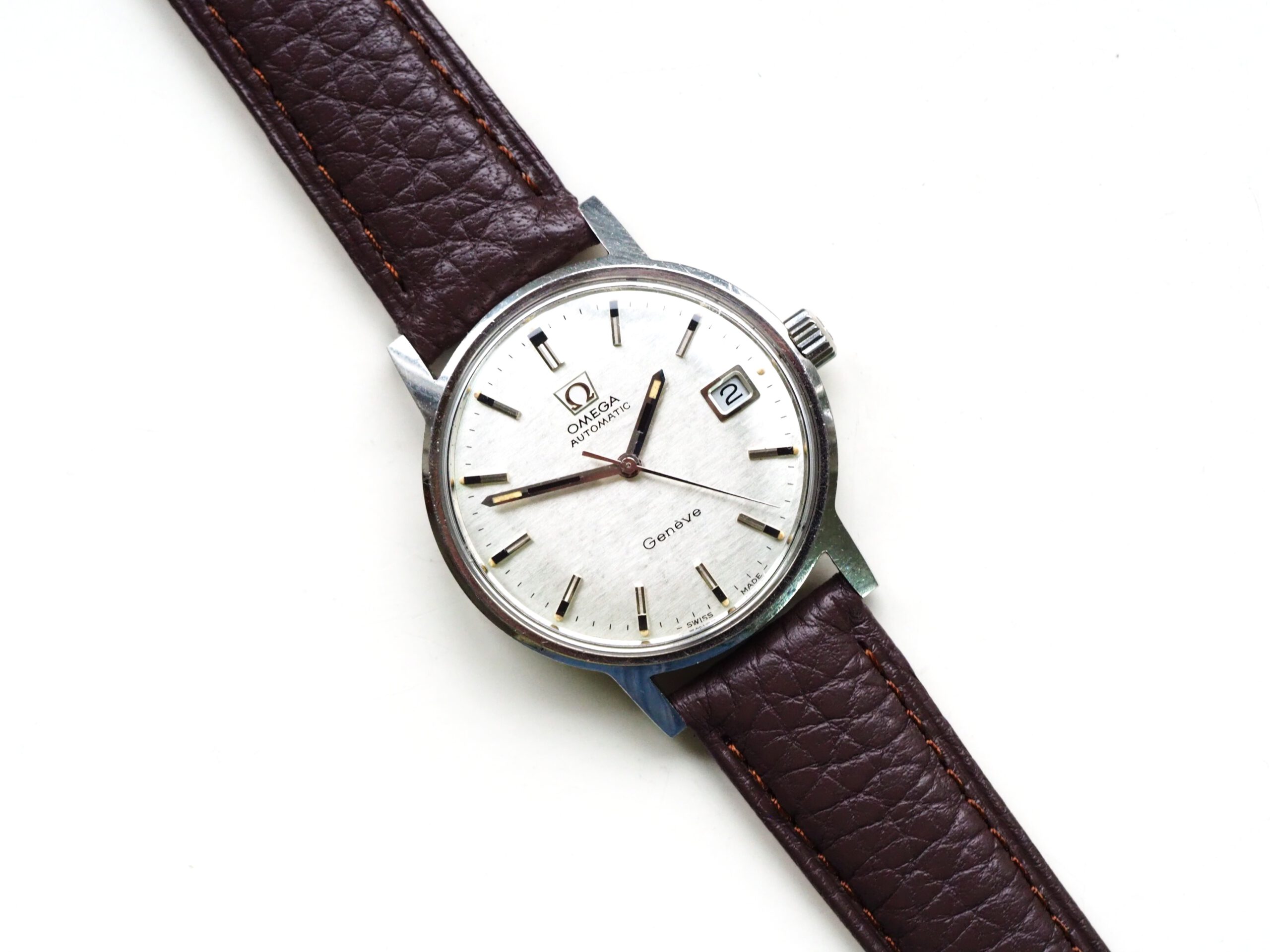 Referentie 166.070 Omega Genève Automatic, serienummer 31465397 productiejaar 1970. Prachtige vintage Omega in zeer goede originele staat met stalen kast, Omega gesigneerde kroon/plexiglas en volledig geserviced uurwerk. Het horloge heeft een prachtige wijzerplaat met een fraaie structuur, groot opgelegd Omega logo en tritium lumen. In de kast vinden we een Omega 565 automatisch uurwerk (datum met quick-set) welke net volledig is geserviced (november 2025) en zeer goed functioneert. Tijdens deze service is de kast ook ultrasoon gereinigd en voorzien van een nieuwe bruine leren band. Over het algemeen zeer goede staat met slechts milde gebruikssporen voor een 55 jaar oud horloge. Kastdiameter 35mm zonder kroon.