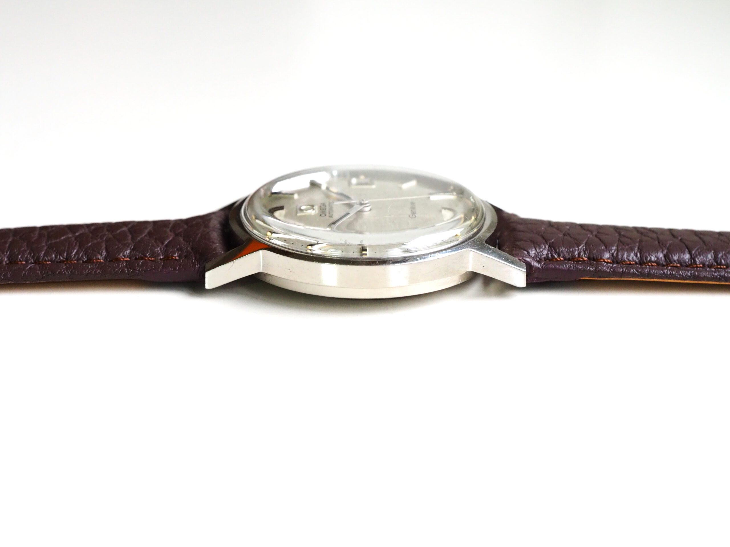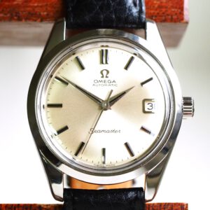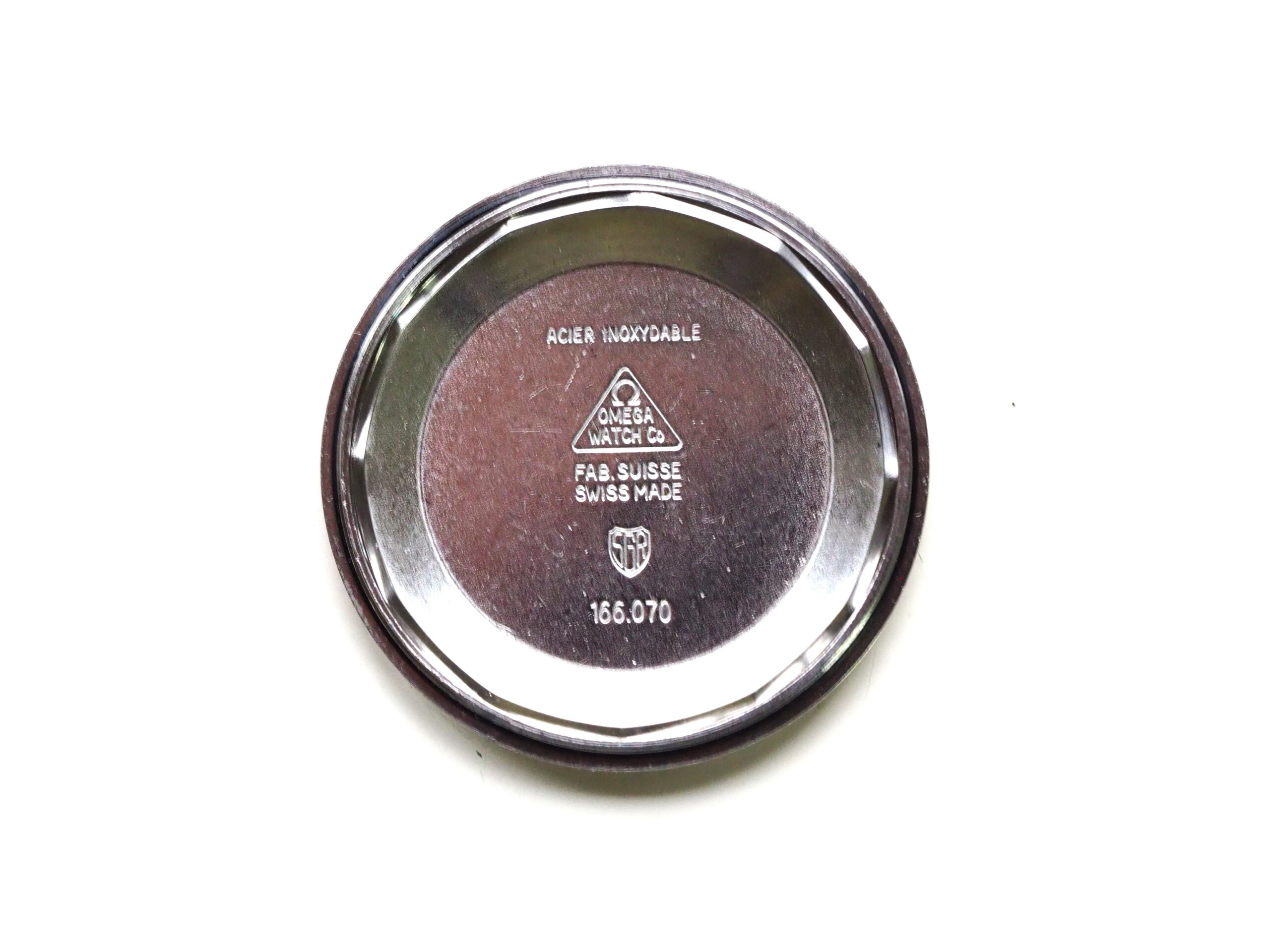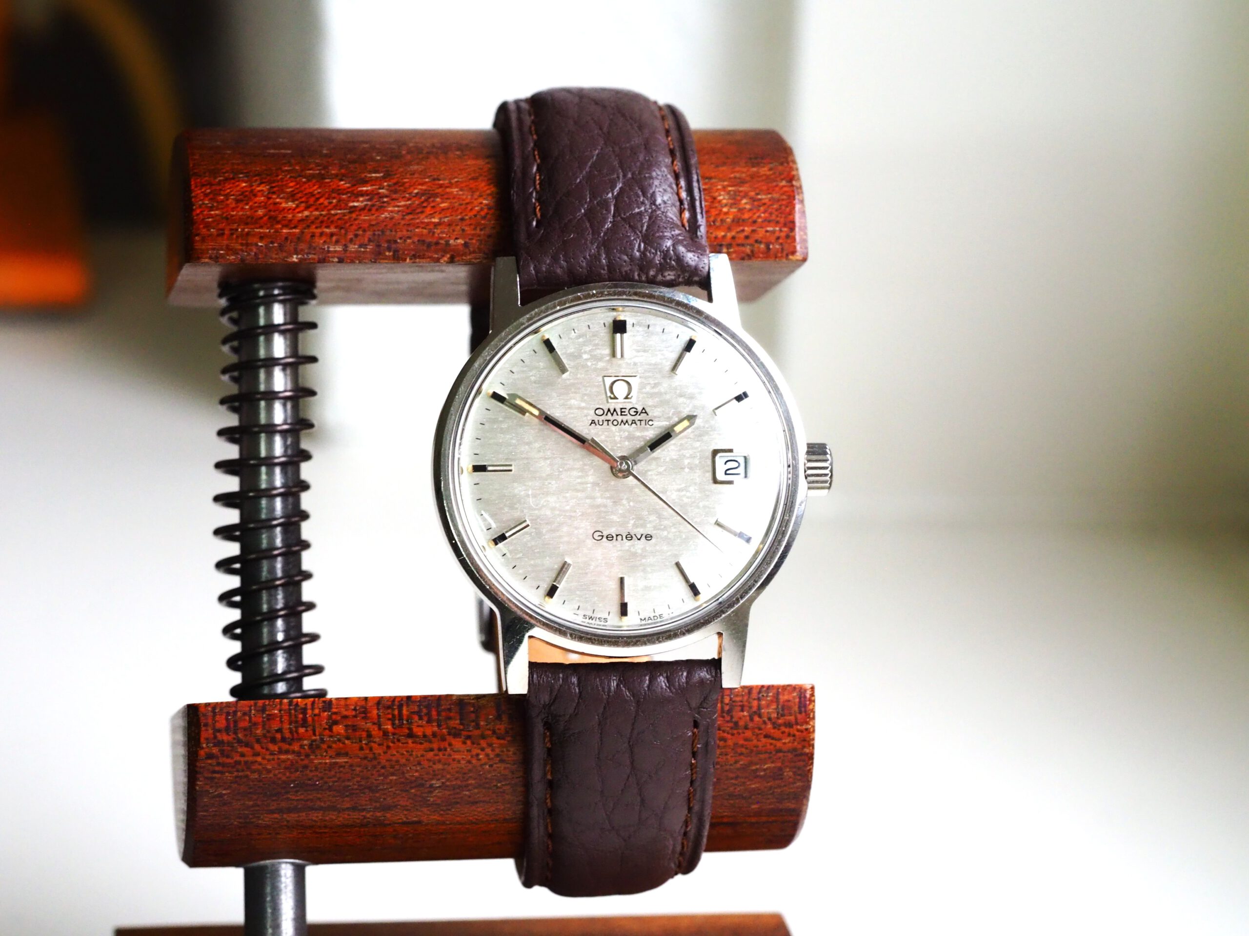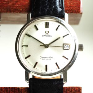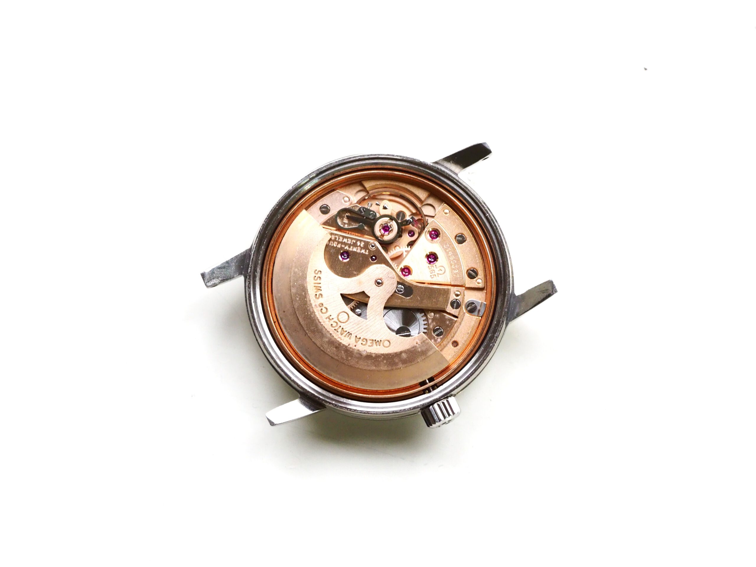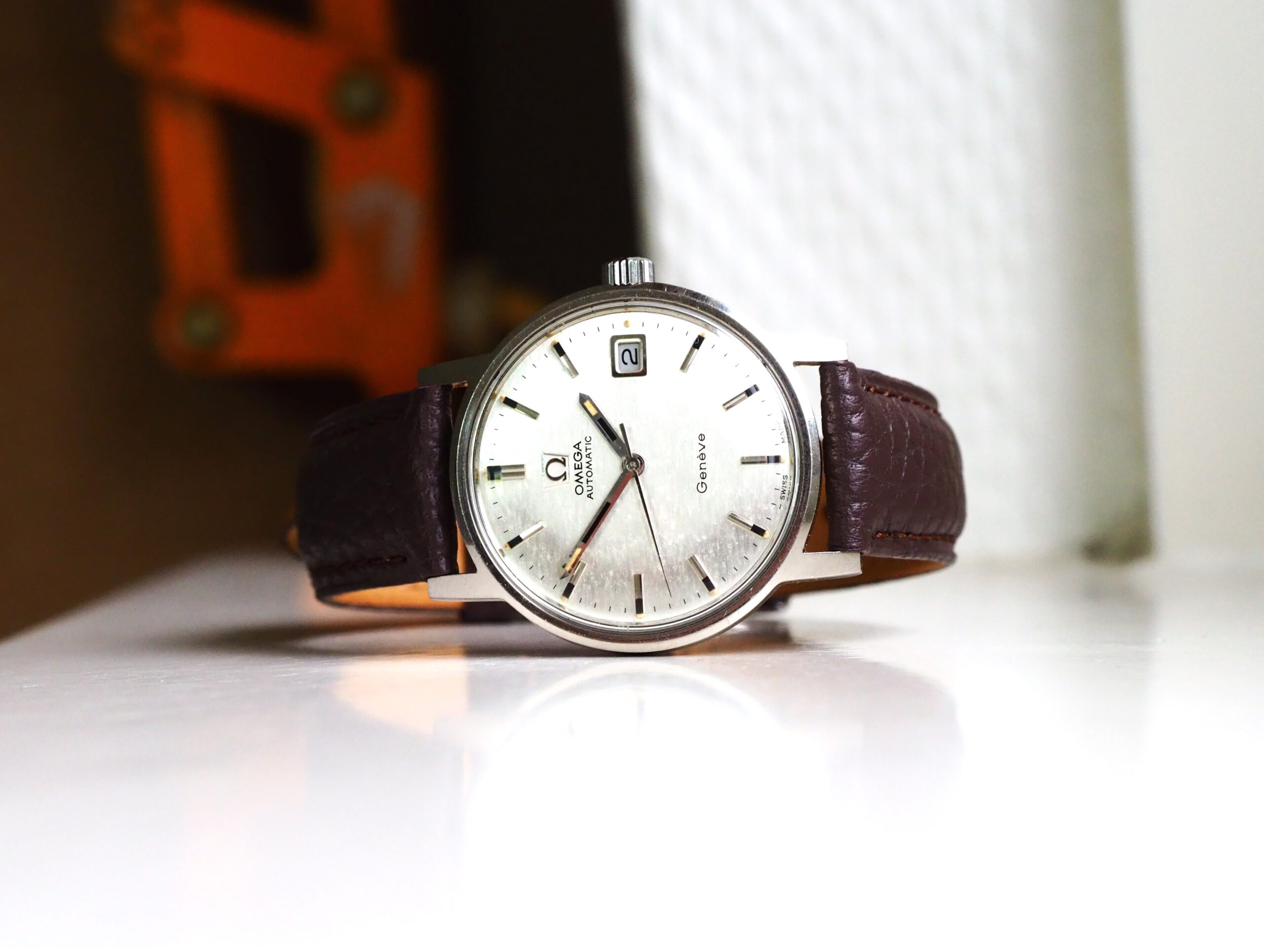 Referentie 166.070 Omega Genève Automatic, serienummer 31465397 productiejaar 1970. Prachtige vintage Omega in zeer goede originele staat met stalen kast, Omega gesigneerde kroon/plexiglas en volledig geserviced uurwerk. Het horloge heeft een prachtige wijzerplaat met een fraaie structuur, groot opgelegd Omega logo en tritium lumen. In de kast vinden we een Omega 565 automatisch uurwerk (datum met quick-set) welke net volledig is geserviced (november 2025) en zeer goed functioneert. Tijdens deze service is de kast ook ultrasoon gereinigd en voorzien van een nieuwe bruine leren band. Over het algemeen zeer goede staat met slechts milde gebruikssporen voor een 55 jaar oud horloge. Kastdiameter 35mm zonder kroon.