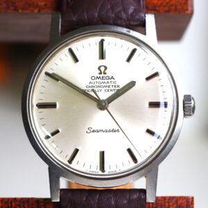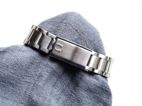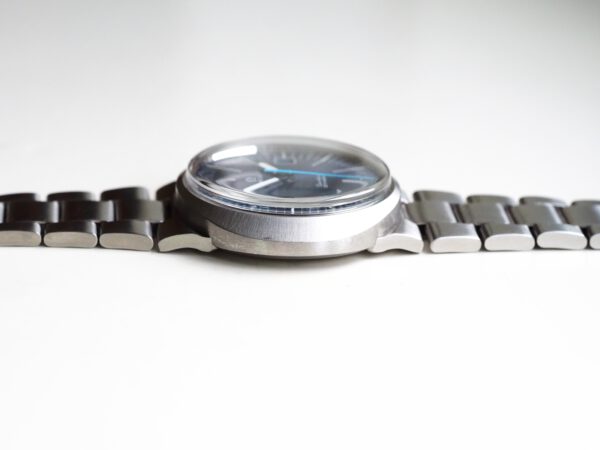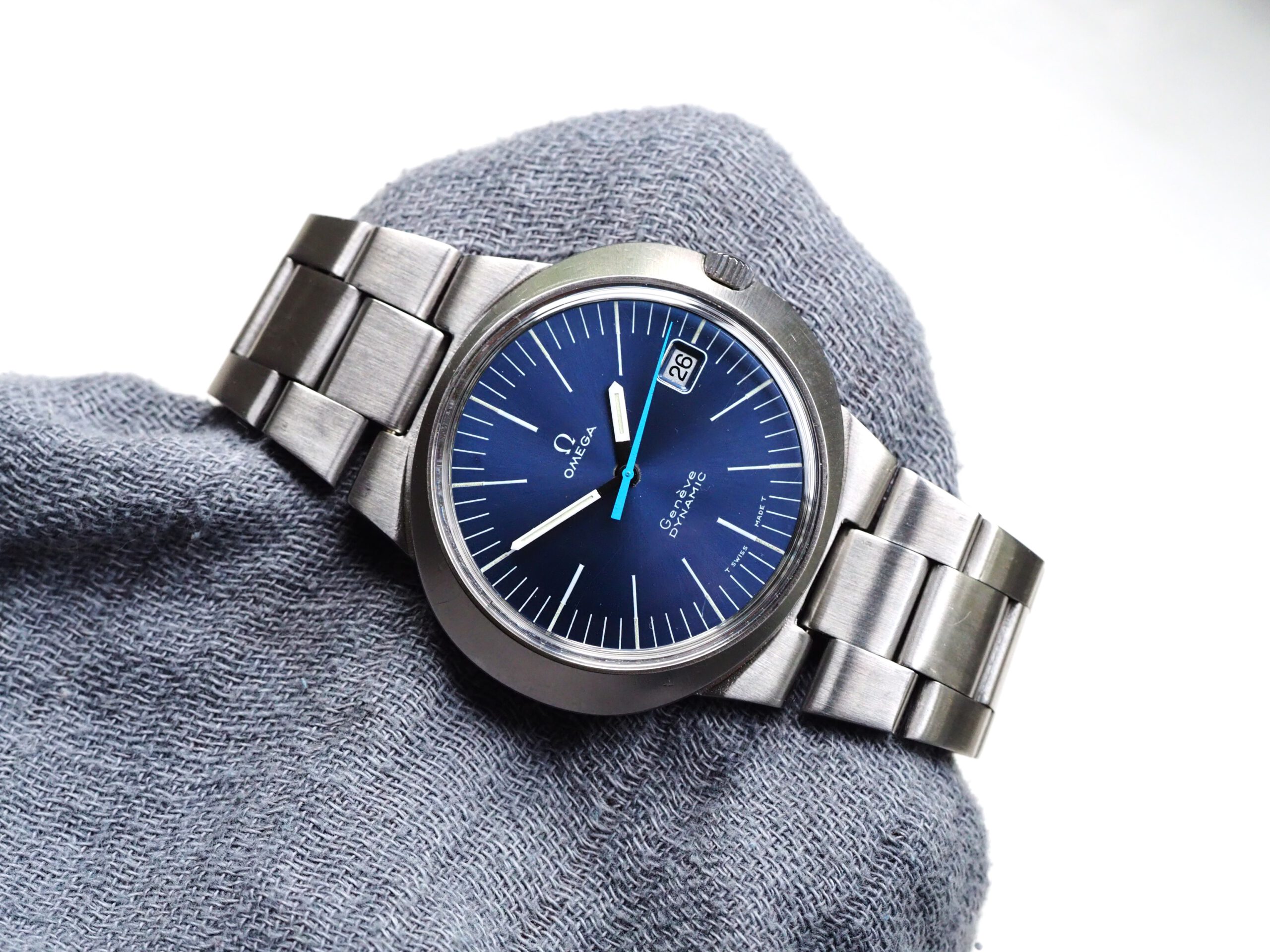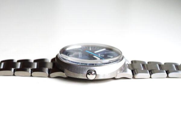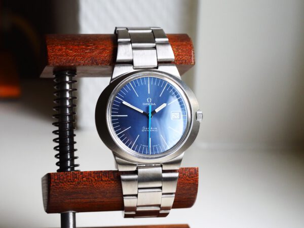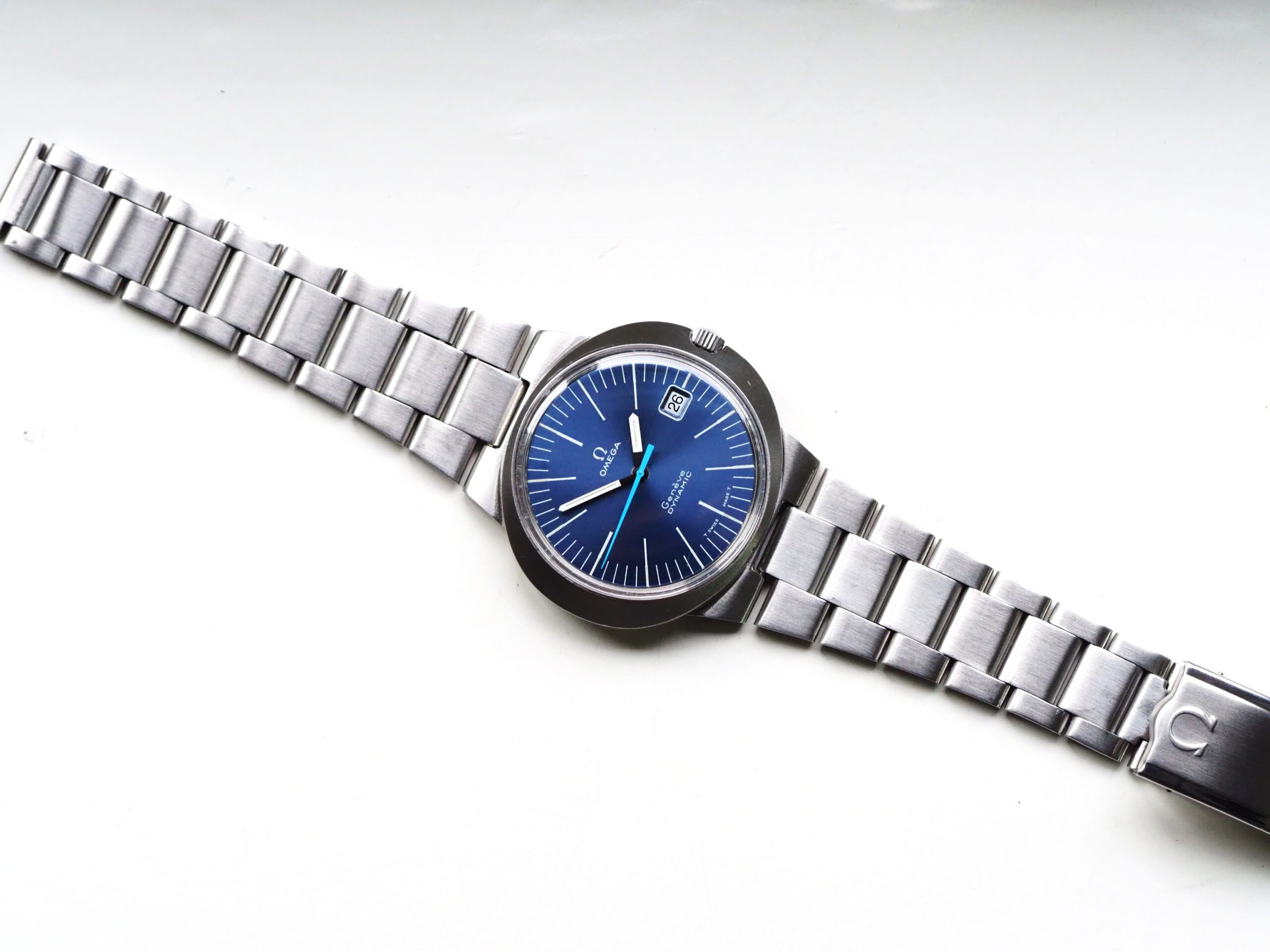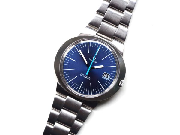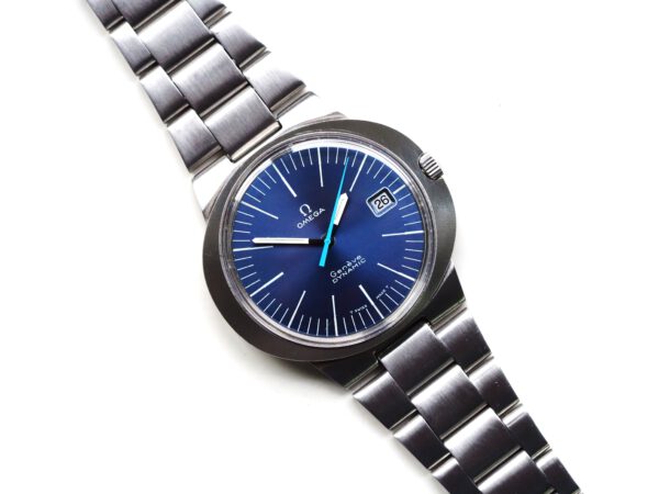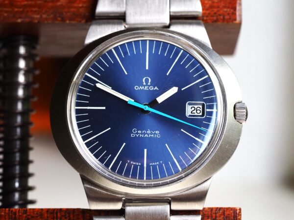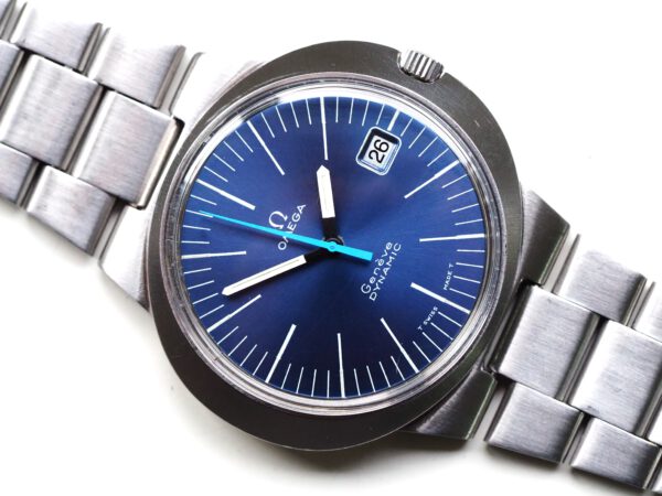 Referentie 136.033 Omega Genève Dynamic, serienummer 28820394 productiejaar 1969. Prachtige vintage Omega van roestvrij staal met een prachtige blauwe sunburst wijzerplaat, tritium lumen en volledig geserviced uurwerk. Deze Dynamic modellen werden destijds in de markt gezet om een jong publiek aan te spreken. Over het algemeen verkeert het horloge in een zeer goede staat met slechts lichte gebruikssporen. In de kast vinden we een Omega 613 hand opgewonden uurwerk (datum met quick-set) welke net volledig is geserviced (september 2025) en zeer goed functioneert. Tijdens deze service zijn de kast en band ook ultrasoon gereinigd. Het horloge heeft een originele Omega gesigneerde kroon, maar het plexiglas is niet origineel. Kastdiameter 41x36mm.