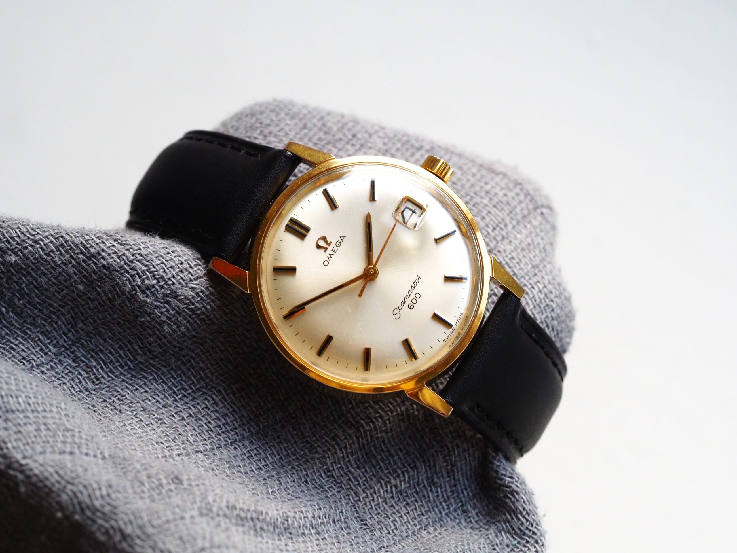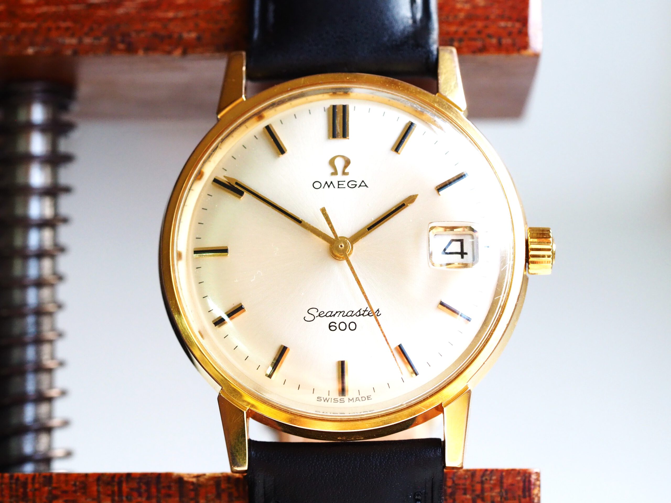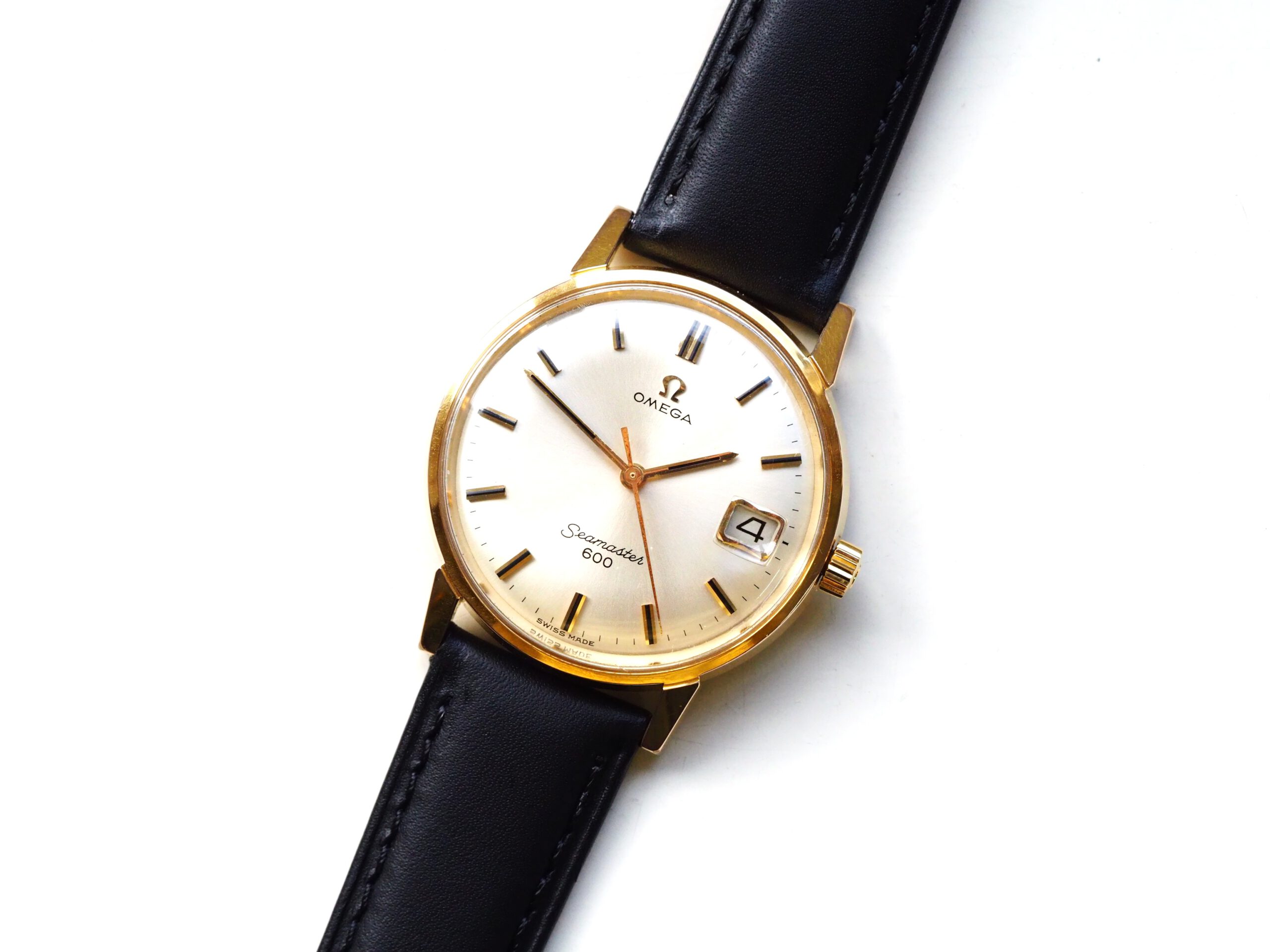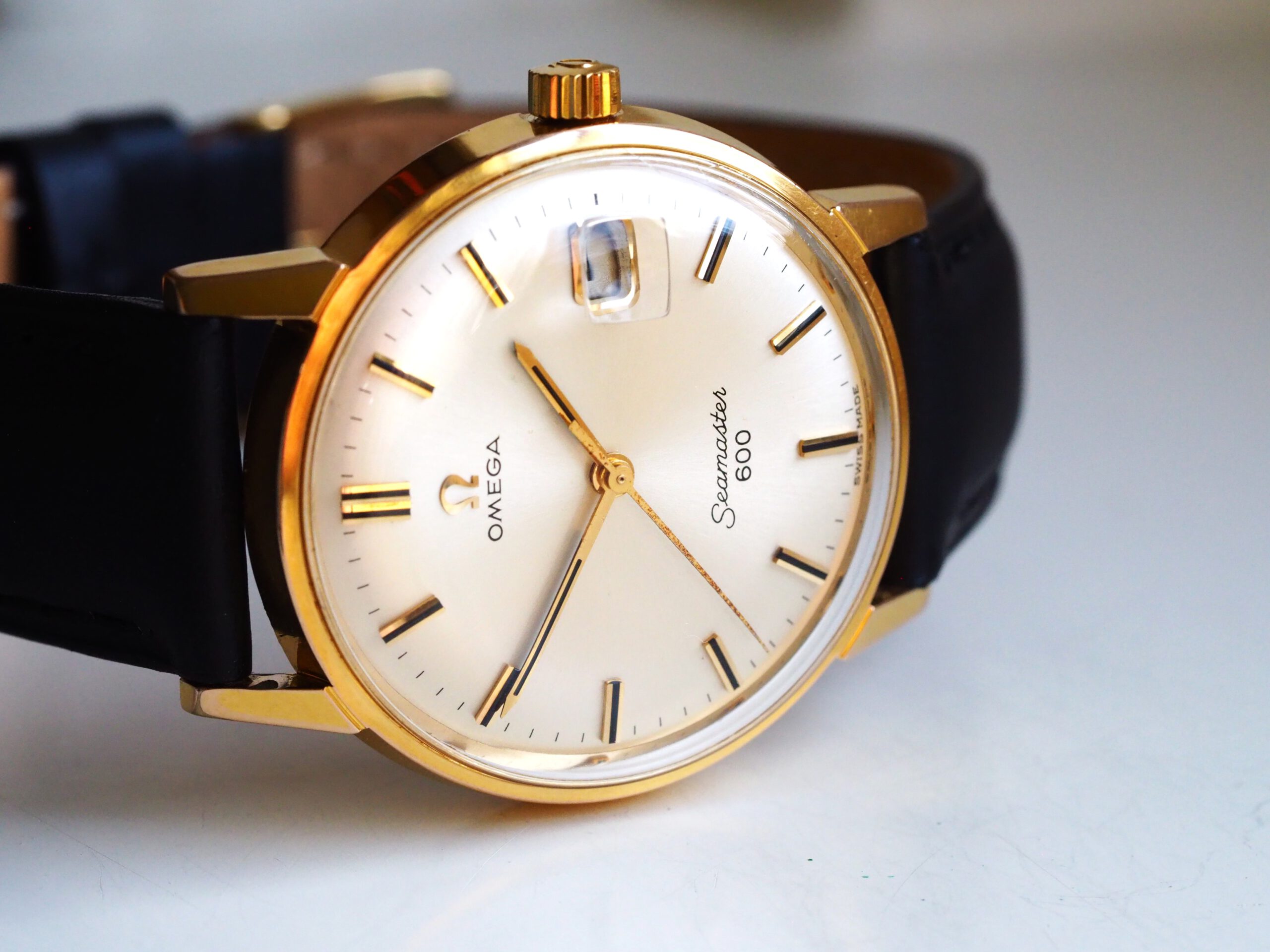 Referentie 136.011 Omega Seamaster 600, serienummer 22371788 productiejaar 1965. Prachtige vintage Seamaster 600 met 40 micron vergulde kast, origineel gesigneerde kroon/plexiglas en volledig geserviced uurwerk. Schitterende wijzerplaat met opgelegde uur markeringen met zwarte onyx inleg. Een prachtig klassiek horloge met een tijdloze uitstraling dat nooit verveelt. In de kast vinden we een Omega 611 hand opgewonden uurwerk met datumfunctie welke net volledig is geserviced (december 2025) en zeer goed functioneert. Tijdens deze service is de kast ook ultrasoon gereinigd en voorzien van een nieuwe zwarte leren band. De wijzerplaat heeft een paar kleine spikkels en er is wat oxidatie op de wijzers. Al met al een zeer mooi horloge met slechts milde gebruikssporen, zeker gezien de leeftijd. Kastdiameter 34mm zonder kroon.