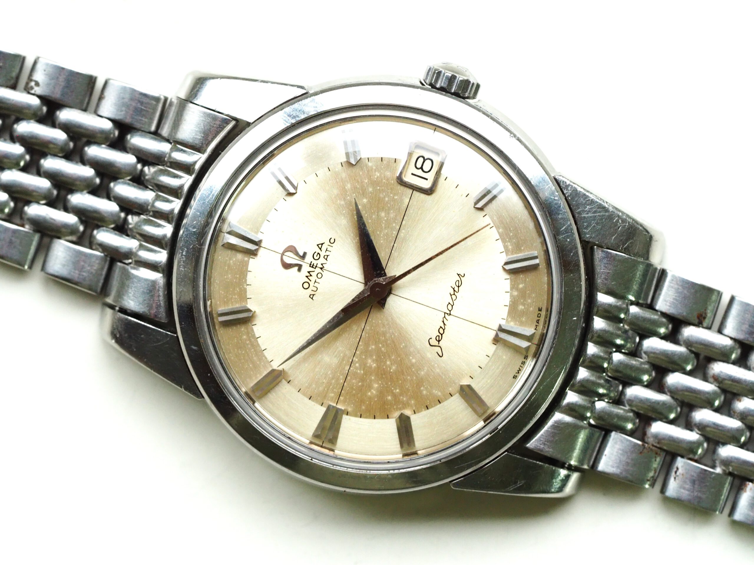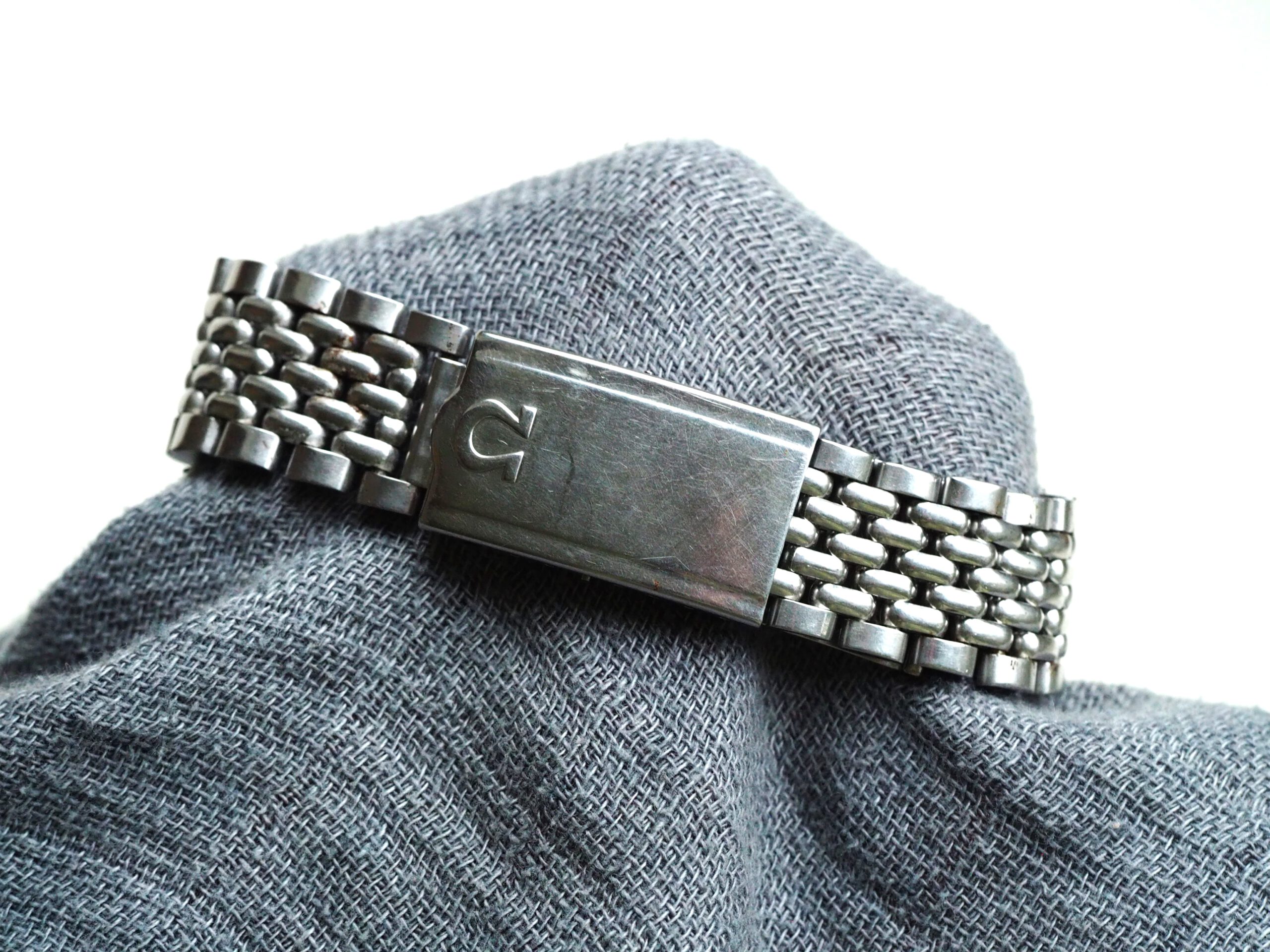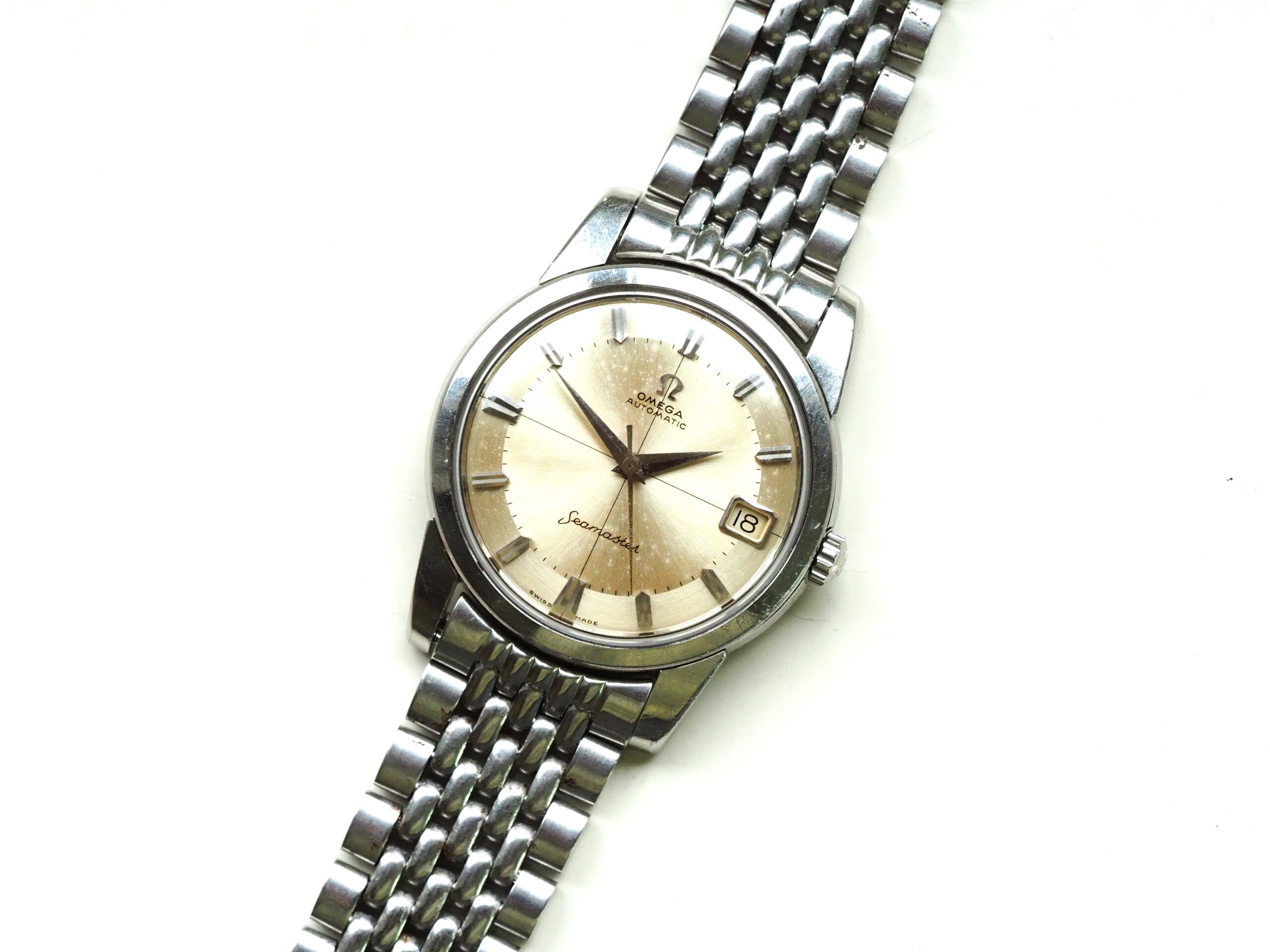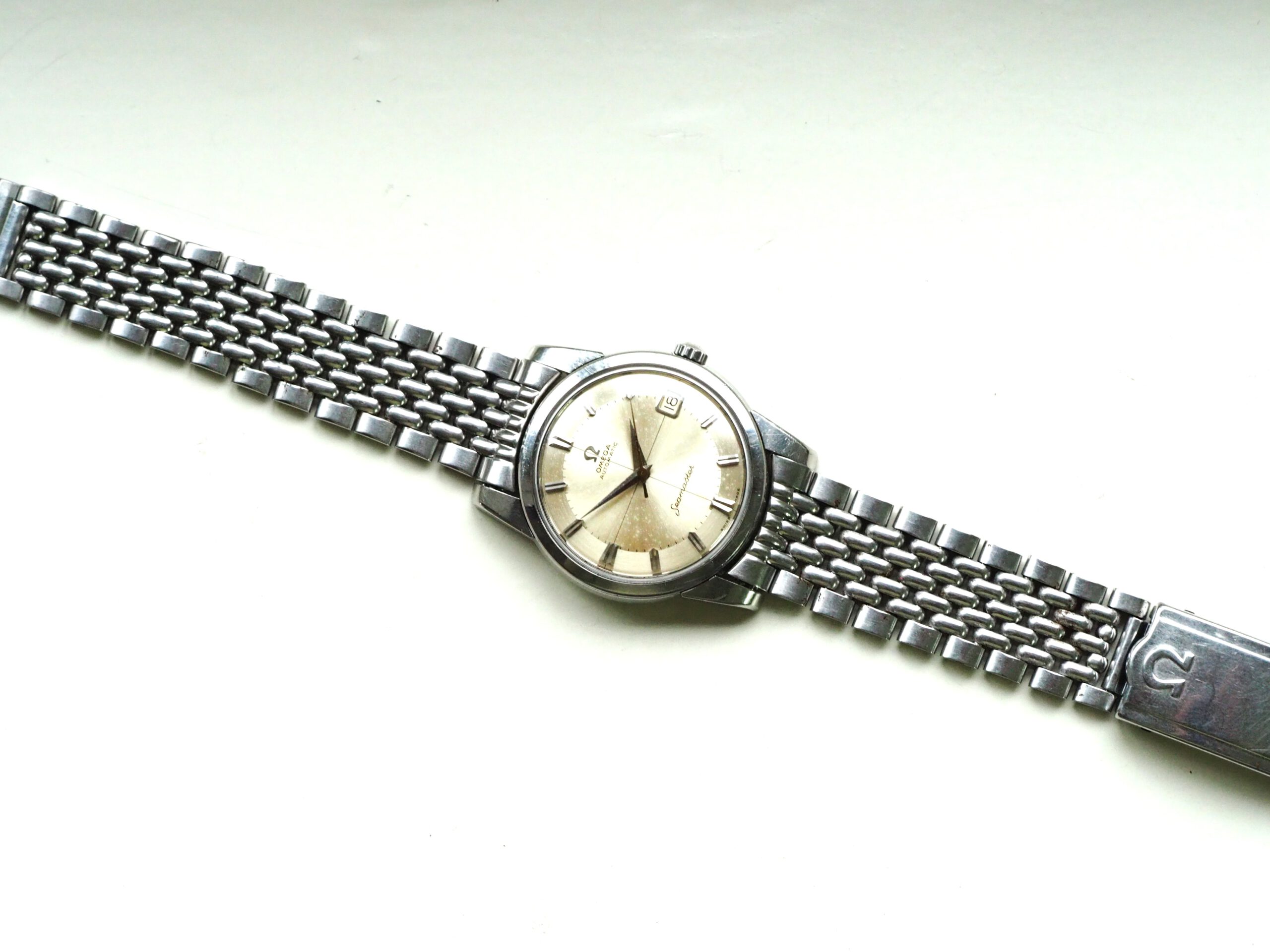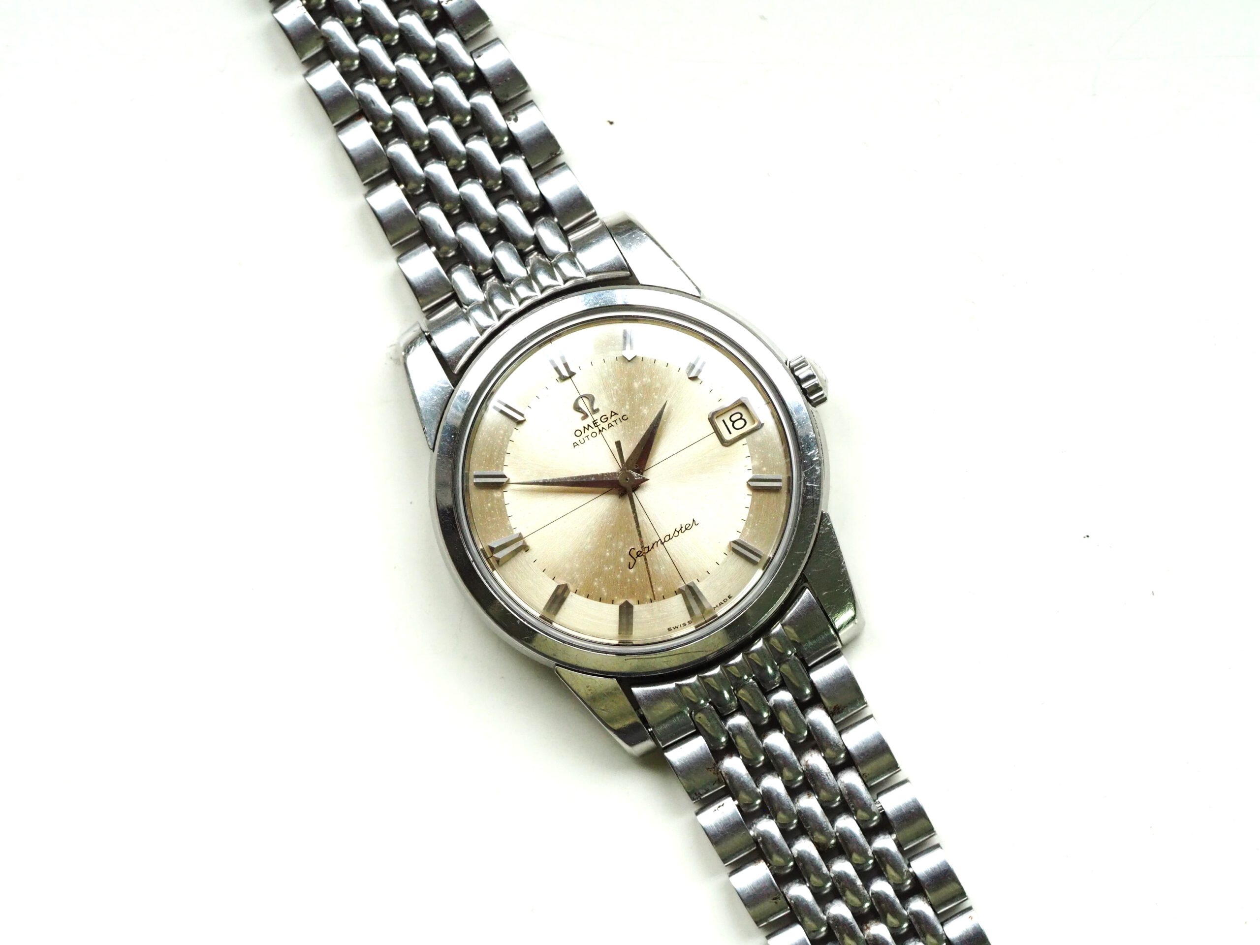 Referentie 14762 SC 61 Omega Seamaster Automatic, serienummer 19044994 productiejaar 1961. Prachtige vintage stalen Seamaster in zeer goede staat met BOR band (beads of rice) en een volledig geserviced uurwerk. Het horloge heeft een schitterende wijzerplaat boordevol details; crosshair, grote opgelegde uurmarkeringen, een sunburst in het midden en een cirkelvormig borstelpatroon aan de buitenkant. De prachtige dauphine wijzers, kenmerkend voor deze vintage Omega’s, maken het geheel compleet. In de kast vinden we een Omega 562 automatisch uurwerk met datumfunctie welke net volledig is geserviced (januari 2026) en perfect functioneert. Tijdens deze service zijn tevens de kast en de band ultrasoon gereinigd en is de kast voorzien van een nieuw plexiglas (niet origineel Omega). Het horloge wordt geleverd met een 1502 band, geschikt voor een polsomtrek van circa 16,5-18 cm. De algehele staat is zeer goed, met slechts lichte gebruikssporen en een gelijkmatige patina op de wijzerplaat. Kastdiameter 34mm zonder kroon.