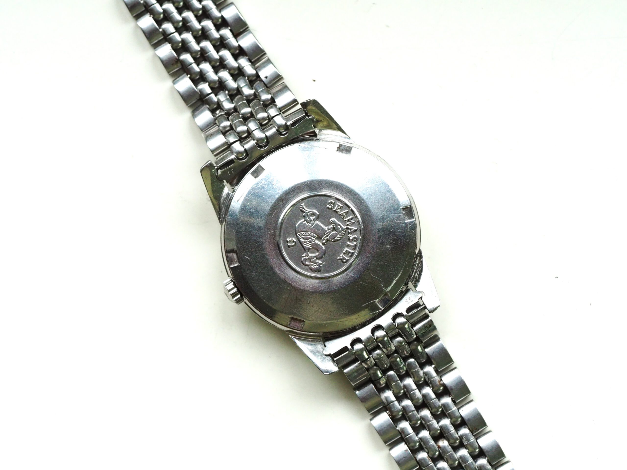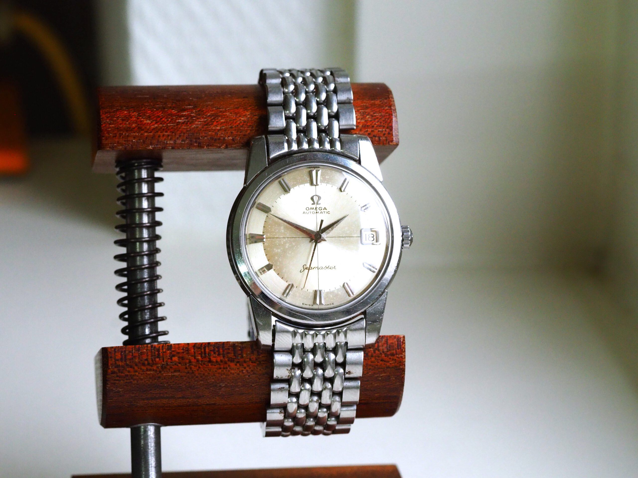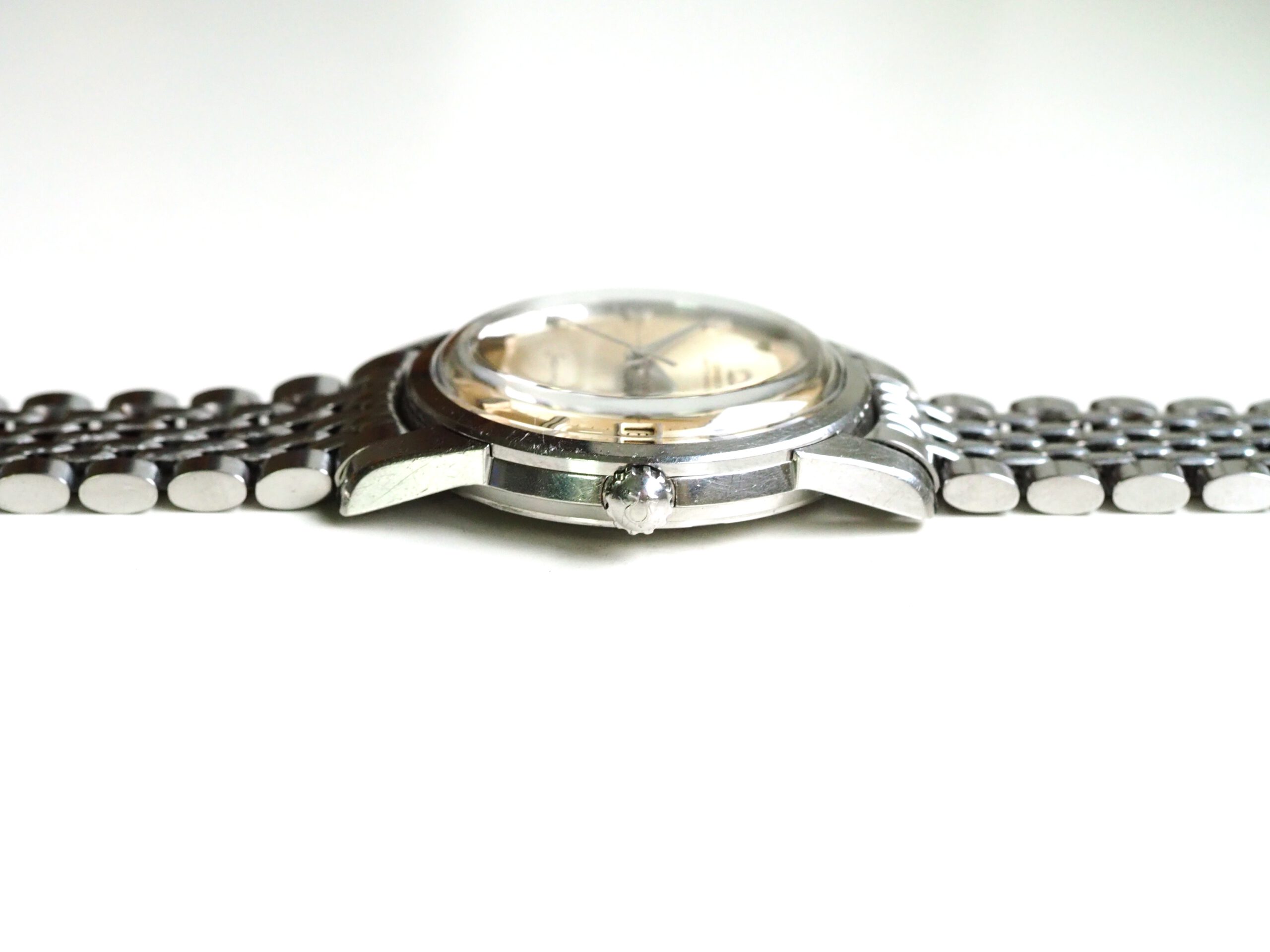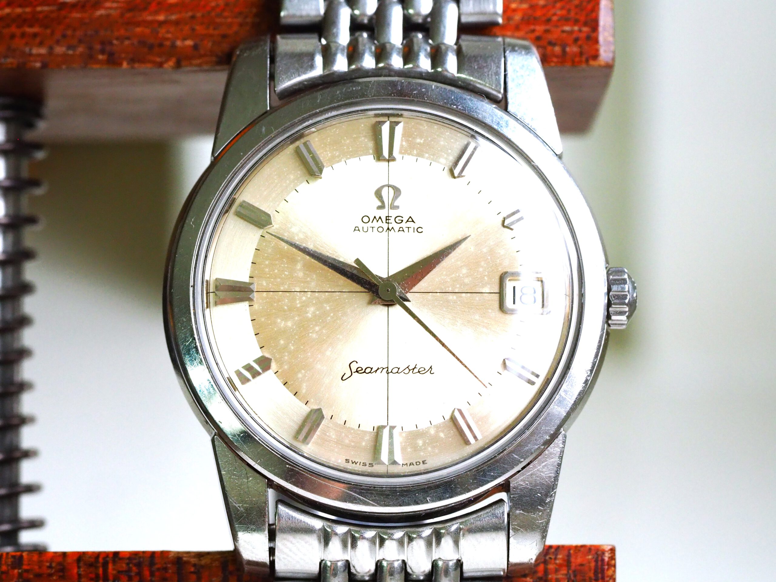 Referentie 14762 SC 61 Omega Seamaster Automatic, serienummer 19044994 productiejaar 1961. Prachtige vintage stalen Seamaster in zeer goede staat met BOR band (beads of rice) en een volledig geserviced uurwerk. Het horloge heeft een schitterende wijzerplaat boordevol details; crosshair, grote opgelegde uurmarkeringen, een sunburst in het midden en een cirkelvormig borstelpatroon aan de buitenkant. De prachtige dauphine wijzers, kenmerkend voor deze vintage Omega’s, maken het geheel compleet. In de kast vinden we een Omega 562 automatisch uurwerk met datumfunctie welke net volledig is geserviced (januari 2026) en perfect functioneert. Tijdens deze service zijn tevens de kast en de band ultrasoon gereinigd en is de kast voorzien van een nieuw plexiglas (niet origineel Omega). Het horloge wordt geleverd met een 1502 band, geschikt voor een polsomtrek van circa 16,5-18 cm. De algehele staat is zeer goed, met slechts lichte gebruikssporen en een gelijkmatige patina op de wijzerplaat. Kastdiameter 34mm zonder kroon.