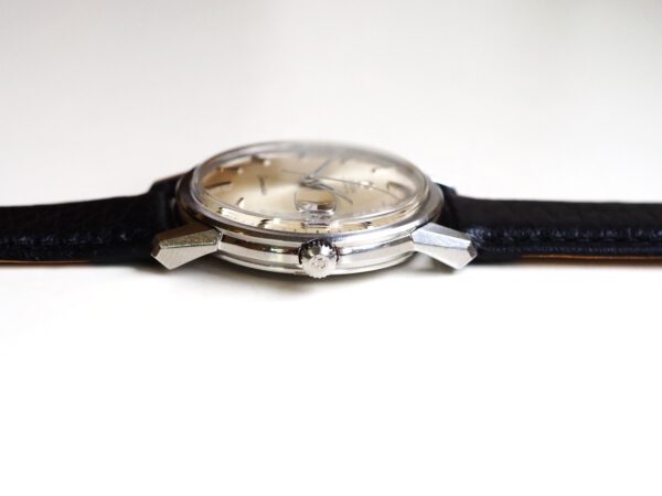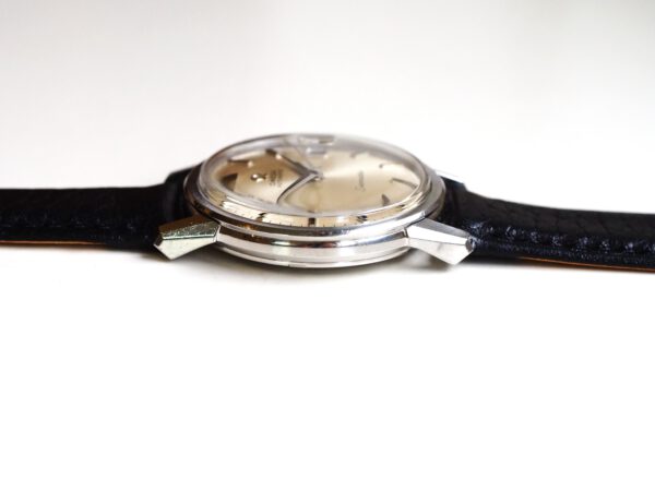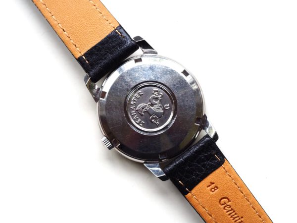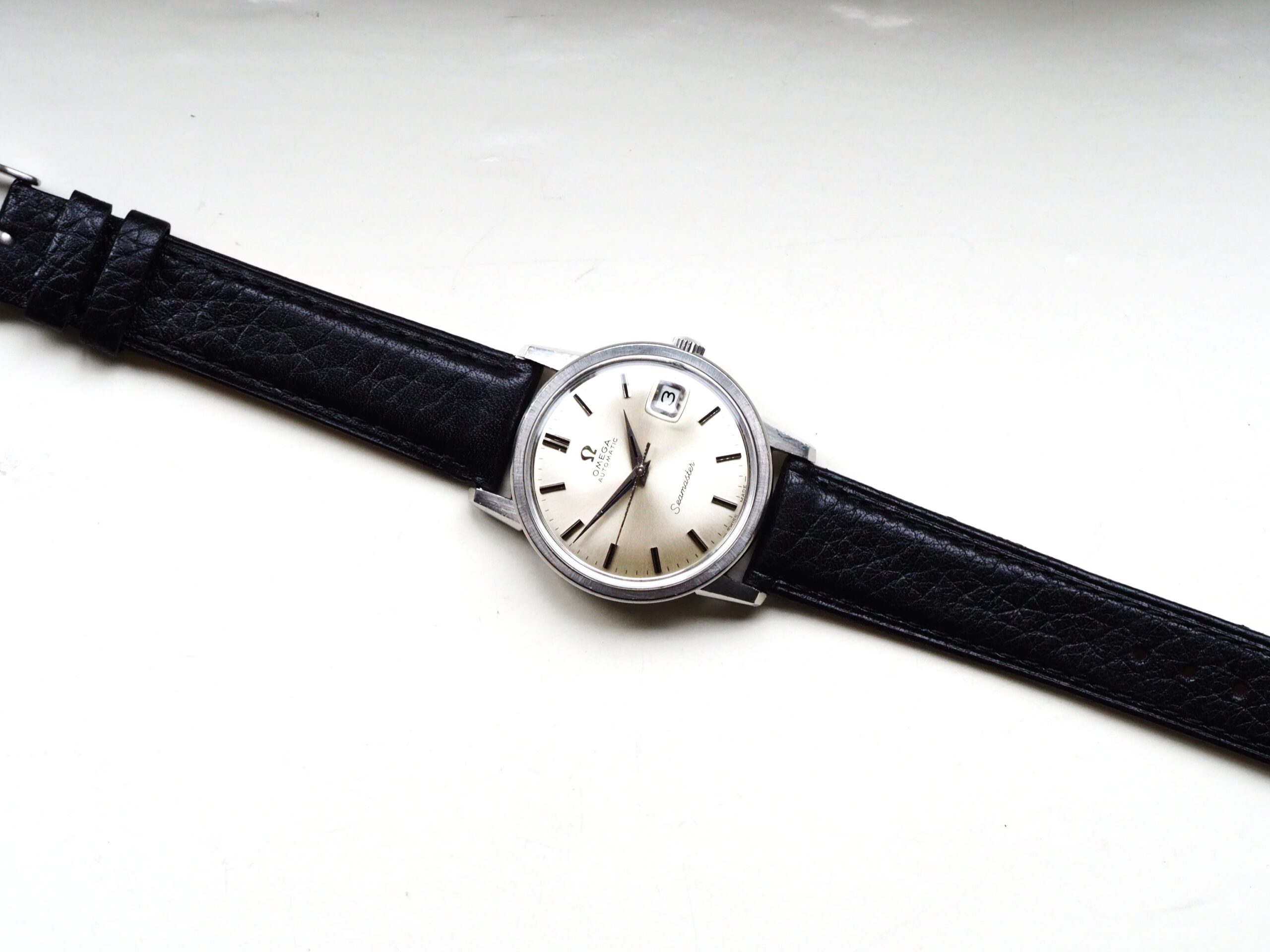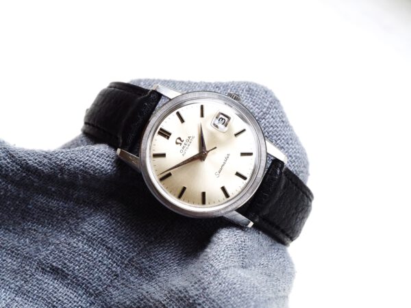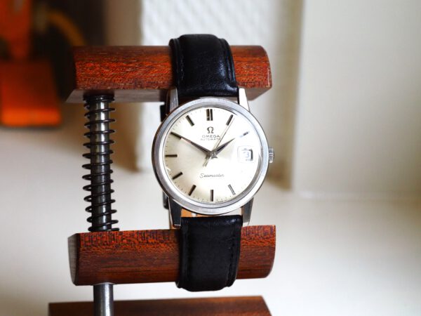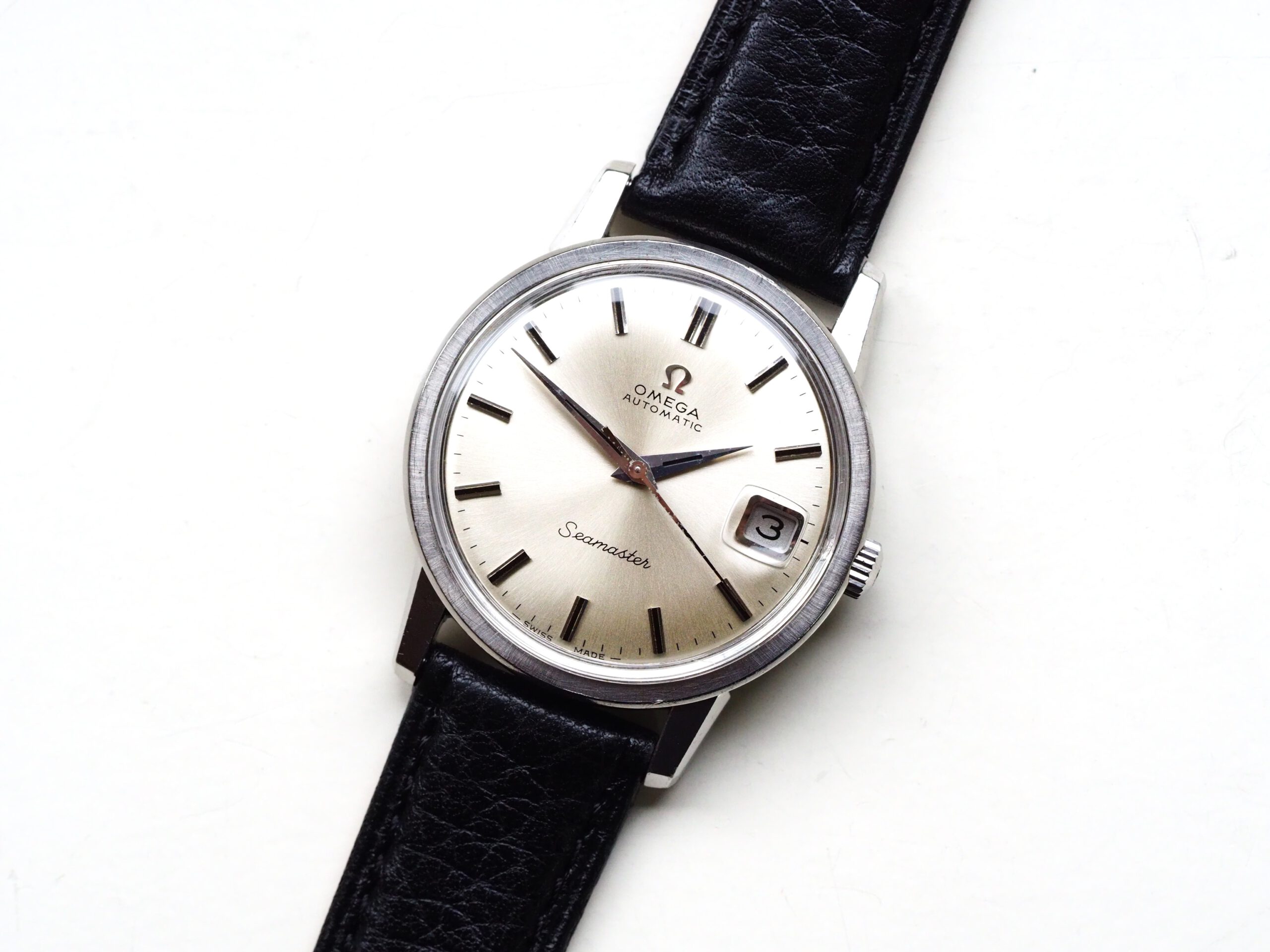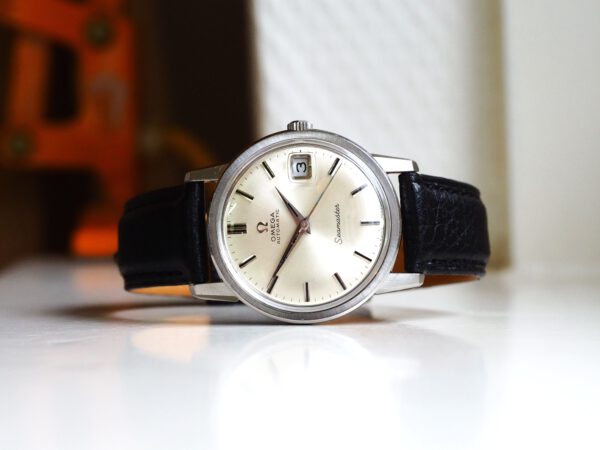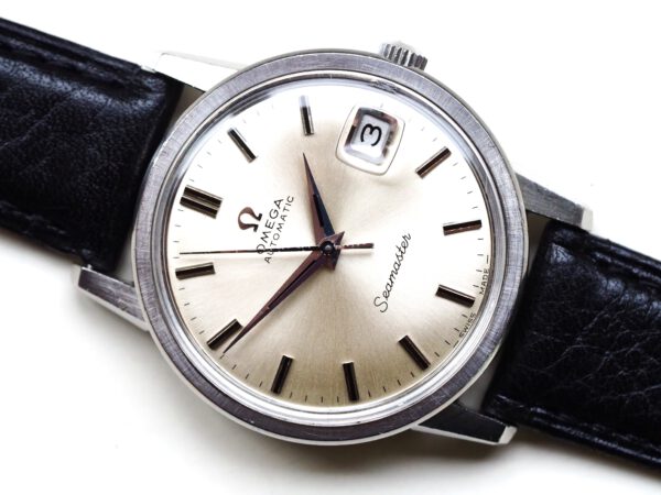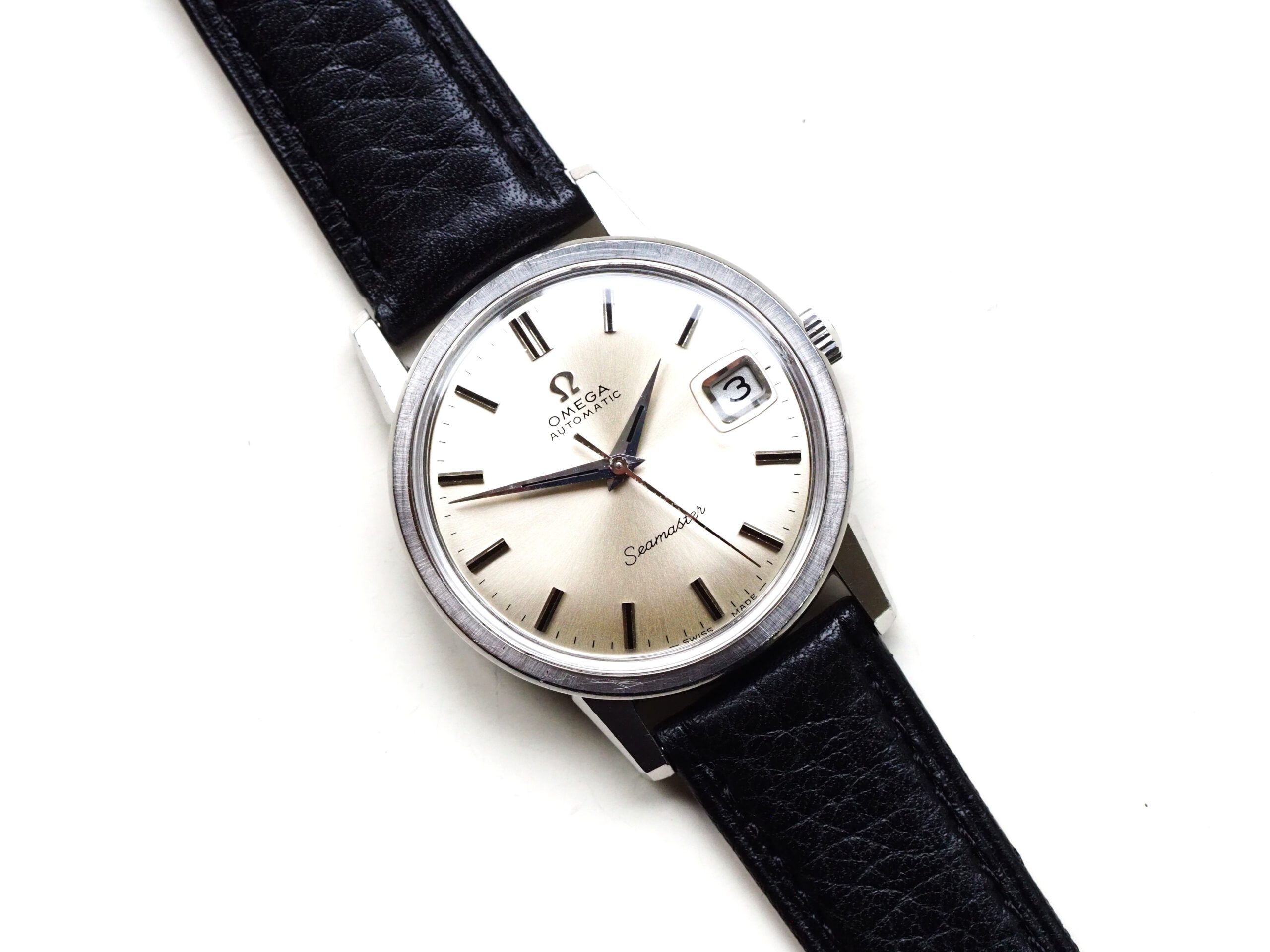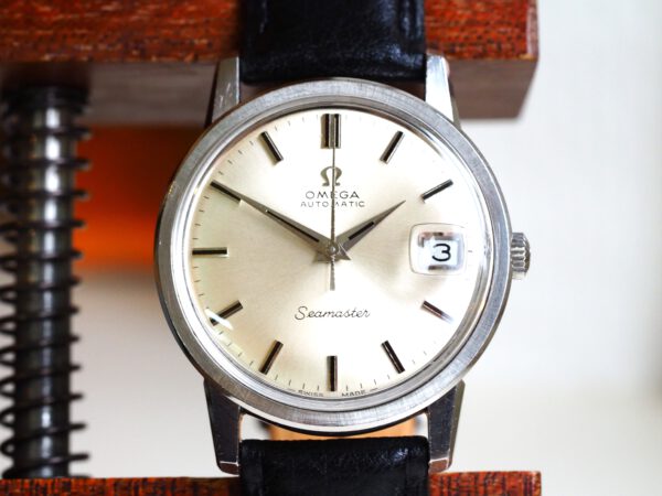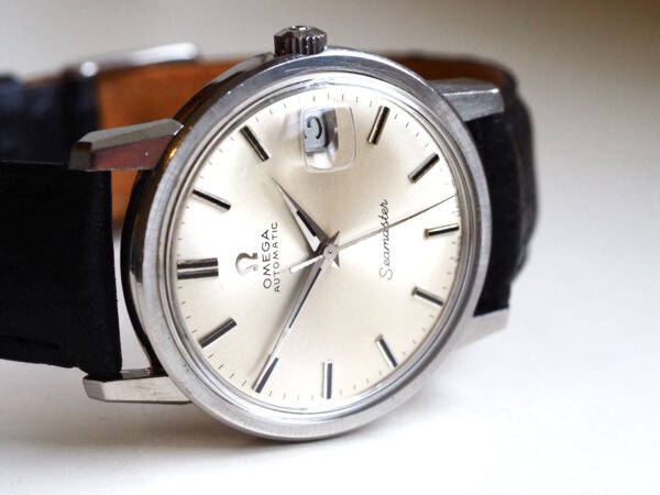 Referentie 166.003 Omega Seamaster Automatic, serienummer 29846521 productiejaar 1970. Prachtige vintage Omega Seamaster in zeer goede staat met roestvrijstalen kast, originele kroon en volledig geserviced uurwerk. Het horloge heeft een frisse zilveren sunburst wijzerplaat met opgelegde uurmarkeringen en prachtige dauphine wijzers. Over het algemeen verkeert het horloge in goede ongepolijste staat met normale gebruikssporen voor een 55 jaar oud horloge. In de kast vinden we een Omega 565 automatisch uurwerk (datum met quick-set) welke net volledig is geserviced (oktober 2025) en zeer goed functioneert. Tijdens deze service is de kast ook ultrasoon gereinigd en voorzien van een nieuwe zwarte leren band. Het plexiglas is niet origineel van Omega. Kastdiameter 34,5mm zonder kroon.