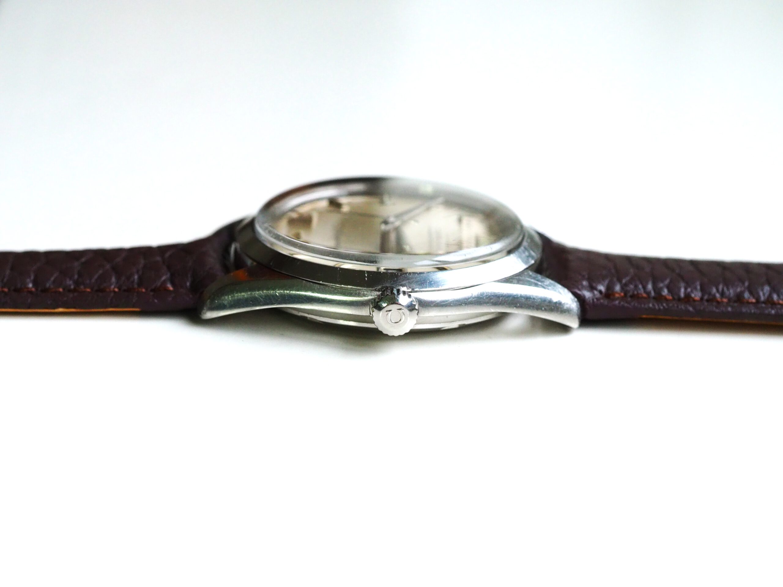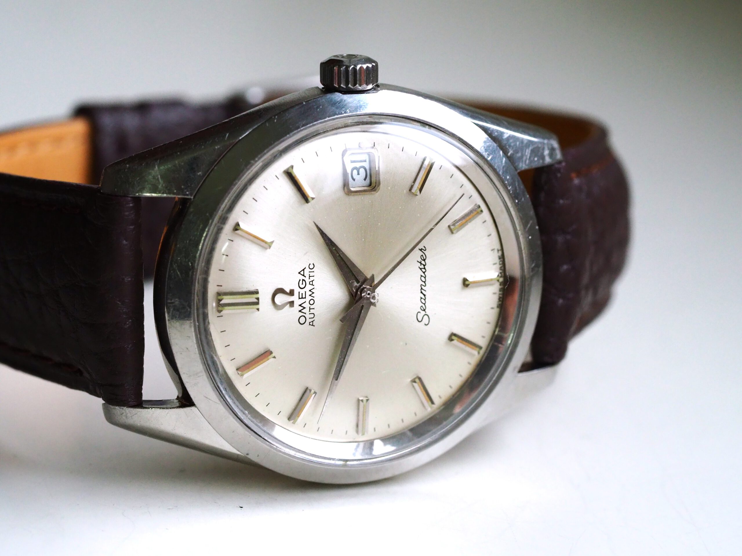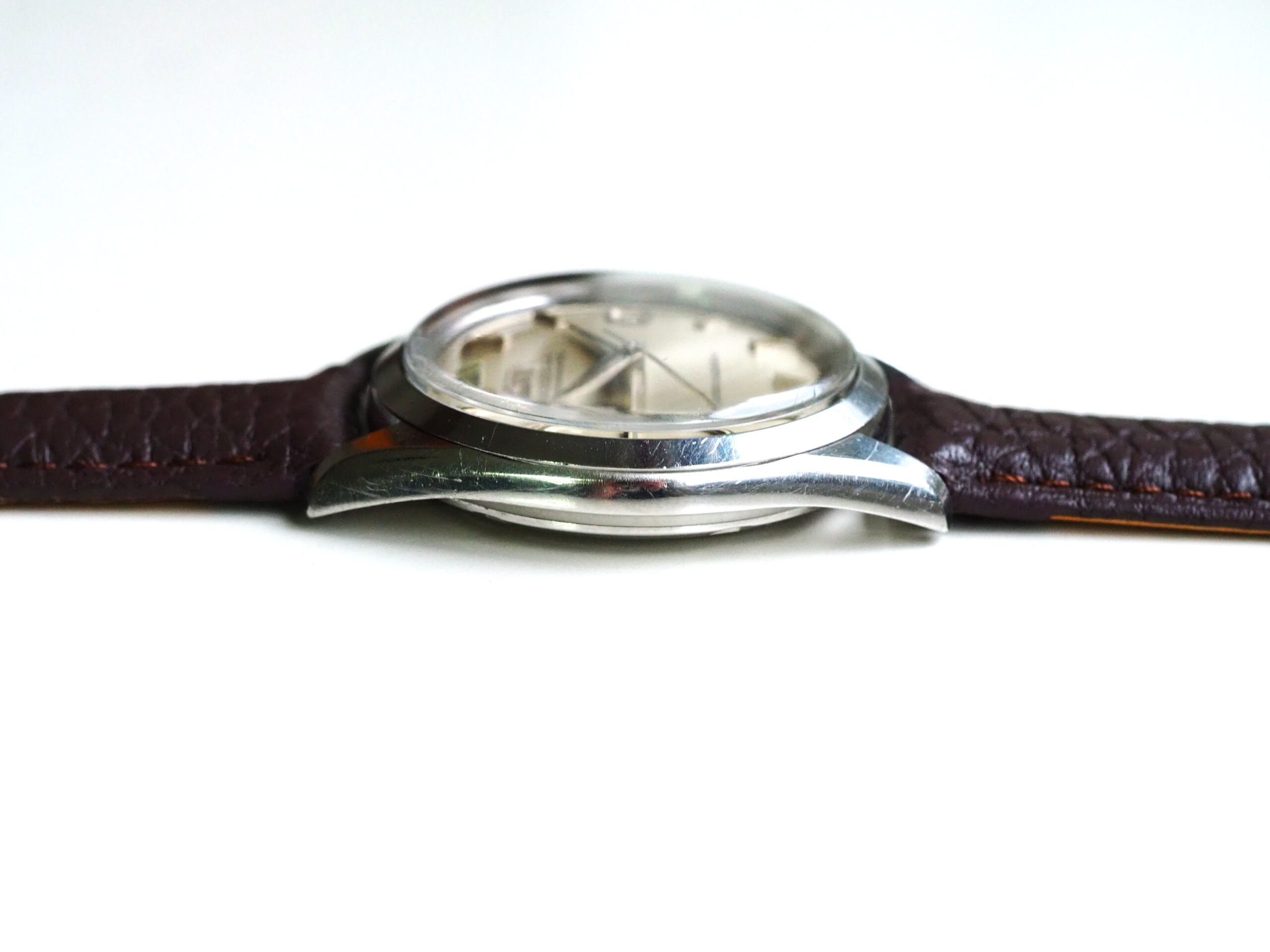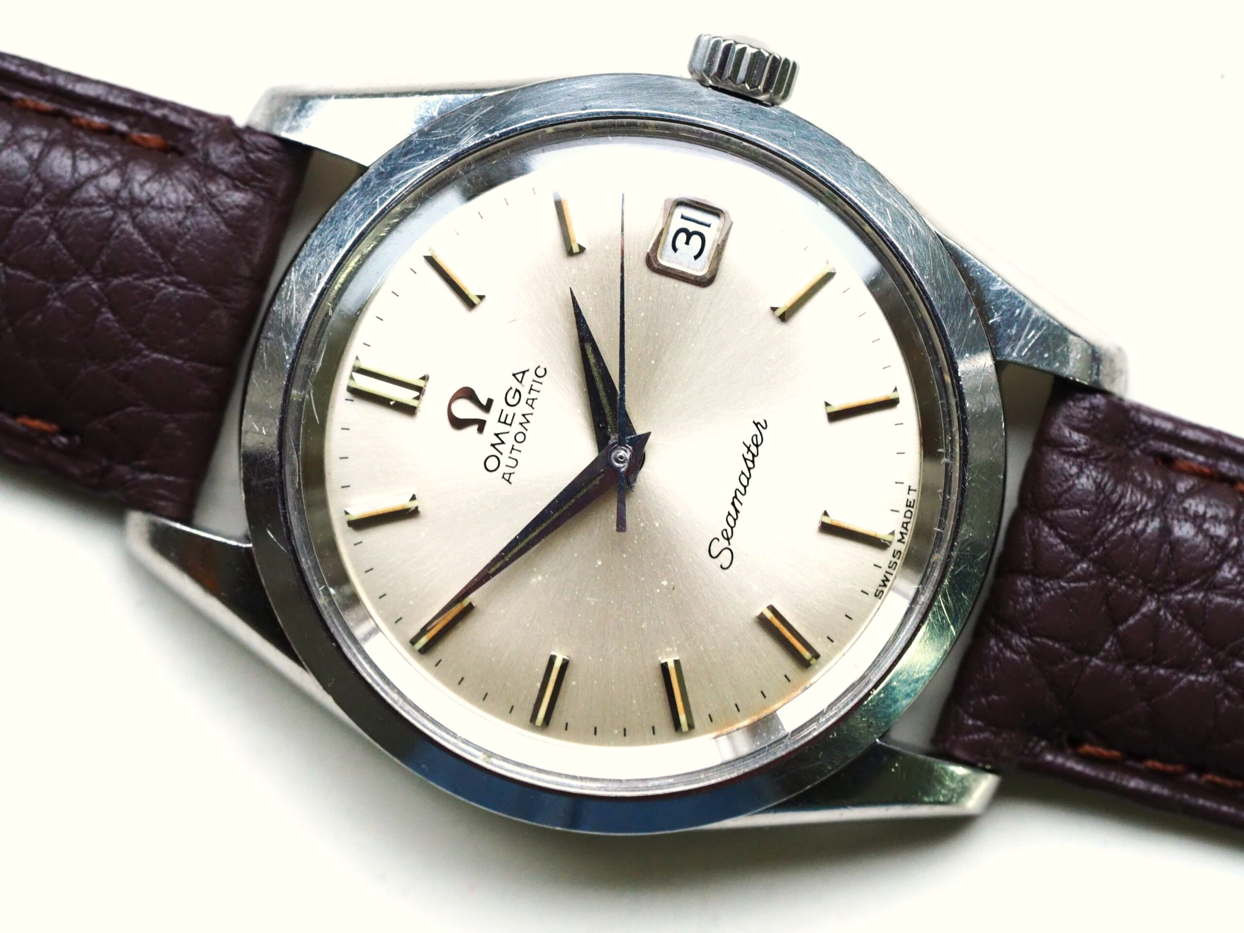 Referentie 166.010-67 Omega Seamaster Automatic, serienummer 26417852 productiejaar 1967. Populaire Omega 166.010 Seamaster in goede originele staat met stalen kast en Omega gesigneerde kroon/plexiglas. Het horloge heeft een interessante wijzerplaat met tritium lumen bovenop de uur markeringen. De elegante dauphine wijzers, kenmerkend voor Omega’s uit deze periode, maken het geheel compleet. In de kast vinden we een Omega 565 automatisch uurwerk met datumfunctie en quick-set. Het uurwerk is in uitstekende conditie: schoon, goed geolied en functioneert perfect. Normaal gesproken service ik vrijwel al mijn horloges voorafgaande verkoop, maar in dit geval was dat echt niet nodig. Wel heb ik de kast ultrasonisch gereinigd en voorzien van een nieuwe bruine leren band. Over het algemeen in goede staat met normale gebruikssporen gezien de leeftijd en een lichte patina op de wijzerplaat. Kastdiameter 35mm zonder kroon.