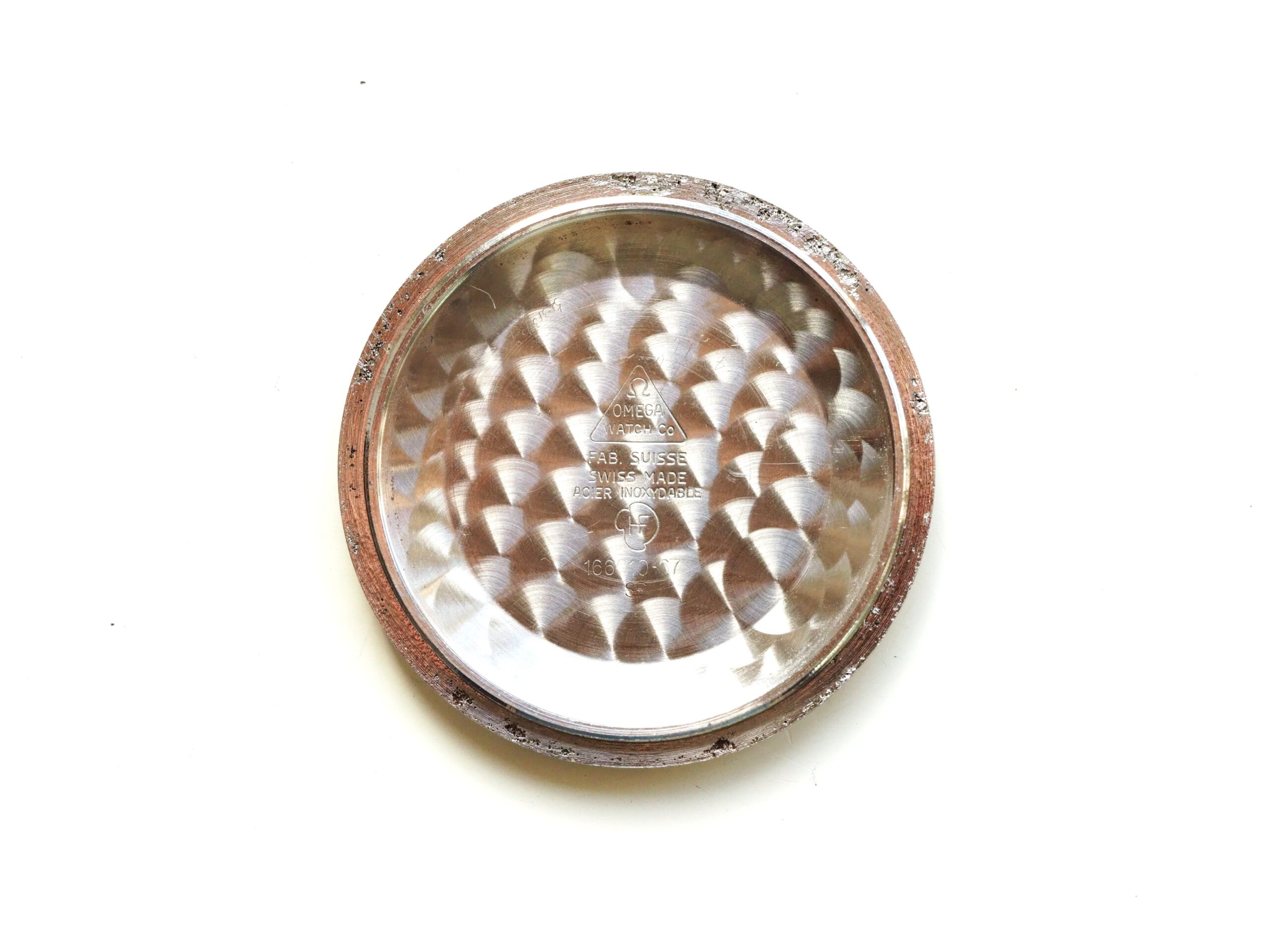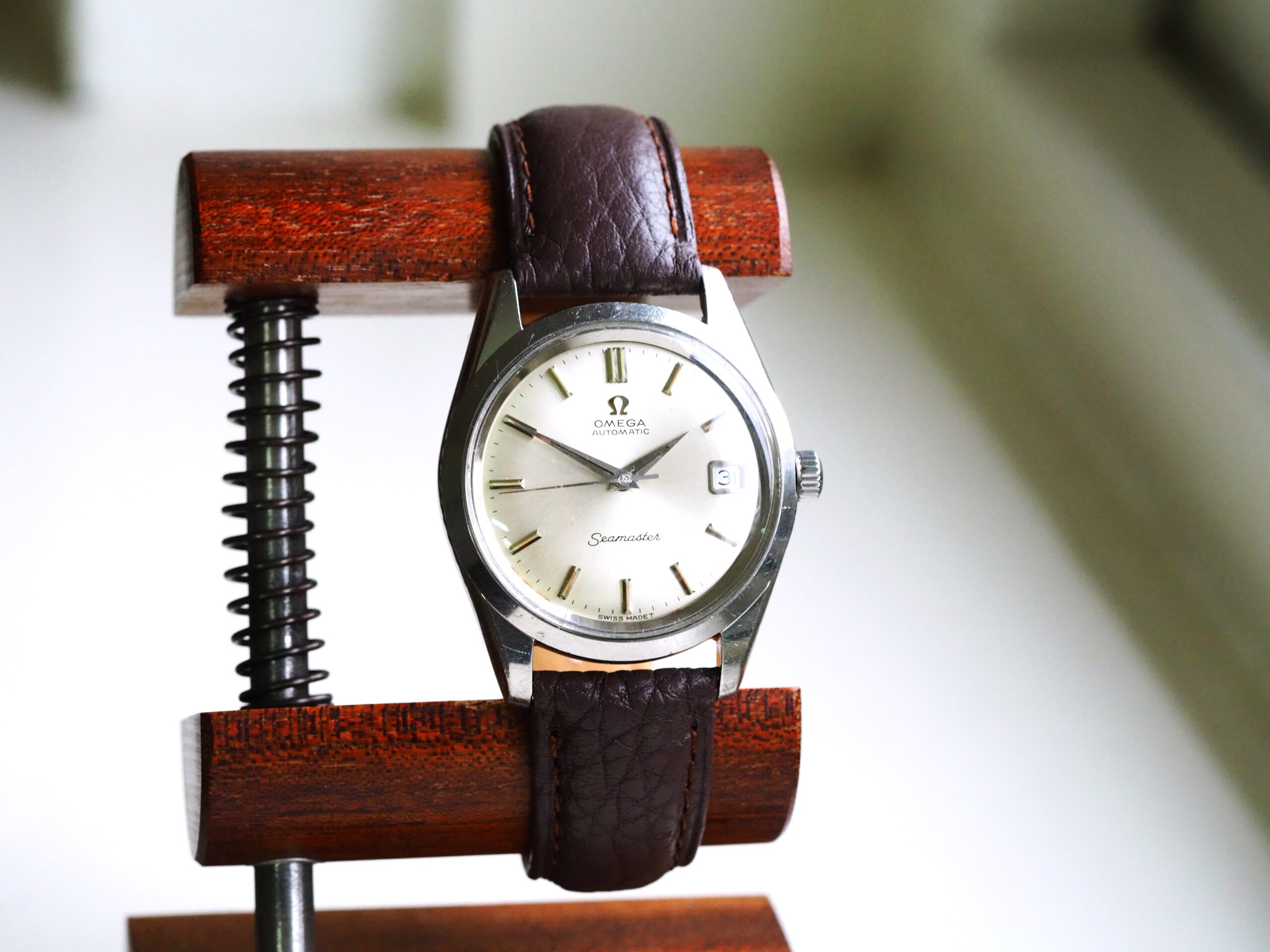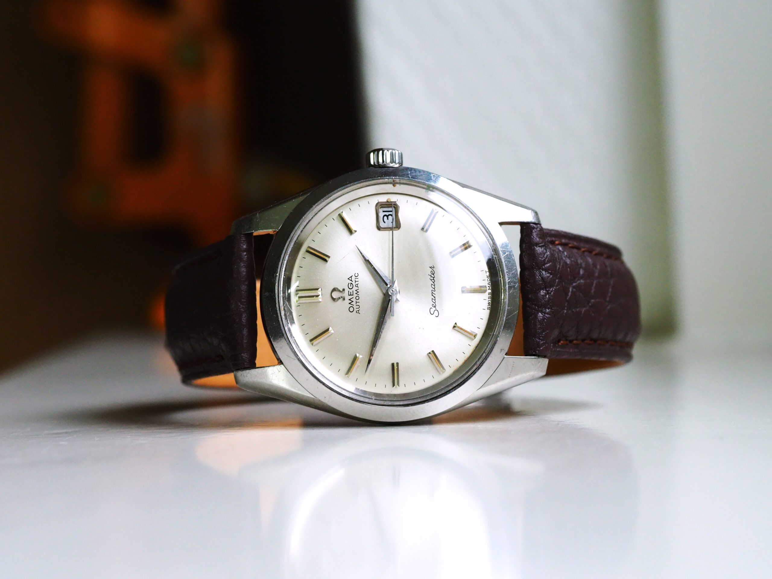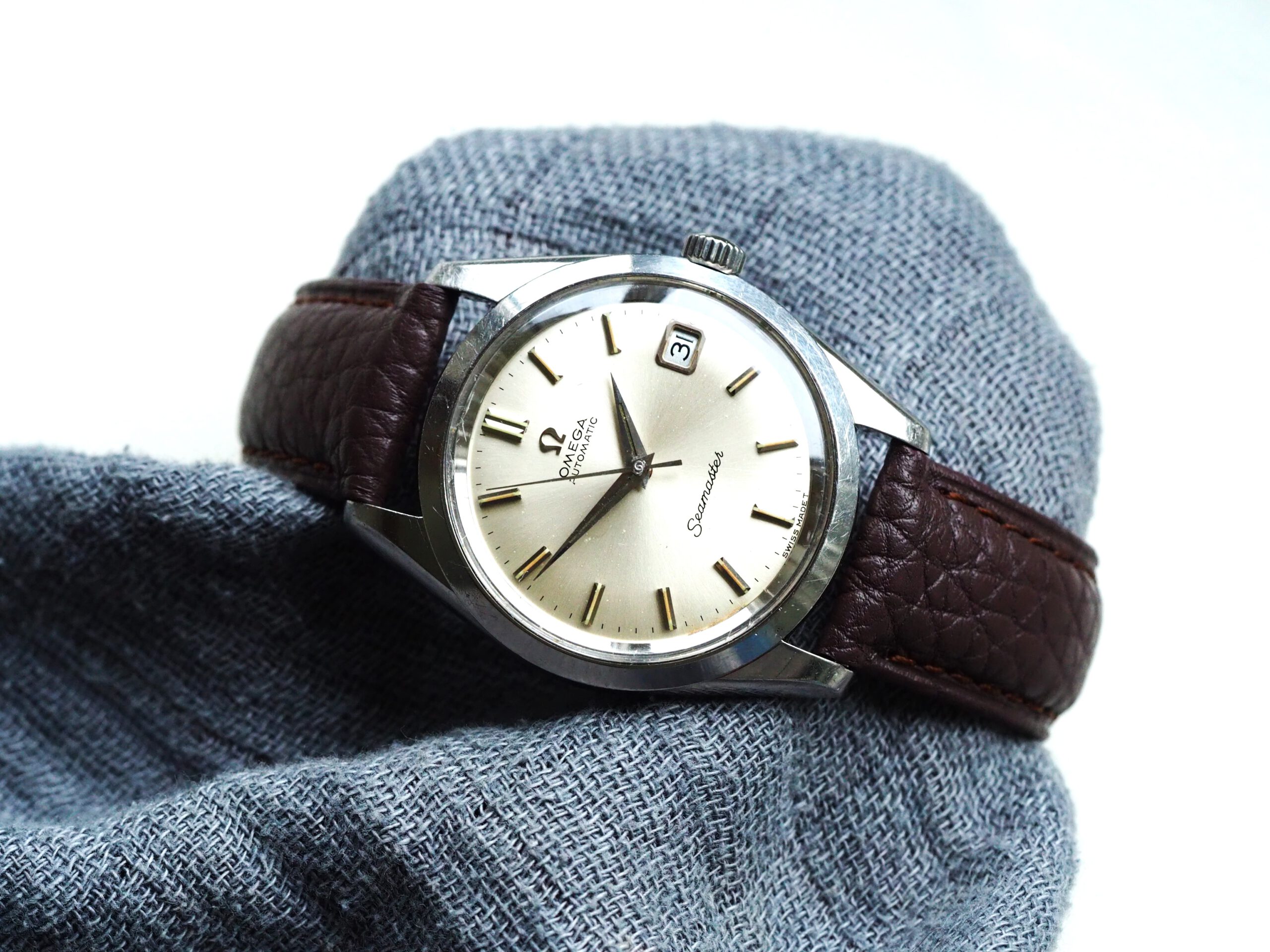 Referentie 166.010-67 Omega Seamaster Automatic, serienummer 26417852 productiejaar 1967. Populaire Omega 166.010 Seamaster in goede originele staat met stalen kast en Omega gesigneerde kroon/plexiglas. Het horloge heeft een interessante wijzerplaat met tritium lumen bovenop de uur markeringen. De elegante dauphine wijzers, kenmerkend voor Omega’s uit deze periode, maken het geheel compleet. In de kast vinden we een Omega 565 automatisch uurwerk met datumfunctie en quick-set. Het uurwerk is in uitstekende conditie: schoon, goed geolied en functioneert perfect. Normaal gesproken service ik vrijwel al mijn horloges voorafgaande verkoop, maar in dit geval was dat echt niet nodig. Wel heb ik de kast ultrasonisch gereinigd en voorzien van een nieuwe bruine leren band. Over het algemeen in goede staat met normale gebruikssporen gezien de leeftijd en een lichte patina op de wijzerplaat. Kastdiameter 35mm zonder kroon.