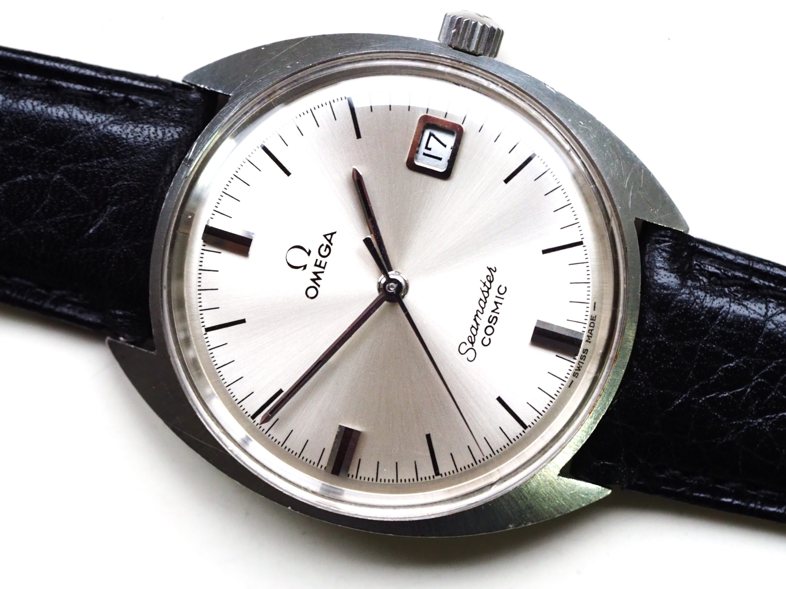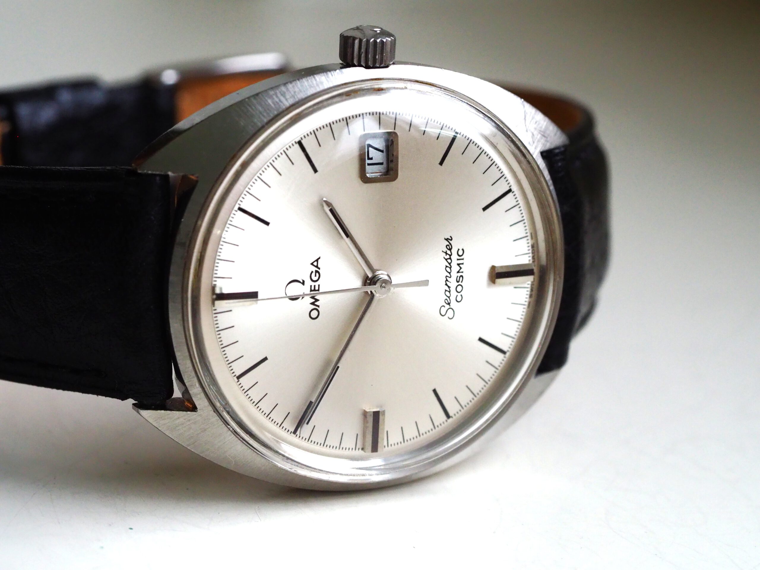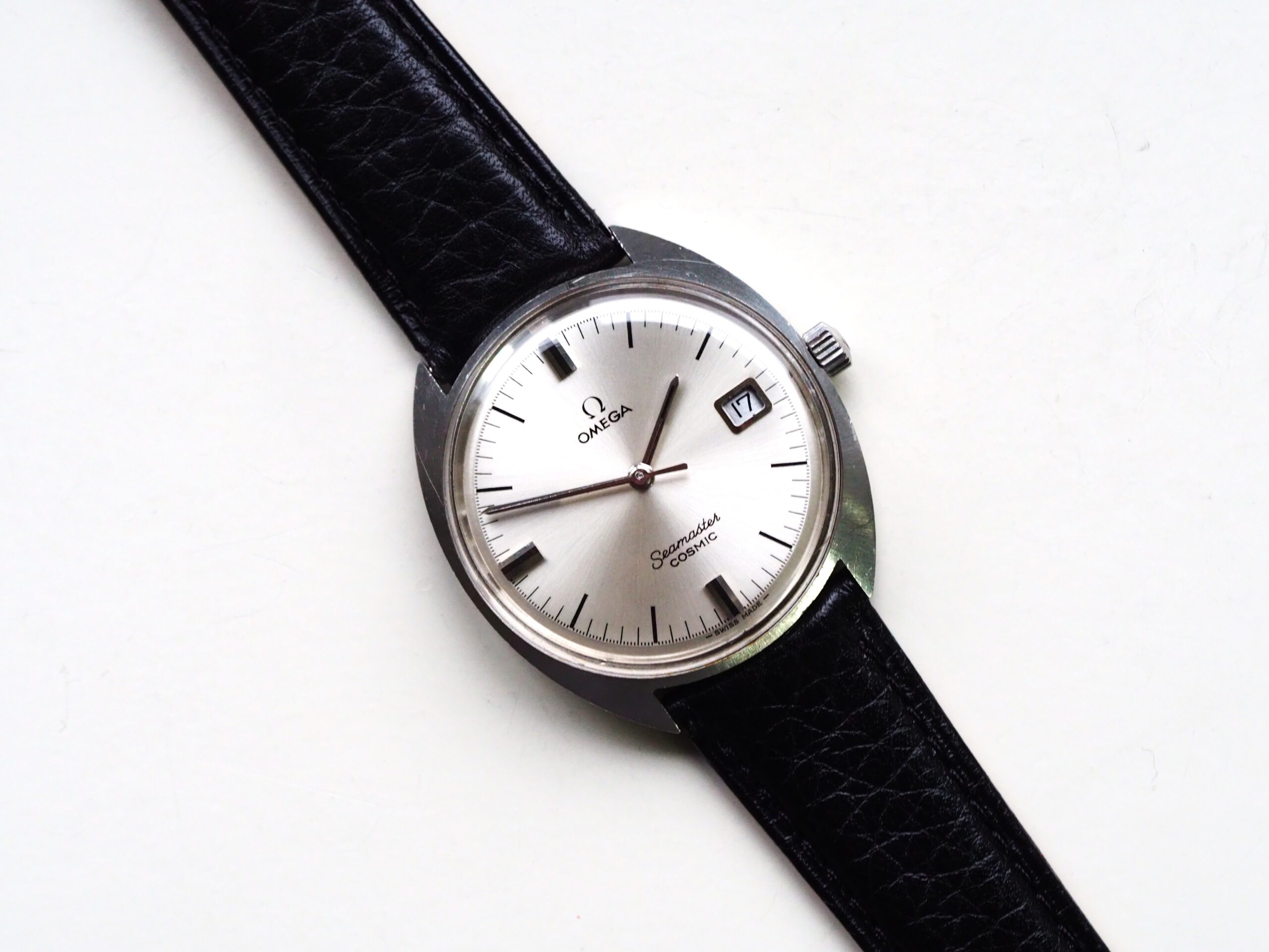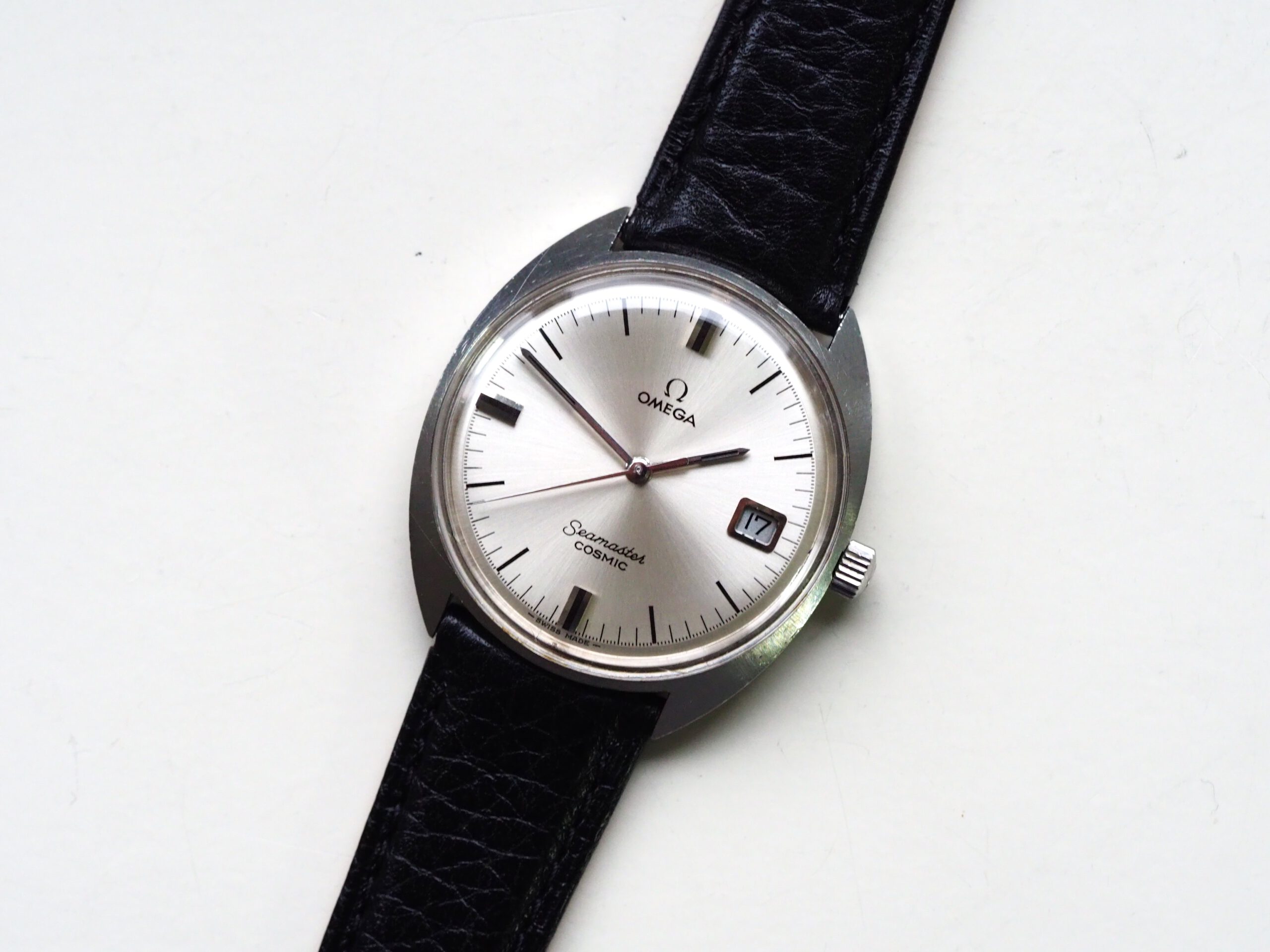 Referentie 136.017 Omega Seamaster Cosmic, serienummer 29235294 productiejaar 1970. Prachtige vintage Omega met een scherpe ongepolijste kast, originele kroon/plexiglas en volledig geserviced uurwerk. Het horloge heeft een klassieke zilverkleurige wijzerplaat met sunburst patroon, zwarte accenten en bijpassende wijzers. Over het algemeen gezien zeer goede staat met slechts milde gebruikssporen, zeker gezien de leeftijd. In de kast bevindt zich een handmatig opgewonden Omega 613 uurwerk (datum met quick-set) welke net volledig is geserviced (december 2025) en uitstekend functioneert. Tijdens deze service is tevens de kast ultrasoon gereinigd en voorzien van een nieuwe zwarte leren band. Al met al een prachtige vintage Omega, klaar voor een nieuwe eigenaar! Kastdiameter 35mm zonder kroon.