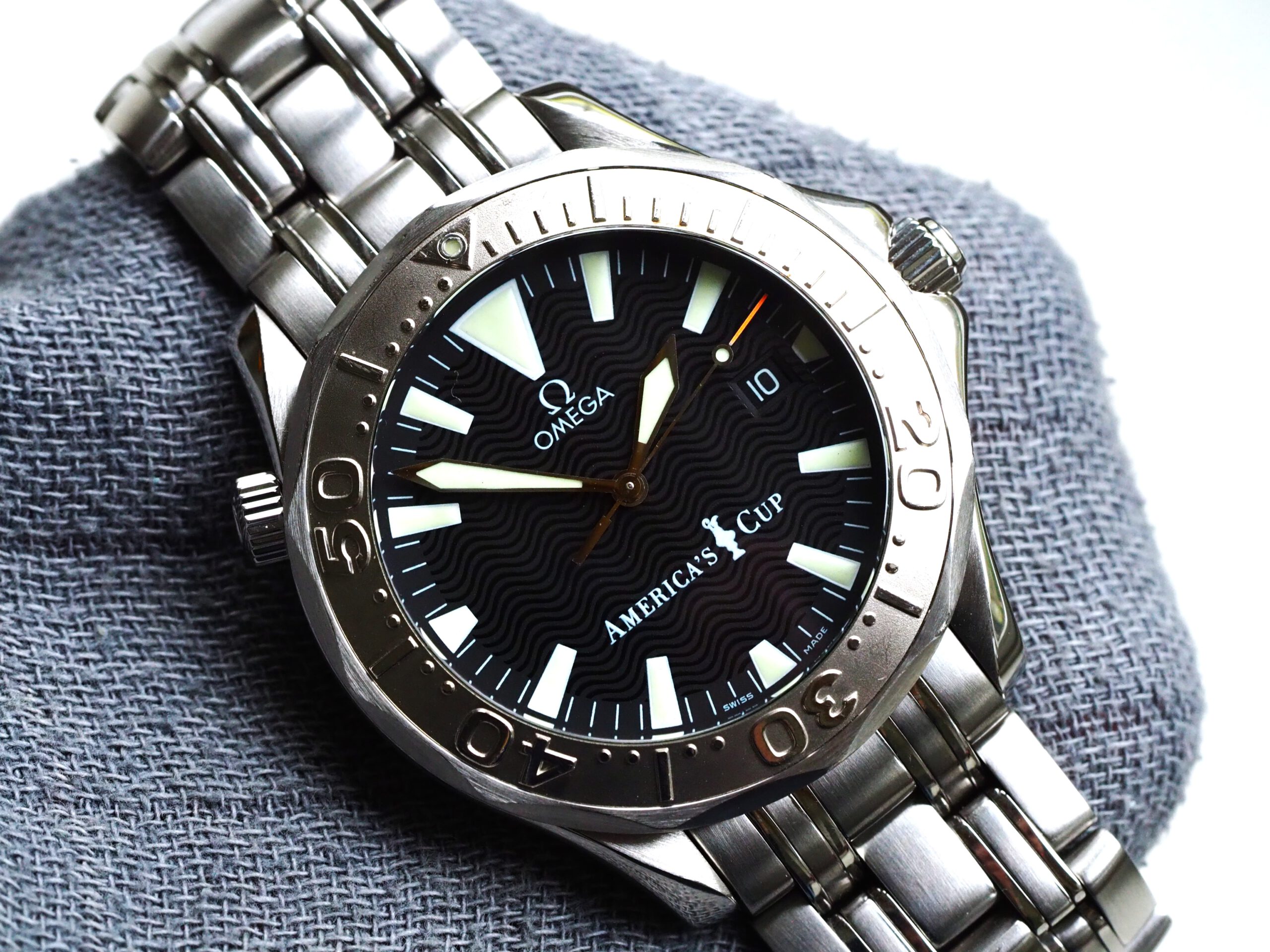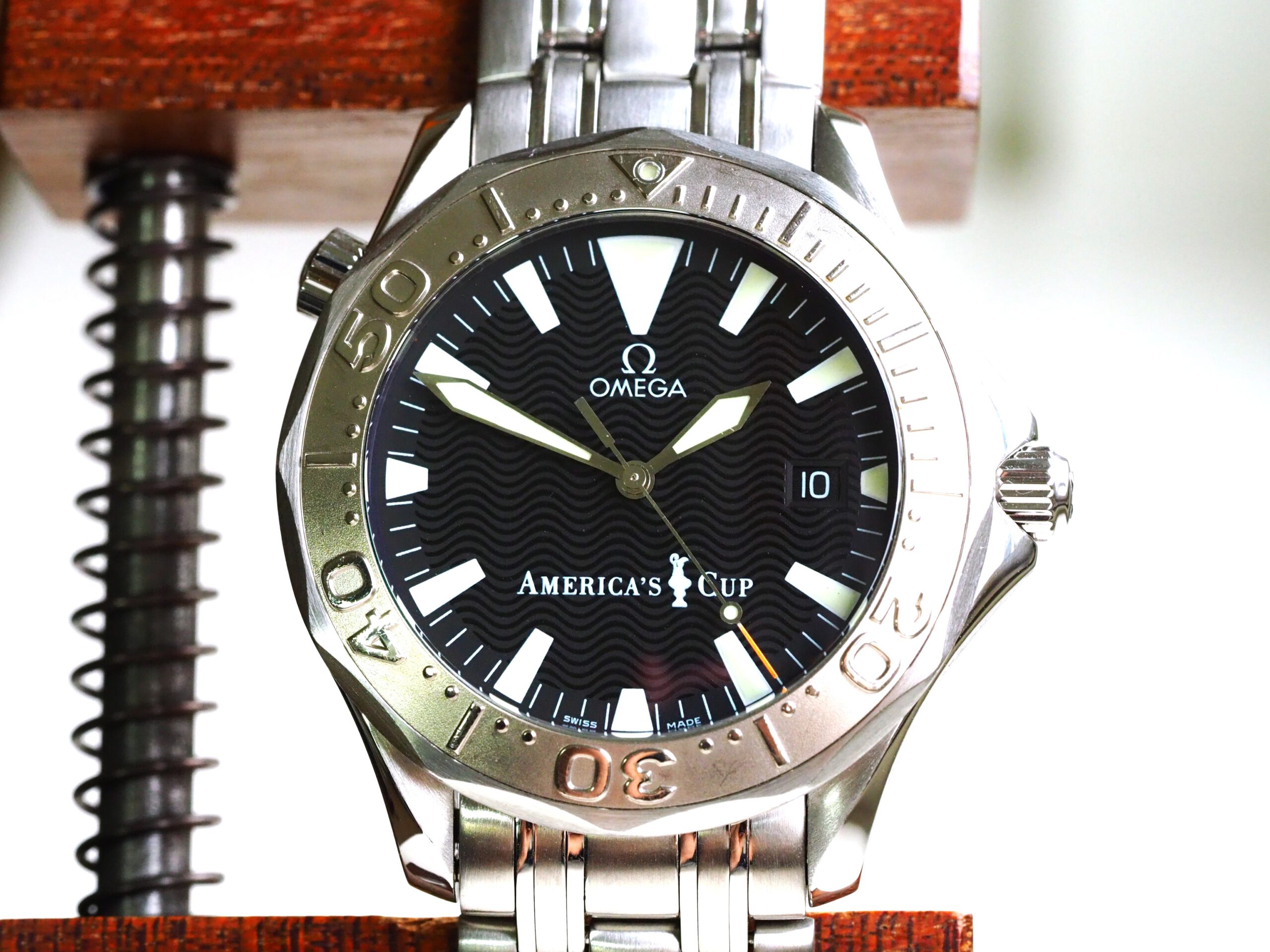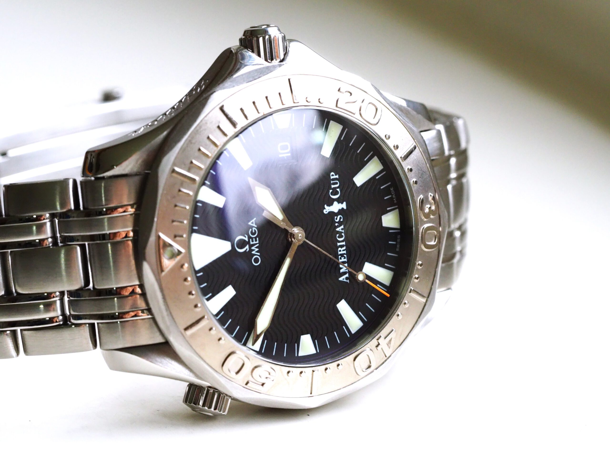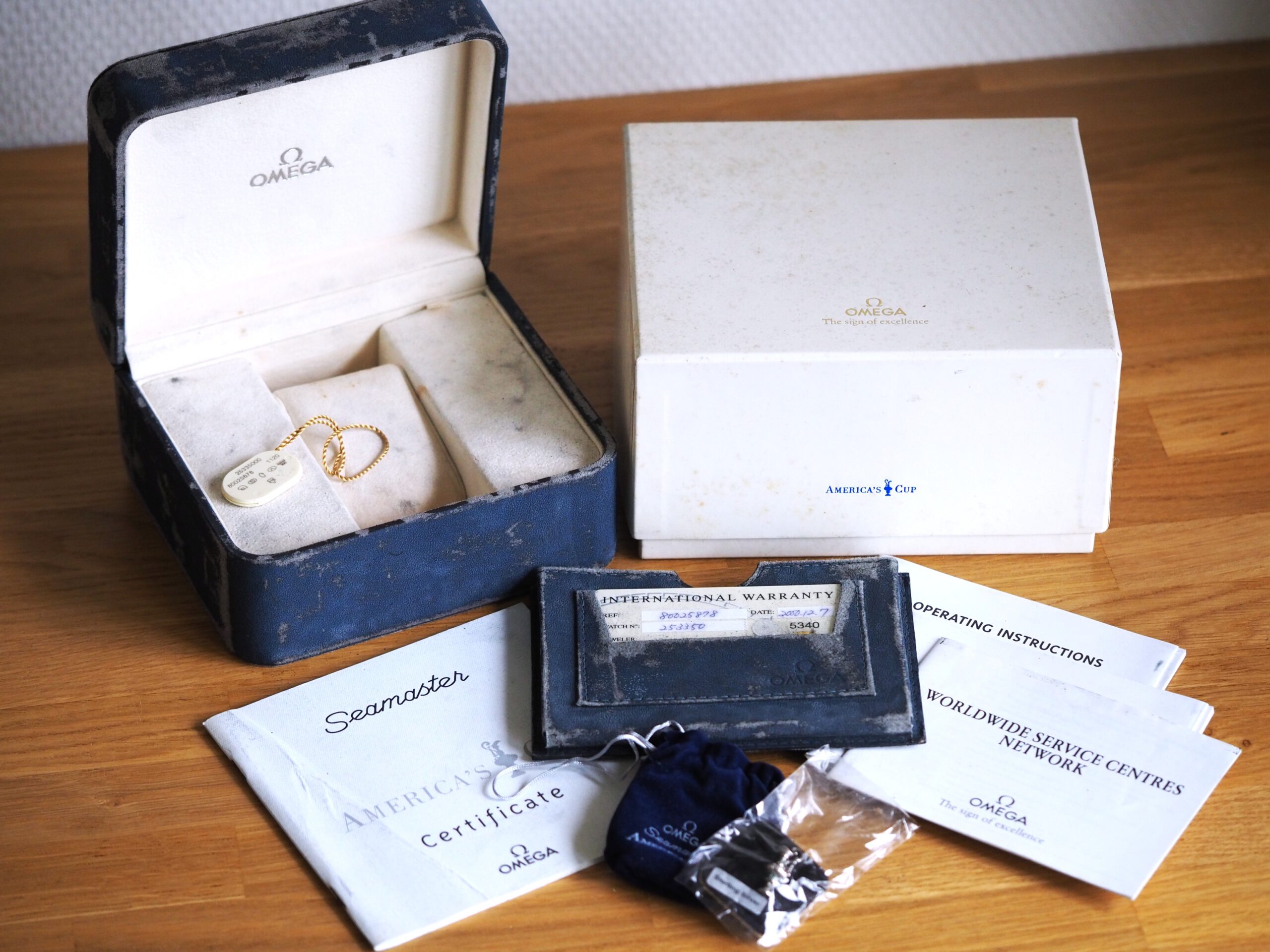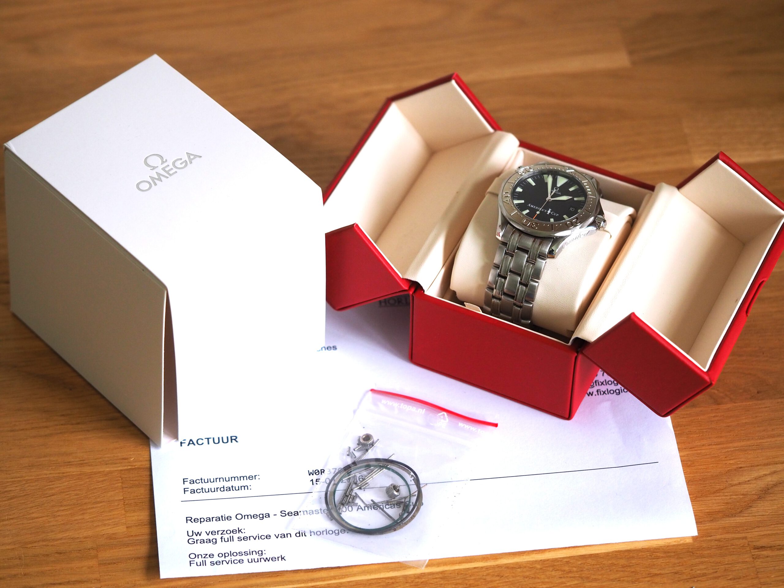 Referentie 2533.50.00 Omega Seamaster America’s Cup Limited Edition, serienummer 80025878 geproduceerd in 2000. Prachtige stalen Seamaster 300m chronometer in fantastische conditie met witgouden bezel inleg. Het horloge is recent volledig geserviced door een Omega gecertificeerd service center en komt met een 2 jaar garantie. Het uurwerk is volledig geserviced, de waterdichtheid is hersteld (alle pakkingen vervangen) en de kast en band zijn opnieuw opgemaakt. De kosten van deze service bedroegen € 750, factuur wordt bij het horloge geleverd. Het horloge wordt geleverd met de originele doos, papieren, certificaat etc. die bij deze America’s Cup editie horen. Daarnaast wordt een Omega service box en de tijdens de service vervangen onderdelen meegeleverd. De staat van het leer van de originele doos en kaarthouder is, zoals bij de meeste Omega dozen uit deze periode, vrij slecht. De band heeft een goede lengte, geschikt voor een polsomtrek van ongeveer 18,5 cm. Kastdiameter 41mm zonder kroon.
