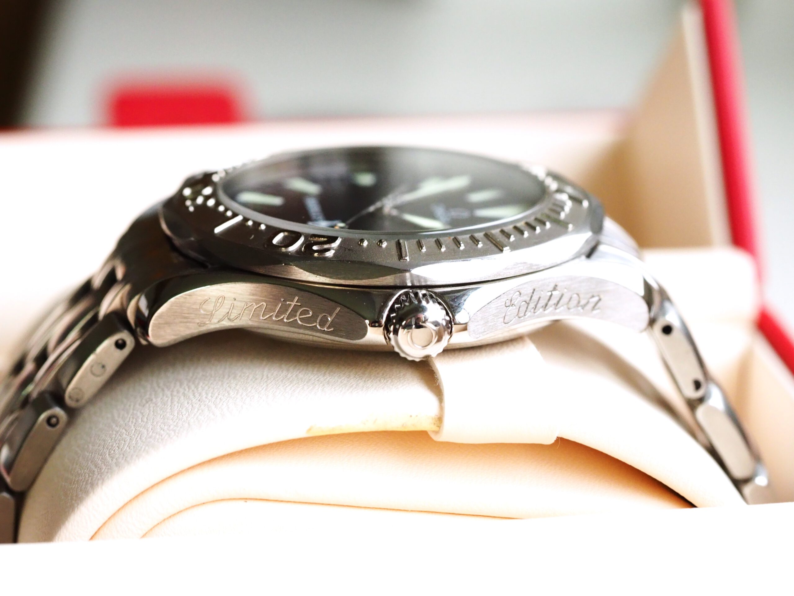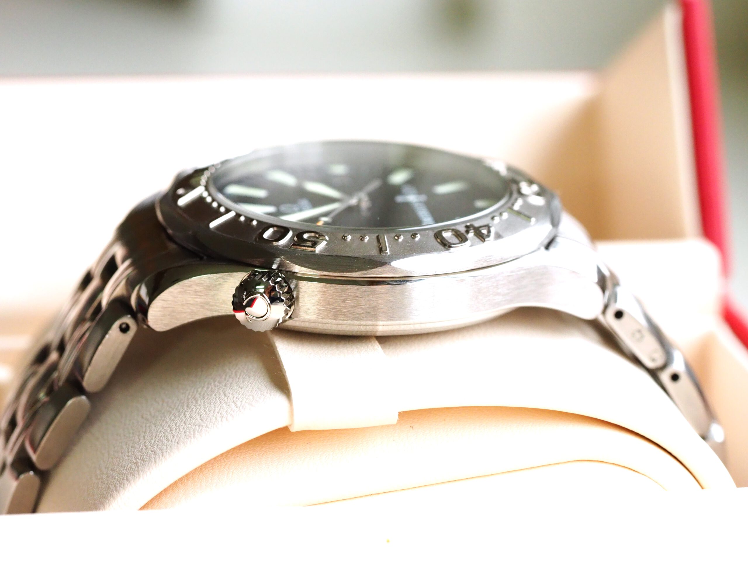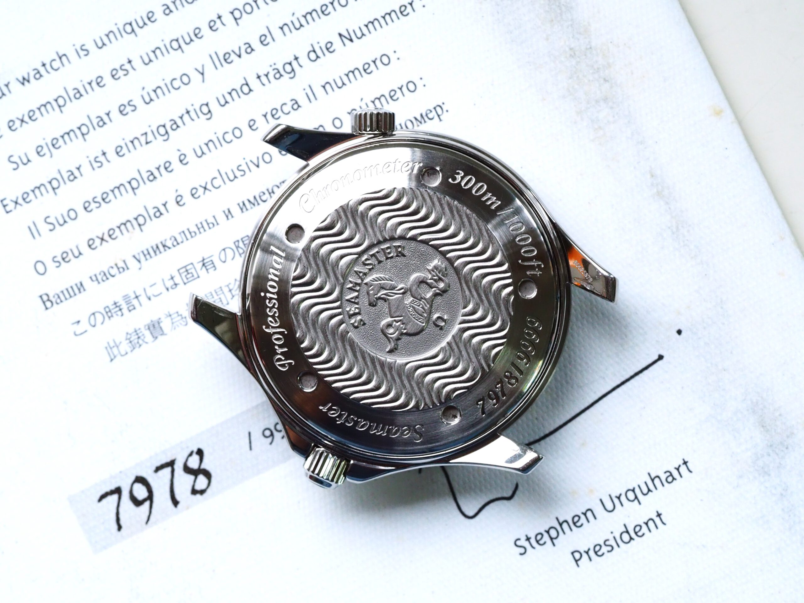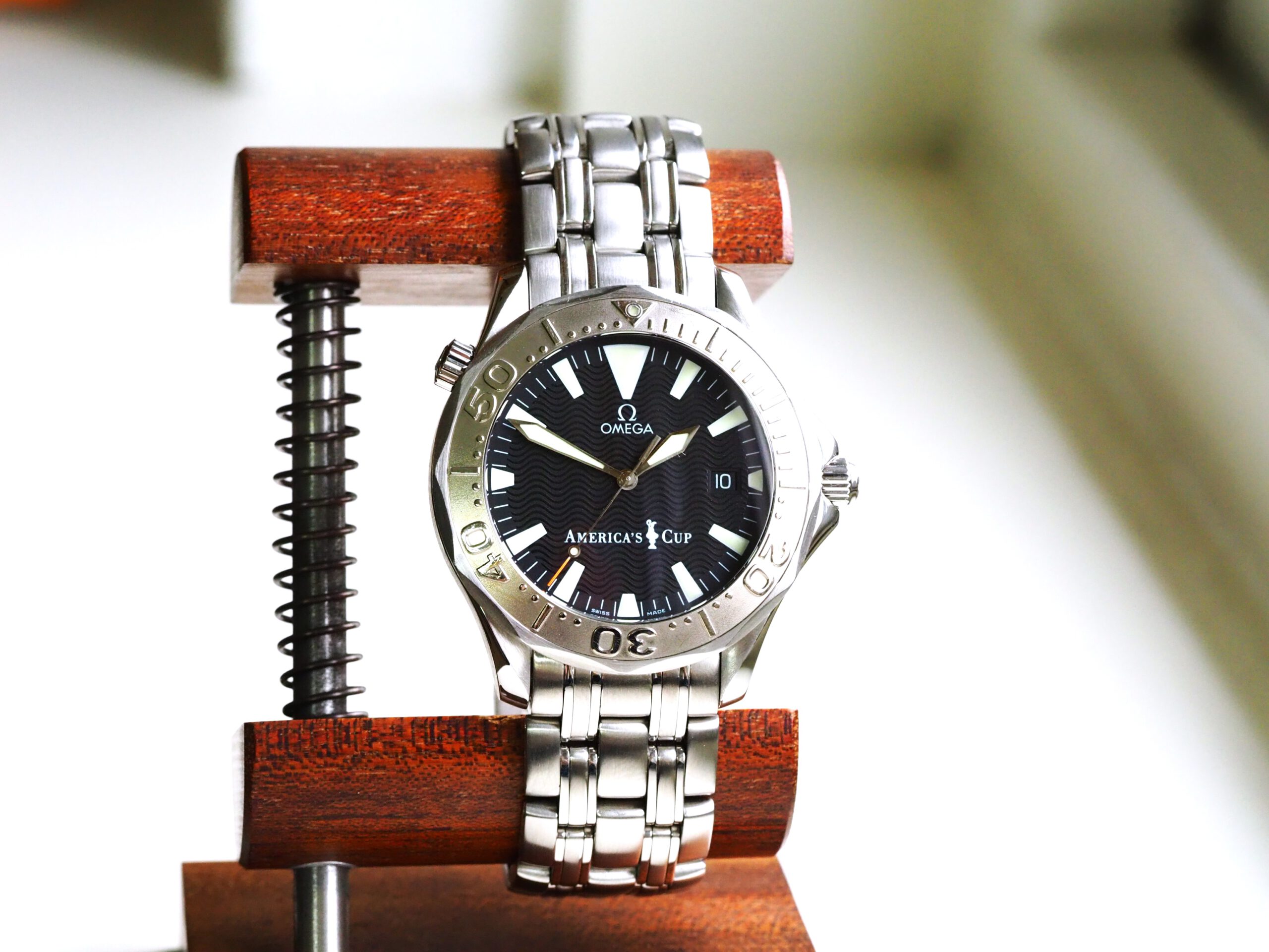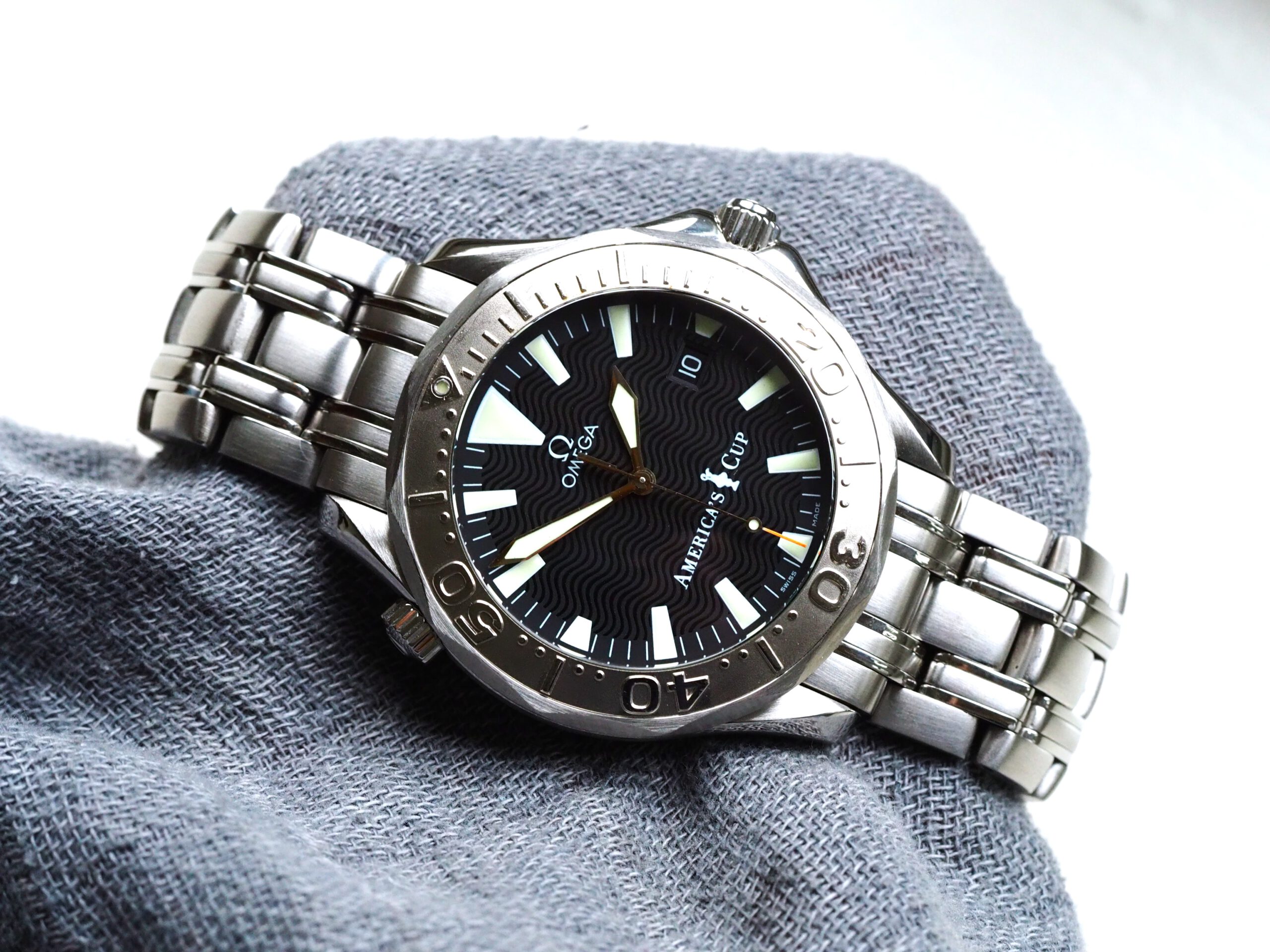 Referentie 2533.50.00 Omega Seamaster America’s Cup Limited Edition, serienummer 80025878 geproduceerd in 2000. Prachtige stalen Seamaster 300m chronometer in fantastische conditie met witgouden bezel inleg. Het horloge is recent volledig geserviced door een Omega gecertificeerd service center en komt met een 2 jaar garantie. Het uurwerk is volledig geserviced, de waterdichtheid is hersteld (alle pakkingen vervangen) en de kast en band zijn opnieuw opgemaakt. De kosten van deze service bedroegen € 750, factuur wordt bij het horloge geleverd. Het horloge wordt geleverd met de originele doos, papieren, certificaat etc. die bij deze America’s Cup editie horen. Daarnaast wordt een Omega service box en de tijdens de service vervangen onderdelen meegeleverd. De staat van het leer van de originele doos en kaarthouder is, zoals bij de meeste Omega dozen uit deze periode, vrij slecht. De band heeft een goede lengte, geschikt voor een polsomtrek van ongeveer 18,5 cm. Kastdiameter 41mm zonder kroon.