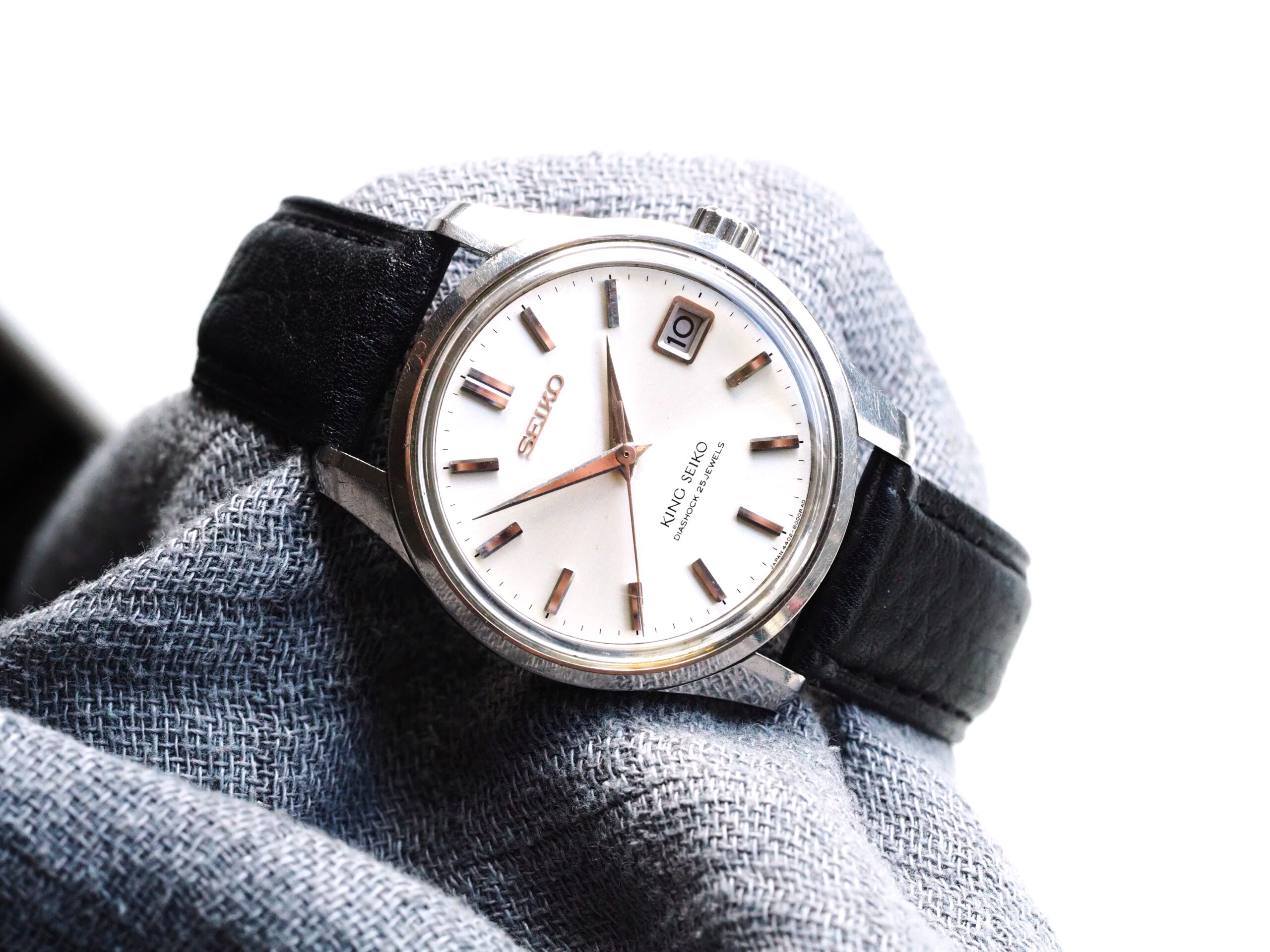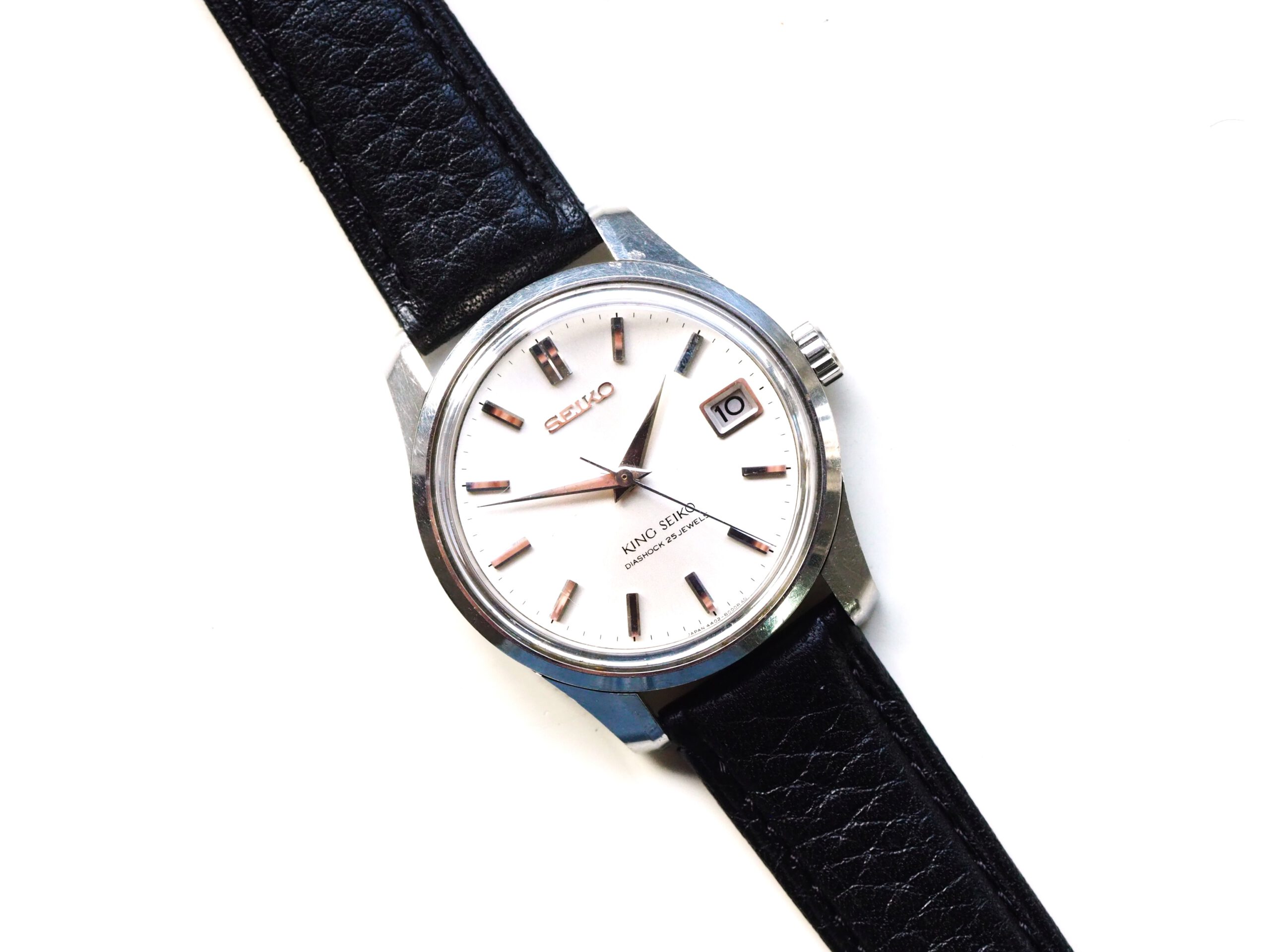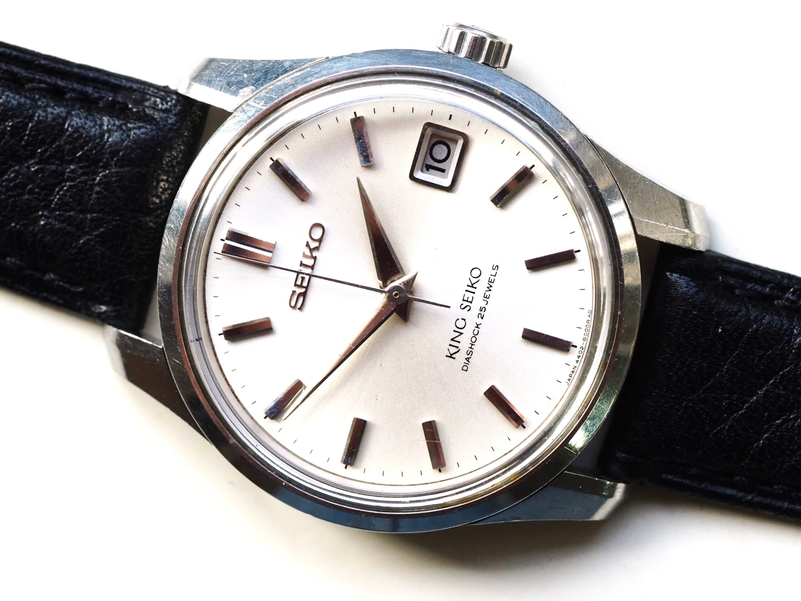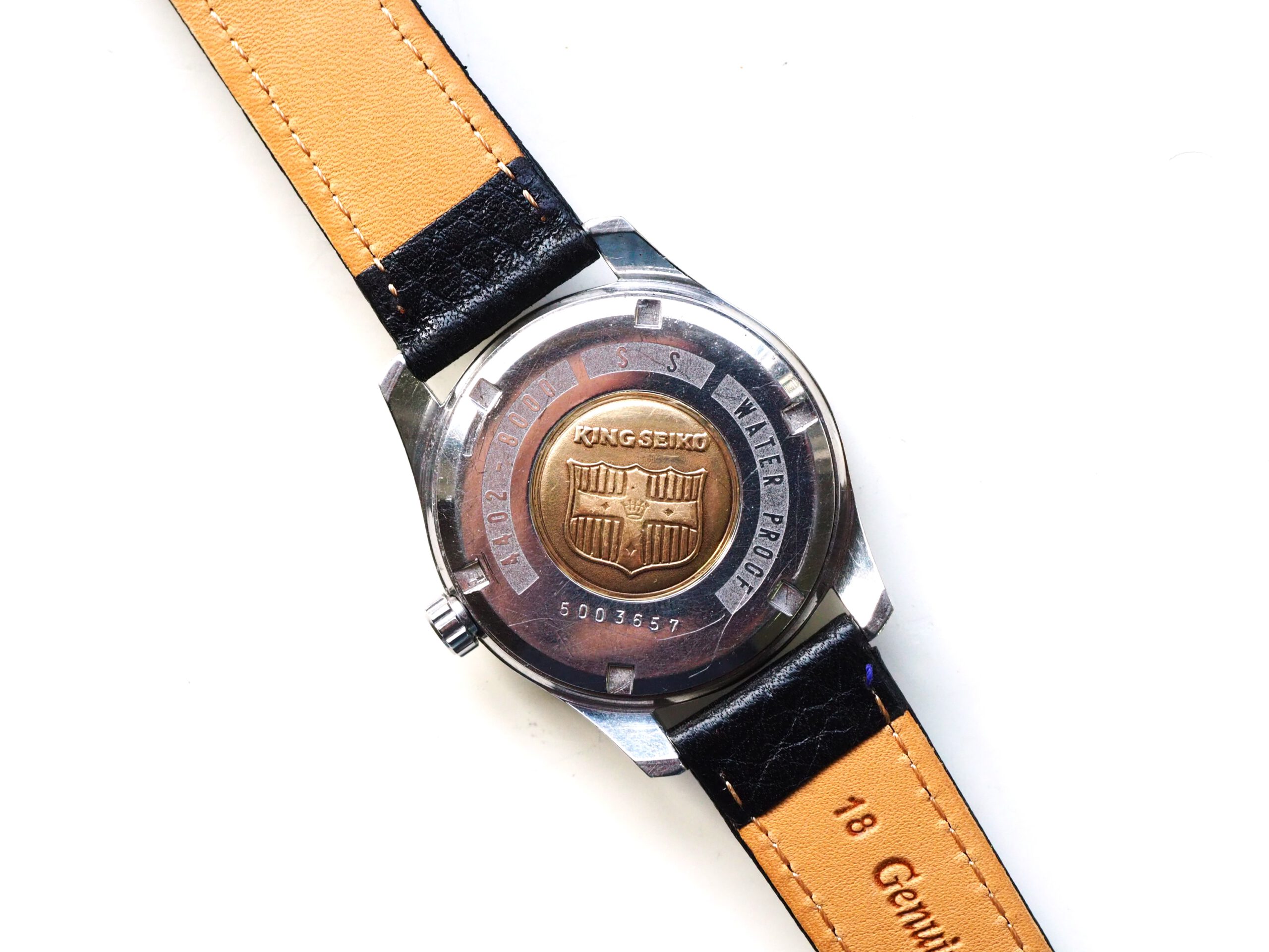Referentie 4402-8000 King Seiko, serienummer 5003657 geproduceerd in oktober 1965. Prachtig roestvrijstalen horloge in zeer goede originele staat en met volledig geserviced uurwerk. Een nagenoeg perfecte wijzerplaat zoals bij dit horloge is vrij zeldzaam voor deze modellen. Ze vertonen vaak defecten zoals zwarte vlekjes aan de rand van de wijzerplaat. Het horloge verkeert in een goede ongepolijste conditie met scherpe lijnen op de kastpoten. In de kast vinden we een Seiko 4402A uurwerk (datum met quick-set en hacking functie) welke net volledig is geserviced (maart 2026) en zeer goed functioneert. Tijdens deze service is de kast ook ultrasoon gereinigd en voorzien van een nieuwe zwarte leren band. Kortom een prachtig horloge in uitstekende staat, klaar voor een nieuwe eigenaar. Kastdiameter 35mm zonder kroon.