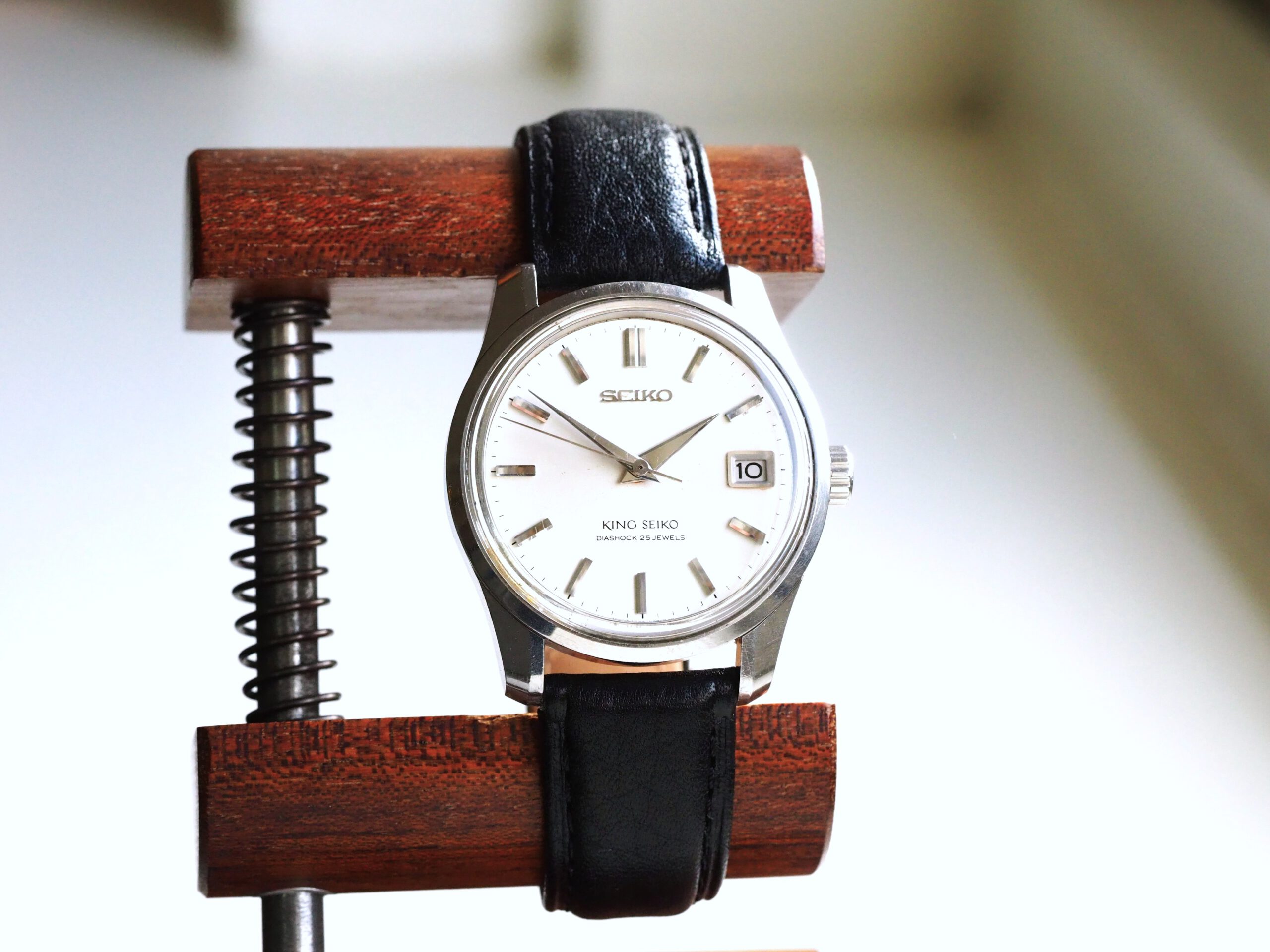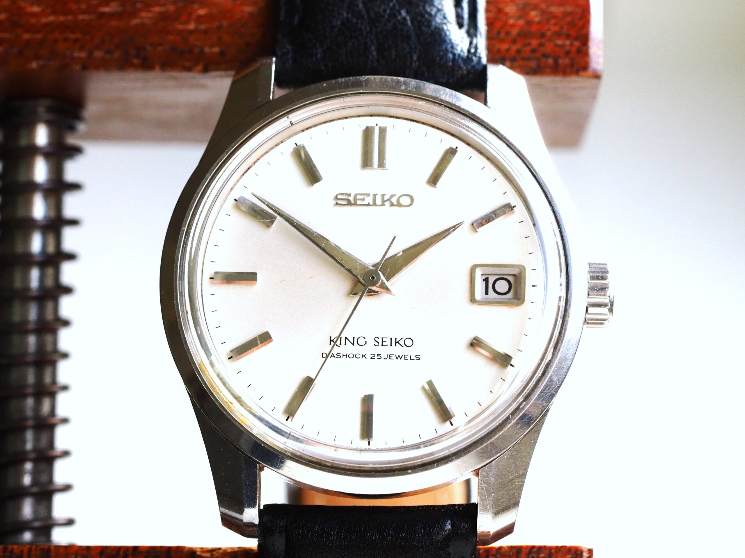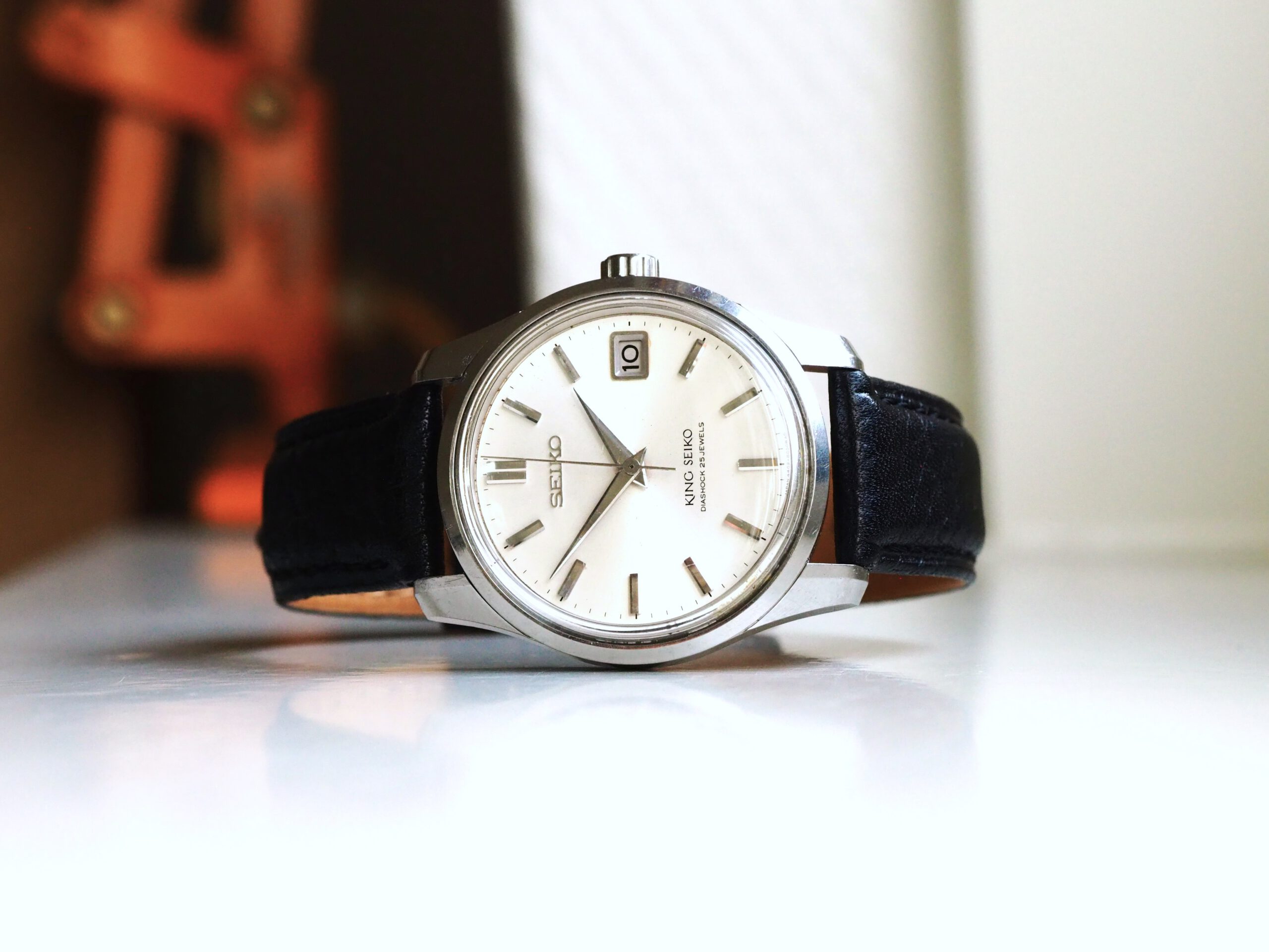 Referentie 4402-8000 King Seiko, serienummer 5003657 geproduceerd in oktober 1965. Prachtig roestvrijstalen horloge in zeer goede originele staat en met volledig geserviced uurwerk. Een nagenoeg perfecte wijzerplaat zoals bij dit horloge is vrij zeldzaam voor deze modellen. Ze vertonen vaak defecten zoals zwarte vlekjes aan de rand van de wijzerplaat. Het horloge verkeert in een goede ongepolijste conditie met scherpe lijnen op de kastpoten. In de kast vinden we een Seiko 4402A uurwerk (datum met quick-set en hacking functie) welke net volledig is geserviced (maart 2026) en zeer goed functioneert. Tijdens deze service is de kast ook ultrasoon gereinigd en voorzien van een nieuwe zwarte leren band. Kortom een prachtig horloge in uitstekende staat, klaar voor een nieuwe eigenaar. Kastdiameter 35mm zonder kroon.