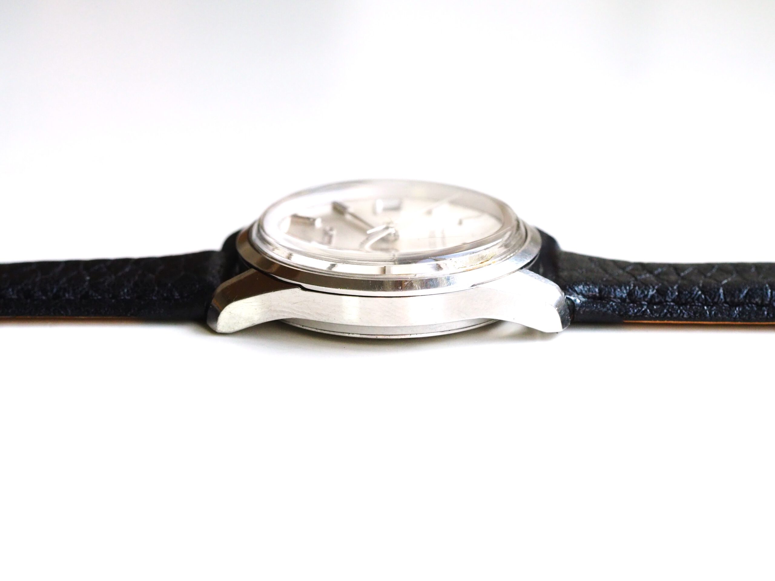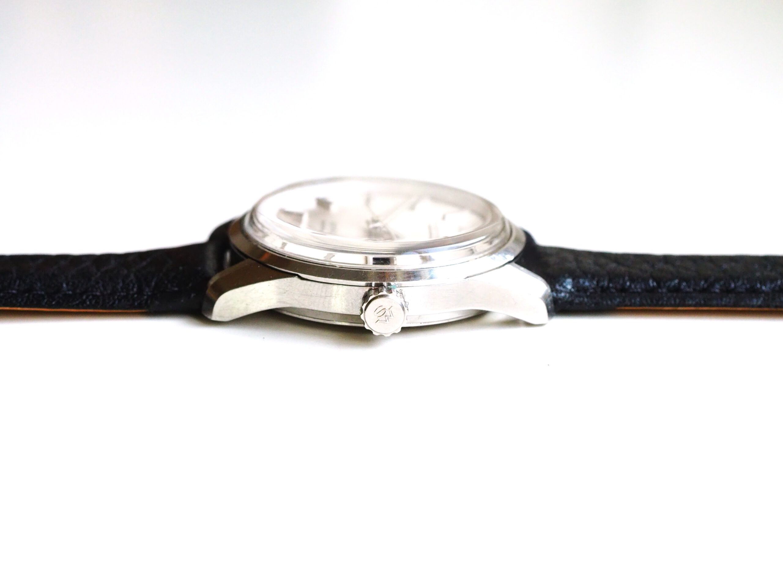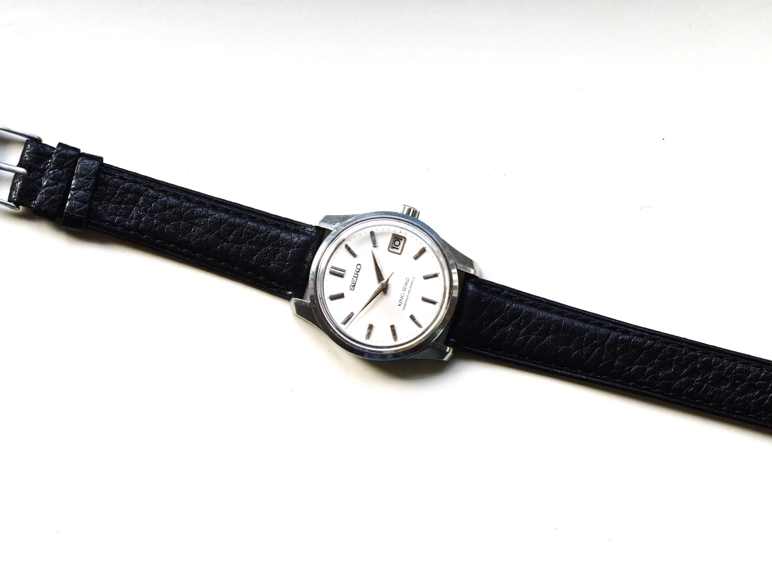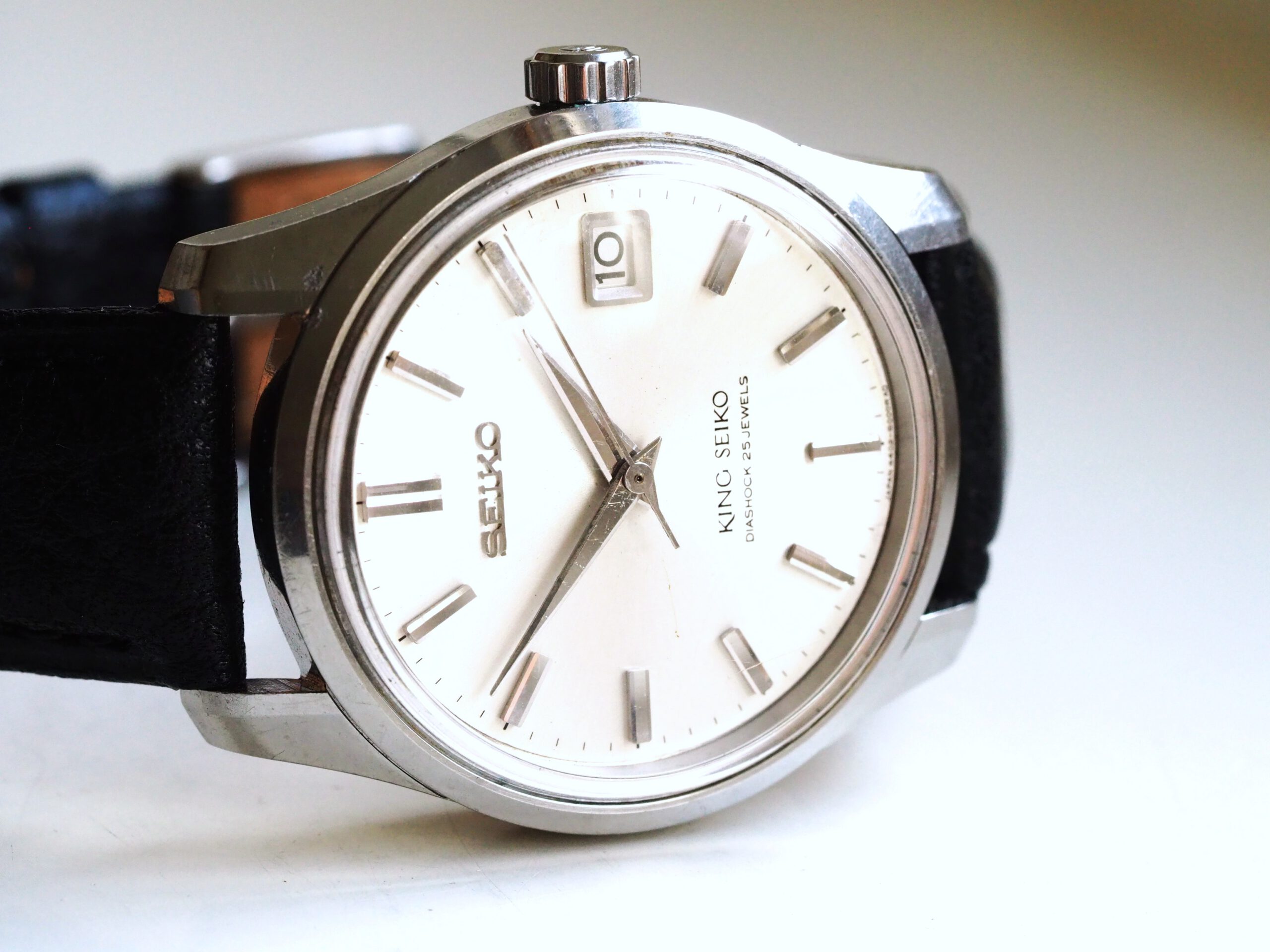 Referentie 4402-8000 King Seiko, serienummer 5003657 geproduceerd in oktober 1965. Prachtig roestvrijstalen horloge in zeer goede originele staat en met volledig geserviced uurwerk. Een nagenoeg perfecte wijzerplaat zoals bij dit horloge is vrij zeldzaam voor deze modellen. Ze vertonen vaak defecten zoals zwarte vlekjes aan de rand van de wijzerplaat. Het horloge verkeert in een goede ongepolijste conditie met scherpe lijnen op de kastpoten. In de kast vinden we een Seiko 4402A uurwerk (datum met quick-set en hacking functie) welke net volledig is geserviced (maart 2026) en zeer goed functioneert. Tijdens deze service is de kast ook ultrasoon gereinigd en voorzien van een nieuwe zwarte leren band. Kortom een prachtig horloge in uitstekende staat, klaar voor een nieuwe eigenaar. Kastdiameter 35mm zonder kroon.
